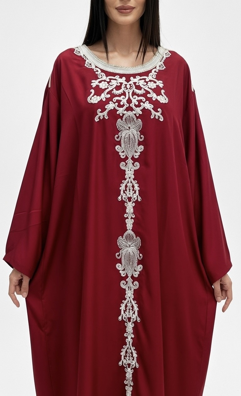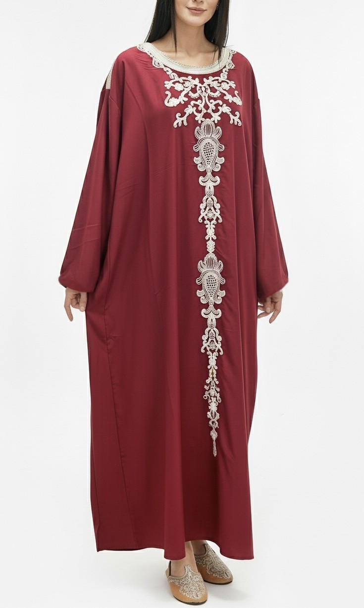 caftan gandoura manches longues, broderies doré cousue sur l'encolure, et le devant de la robe