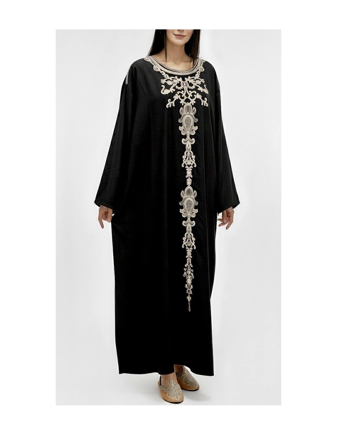 caftan gandoura manches longues, broderies doré cousue sur l'encolure, et le devant de la robe