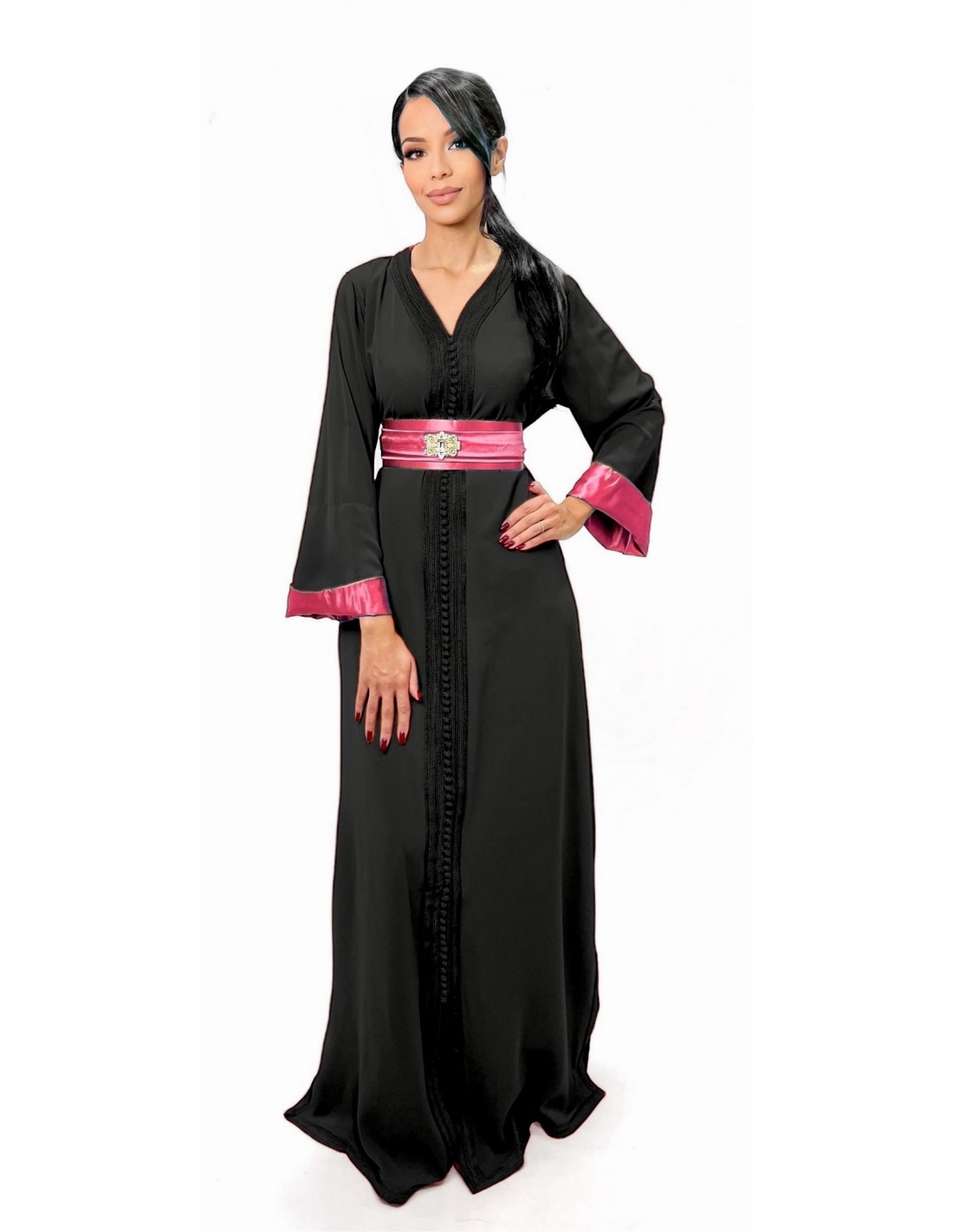 Caftan Robe orientale pas cher noir doublure ceinture rose  - 1