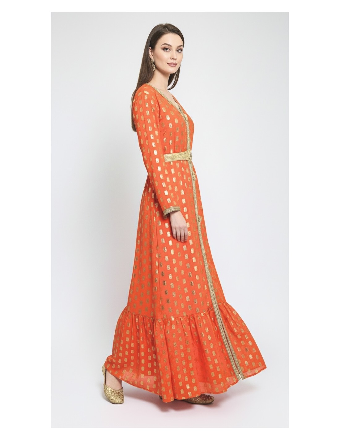 Craquez pour cette magnifique robe longue orange, ornée de motifs Tlija dorés scintillants qui illuminent chaque mouvement. Sa coupe fluide avec des volants au bas de robe rends cette tenue légère et vaporeuse.