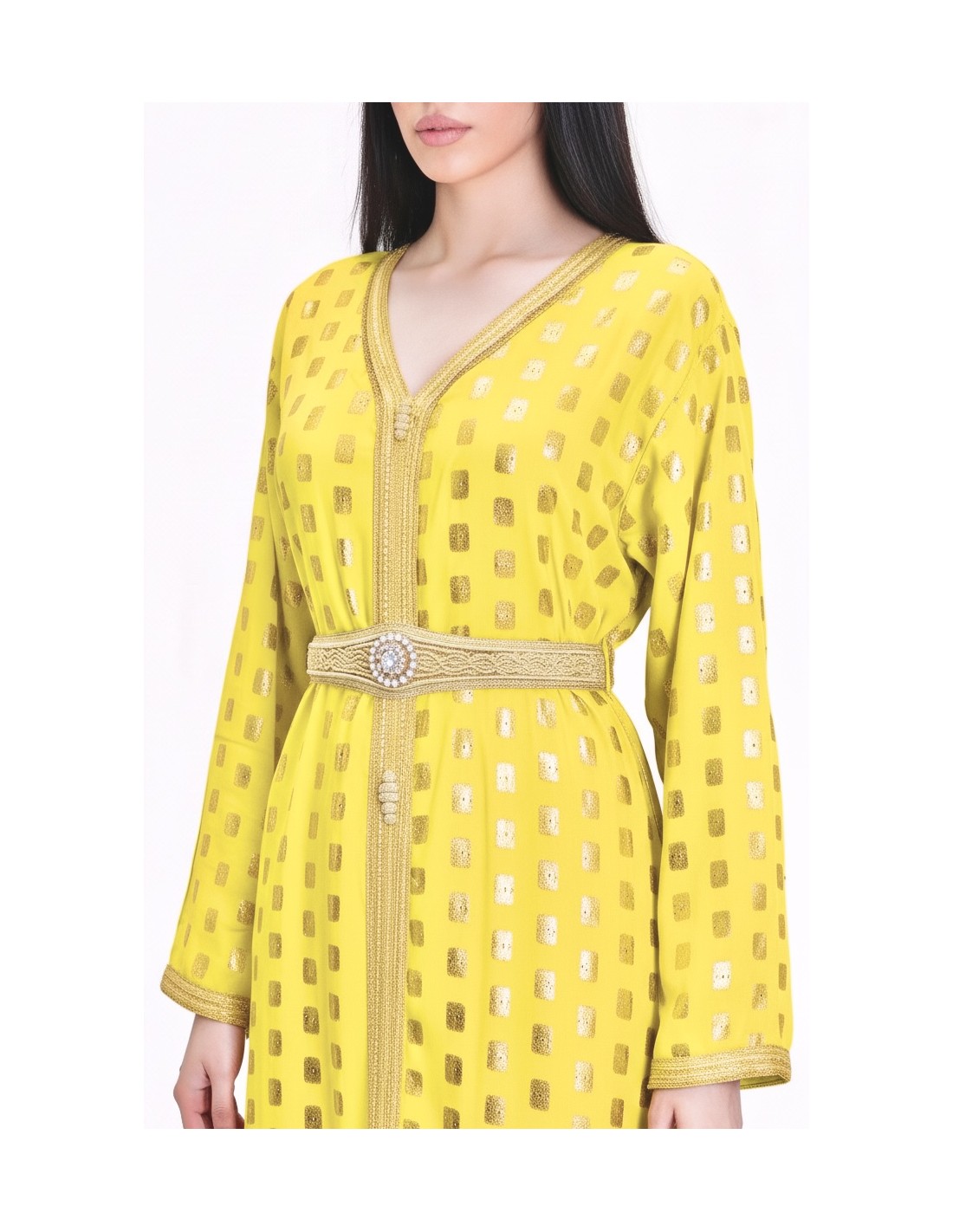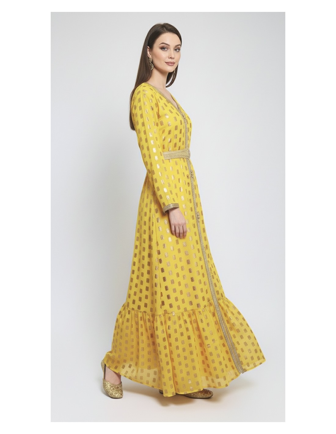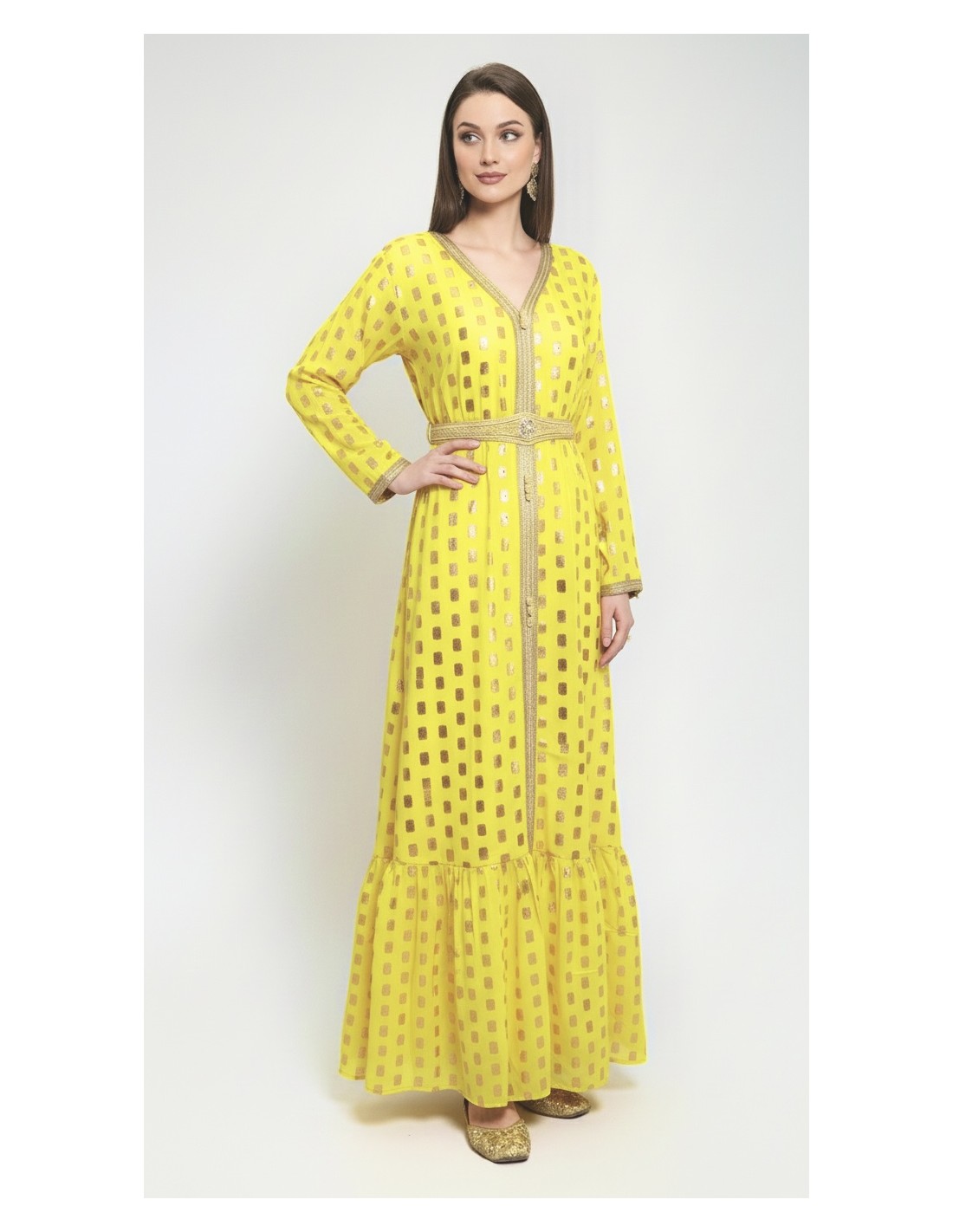Craquez pour cette magnifique robe longue jaune , ornée de motifs Tlija dorés scintillants qui illuminent chaque mouvement. Sa coupe fluide avec des volants au bas de robe rends cette tenue légère et vaporeuse.