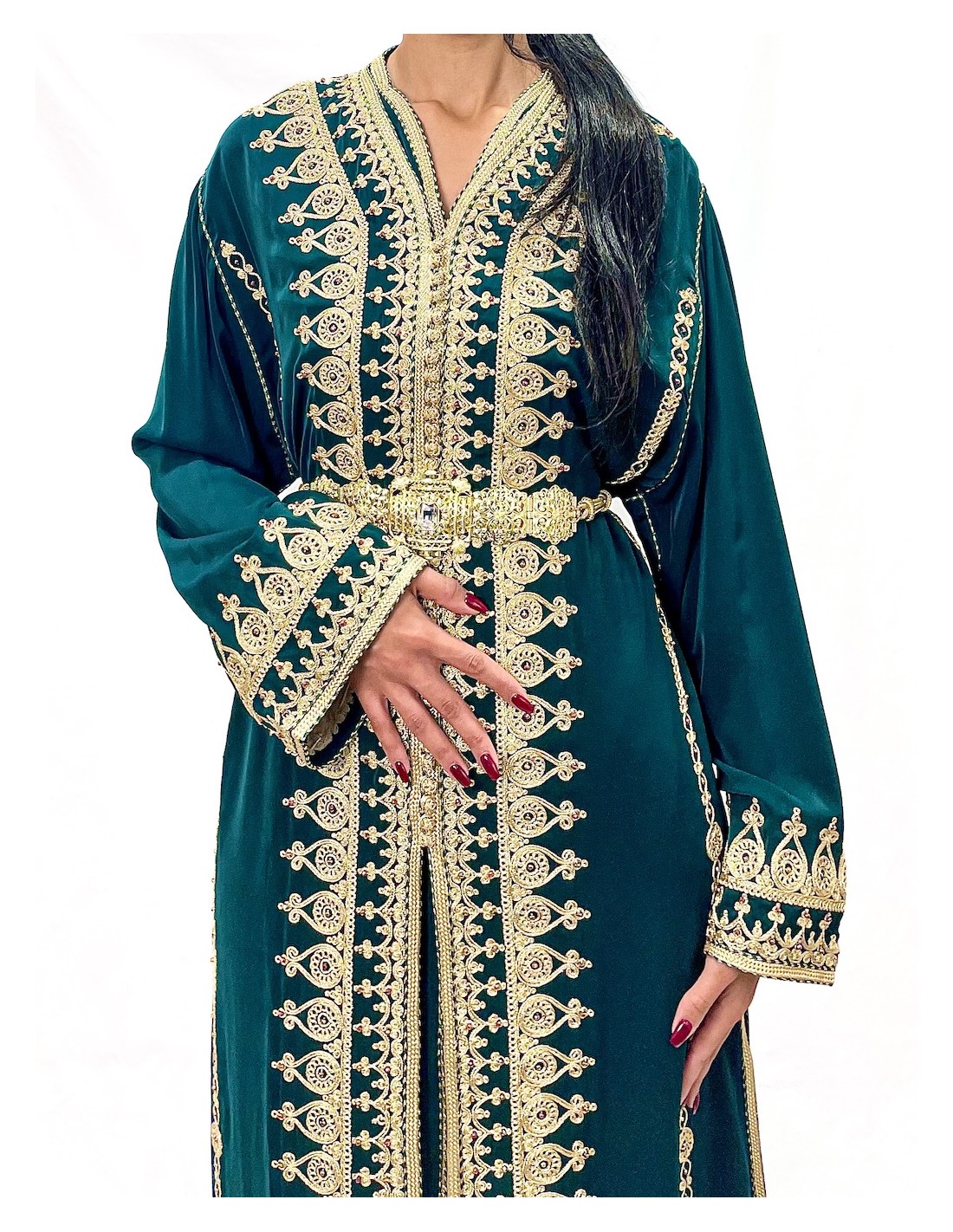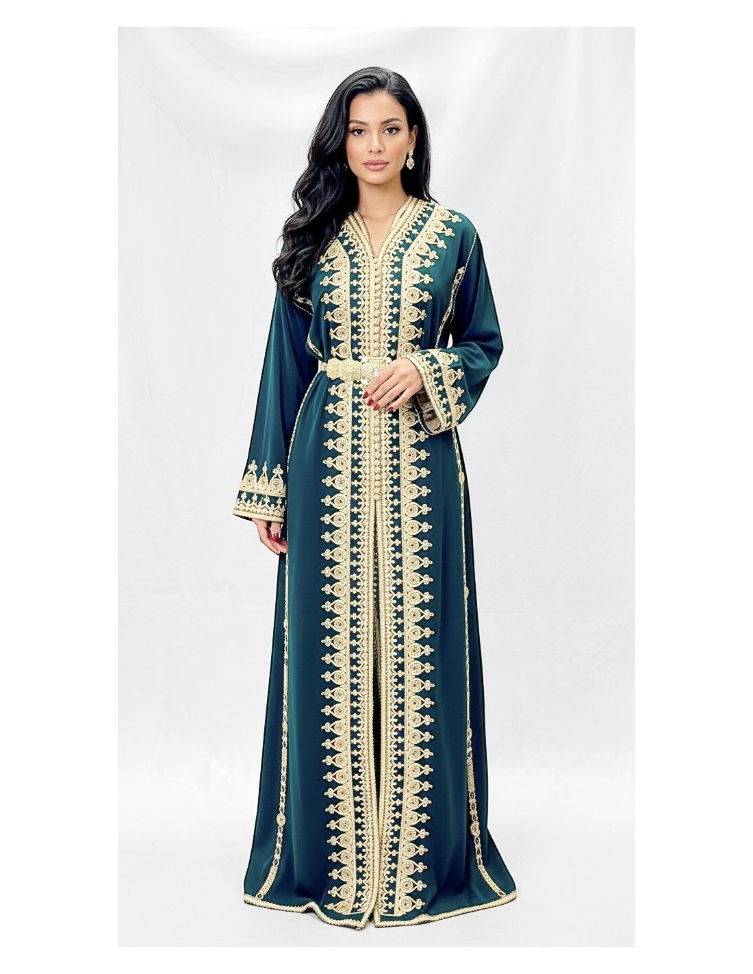 Caftan Marocain Luxe vert 2 Pièces – Broderies Dorées & Ceinture Incluse