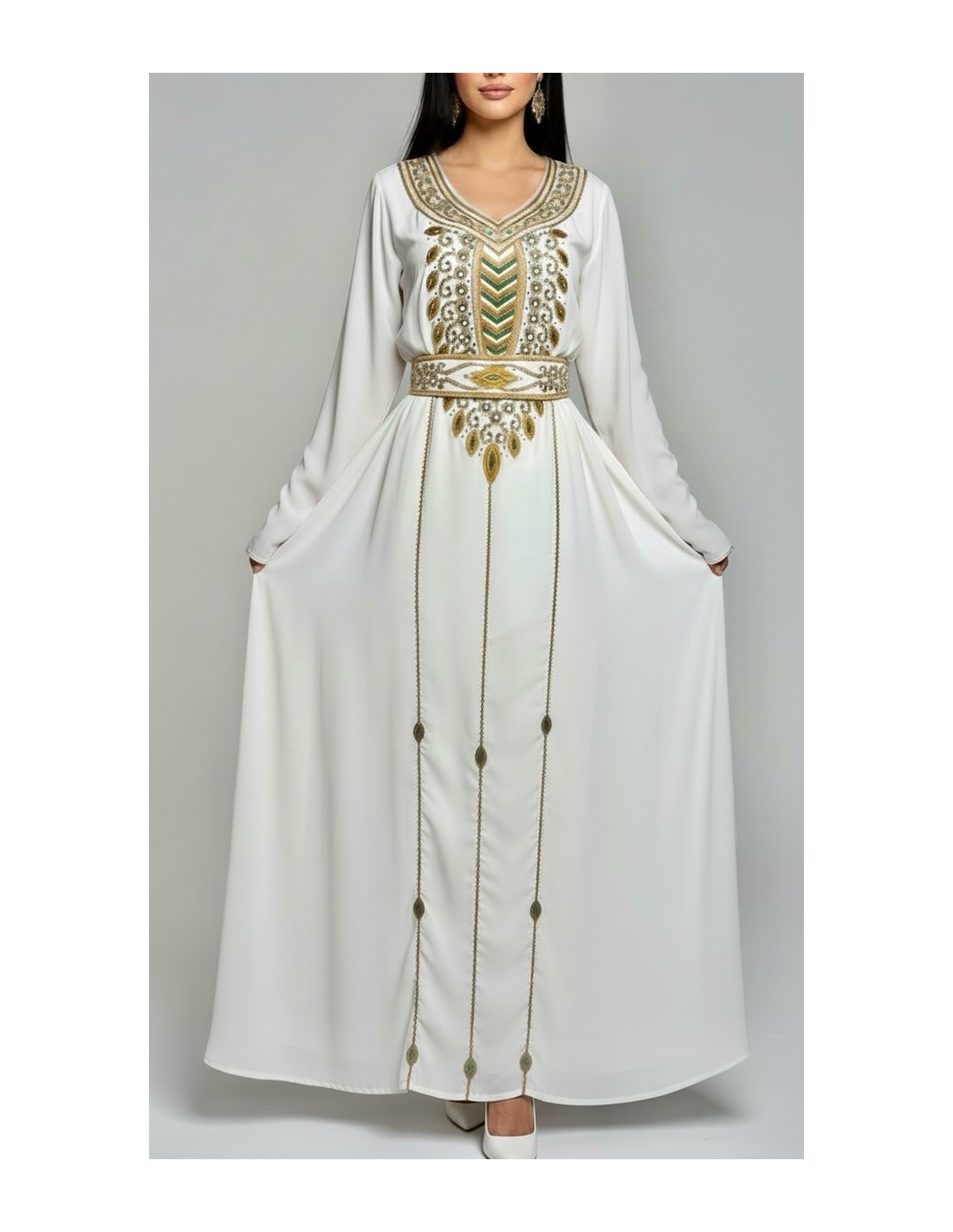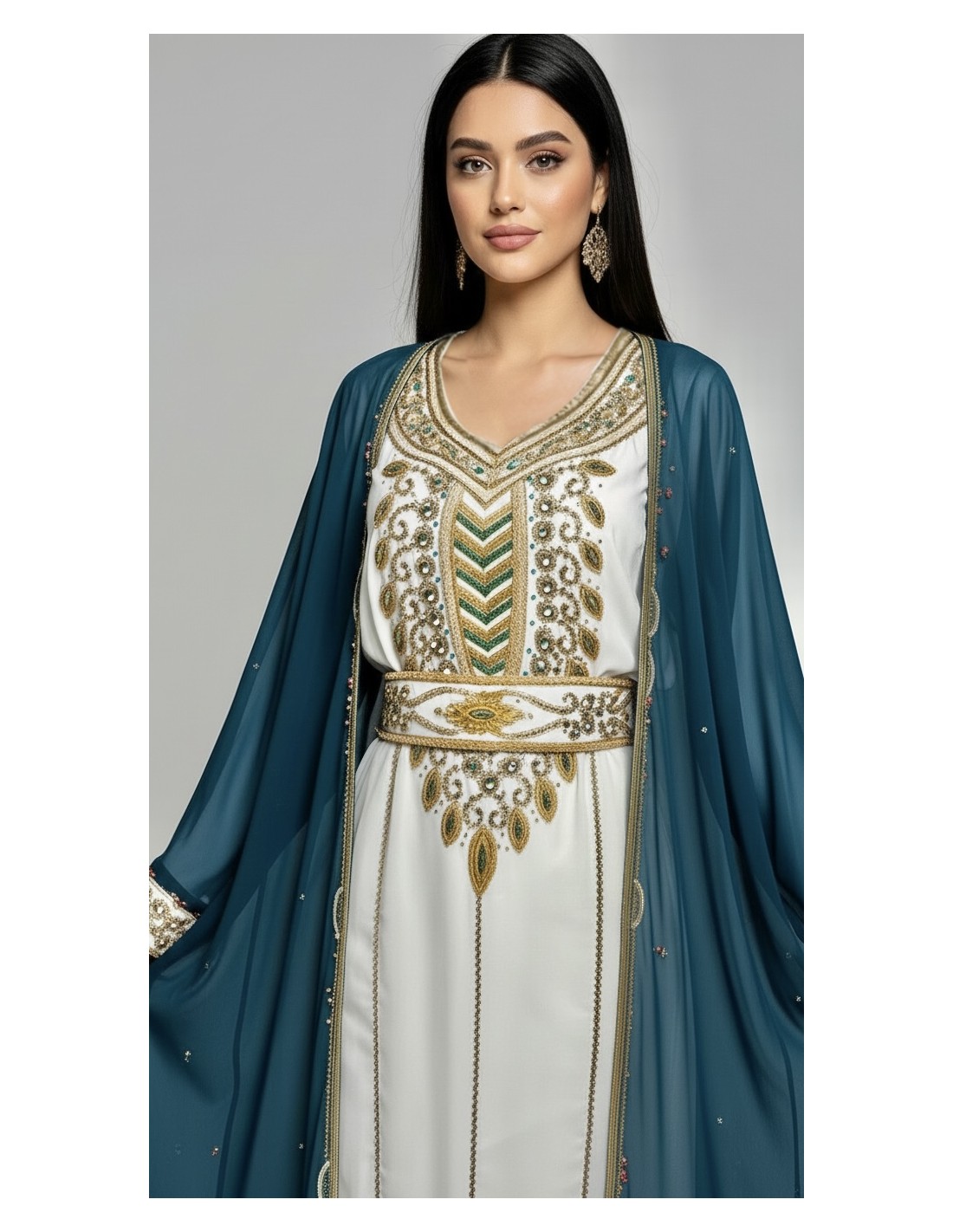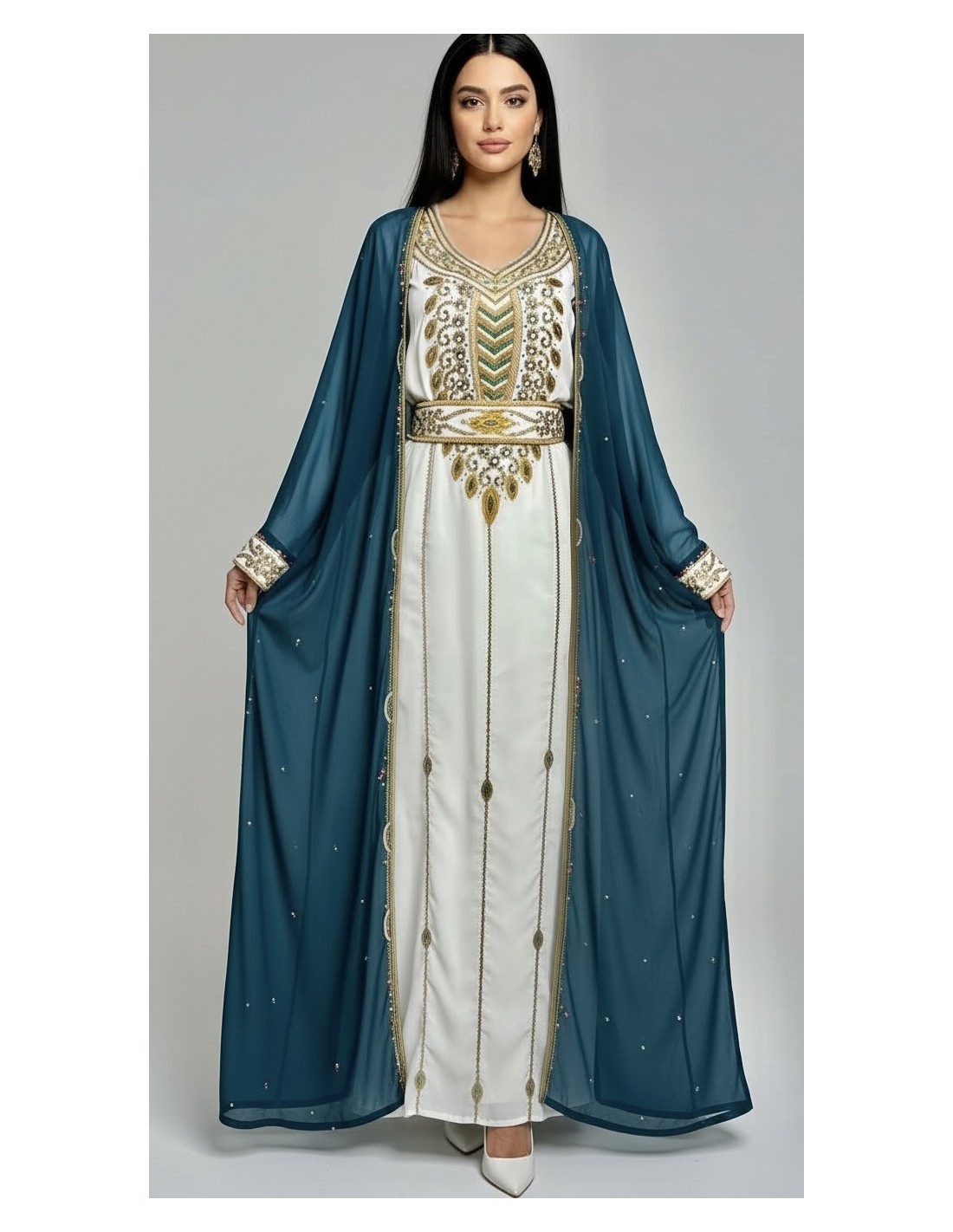 Sublime farasha style Dubaï 2 pièces, composée d’une robe blanche, ceinturé,perlée et d’un long gilet farasha manches papillons bleu canard délicatement orné de perles.