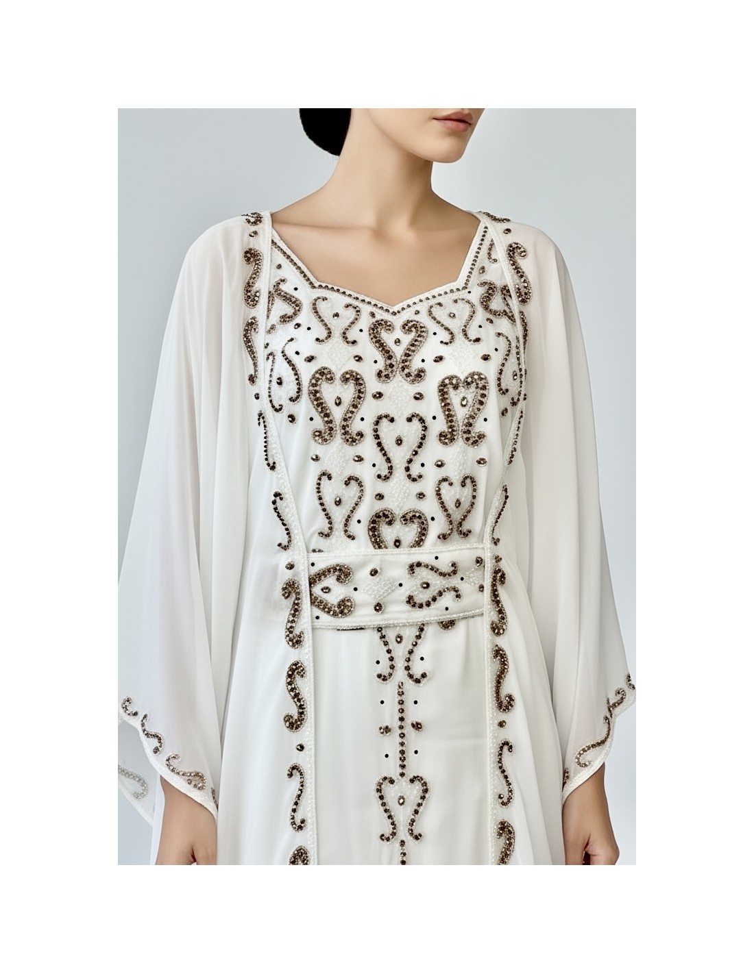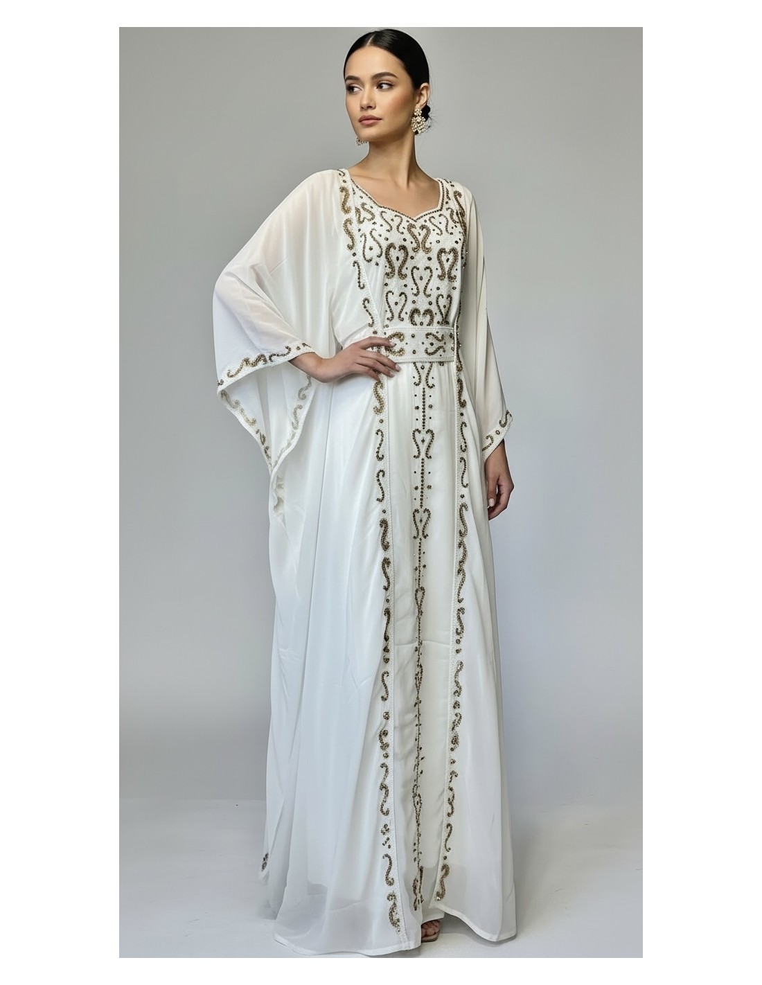 Sublimez vos occasions avec cette farasha Dubaï 2pcs blanche, une robe orientale élégante aux broderies raffinées et sa cape manches papillons perles scintillantes. Sa coupe papillon fluide, son tissu léger et sa ceinture assortie mettent en valeur la silhouette tout en offrant un confort optimal.