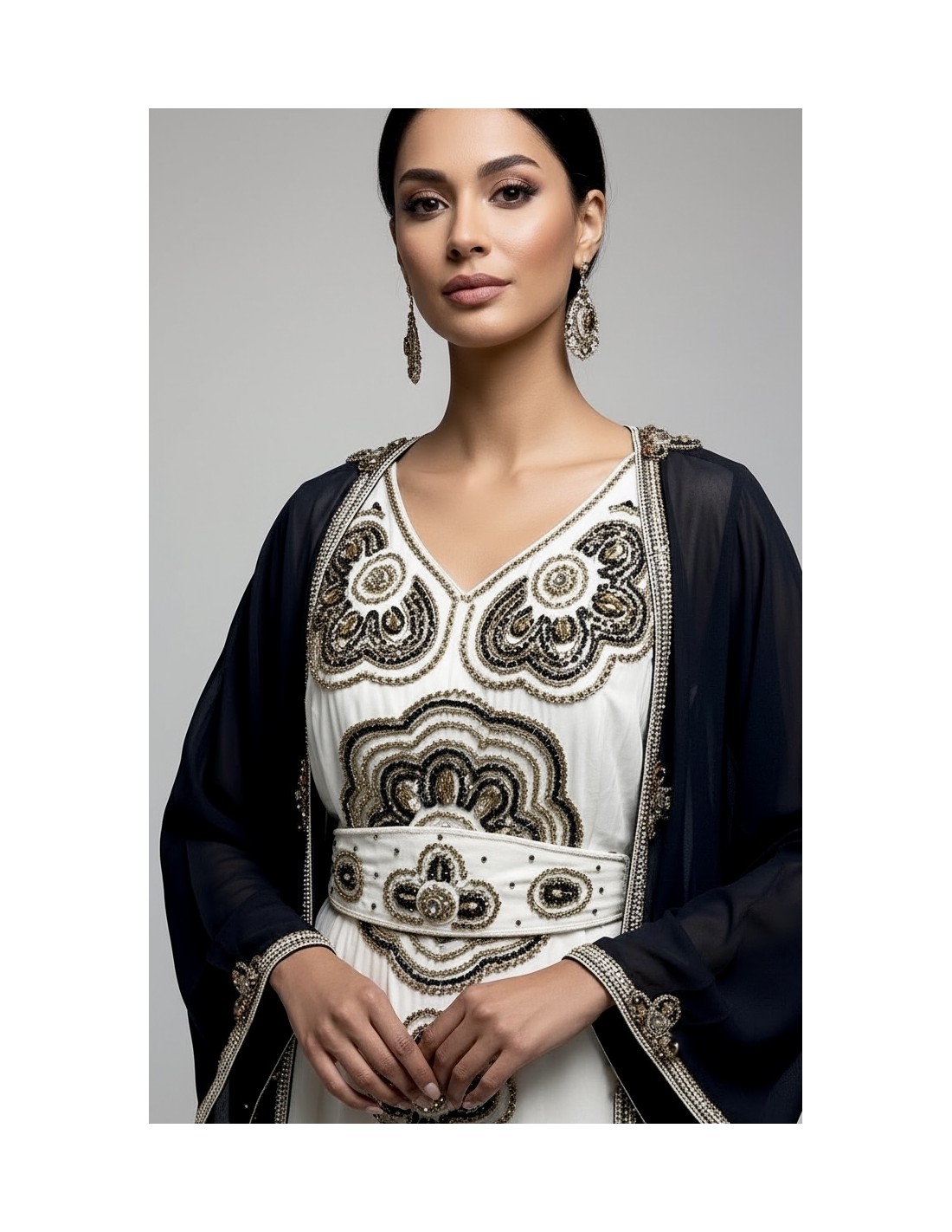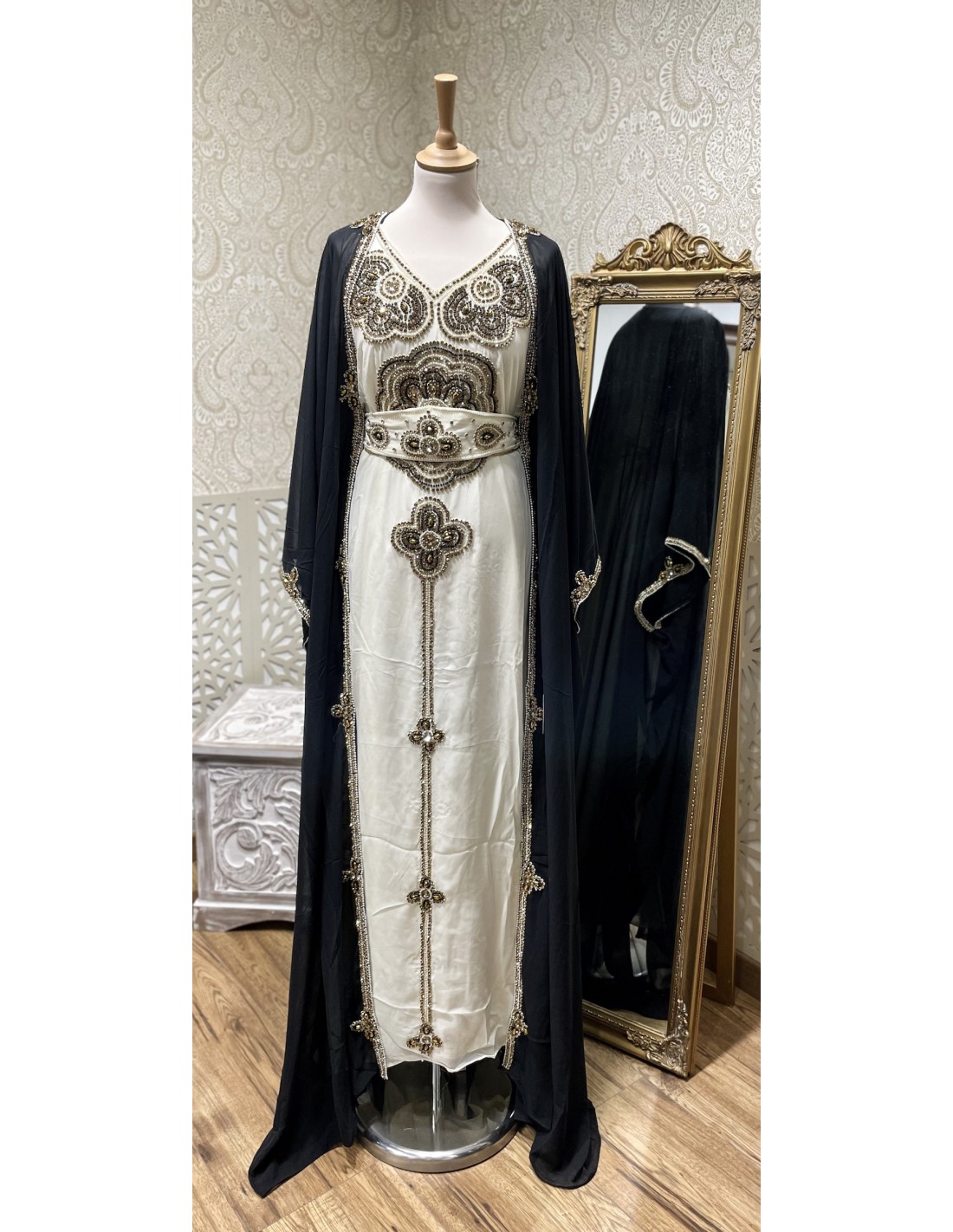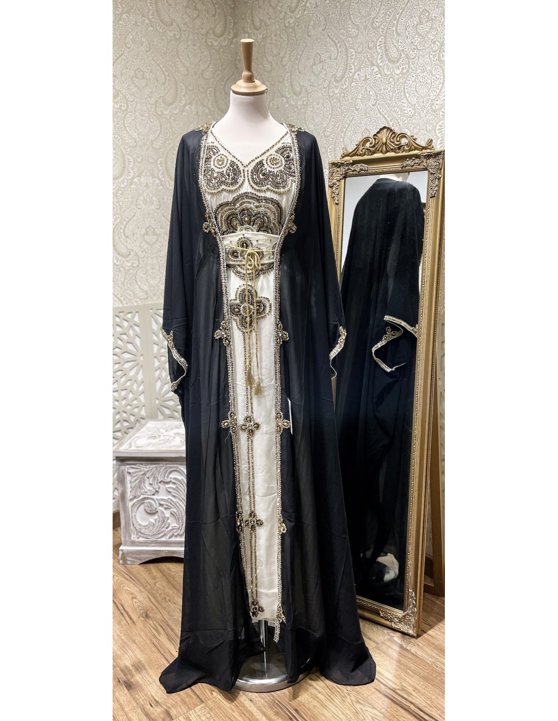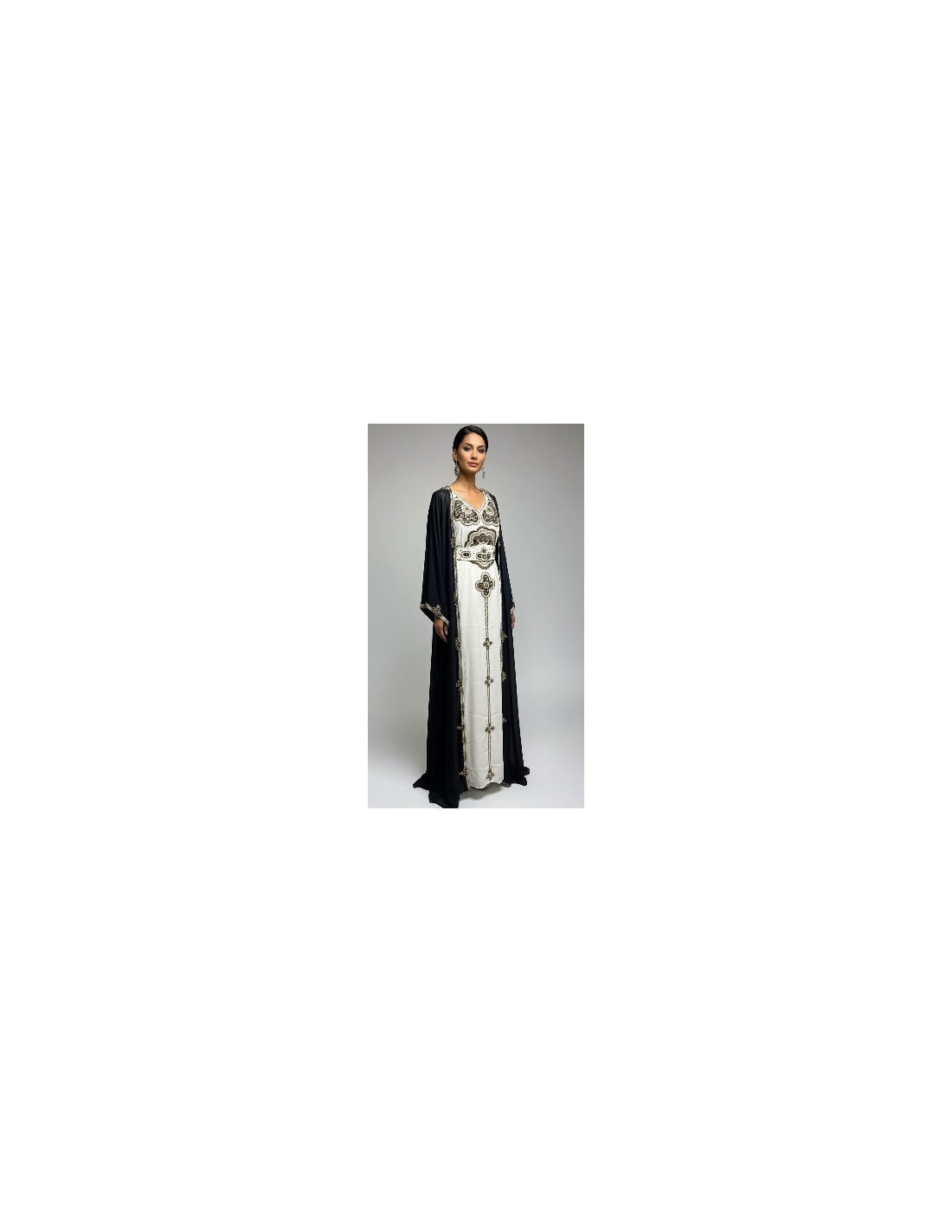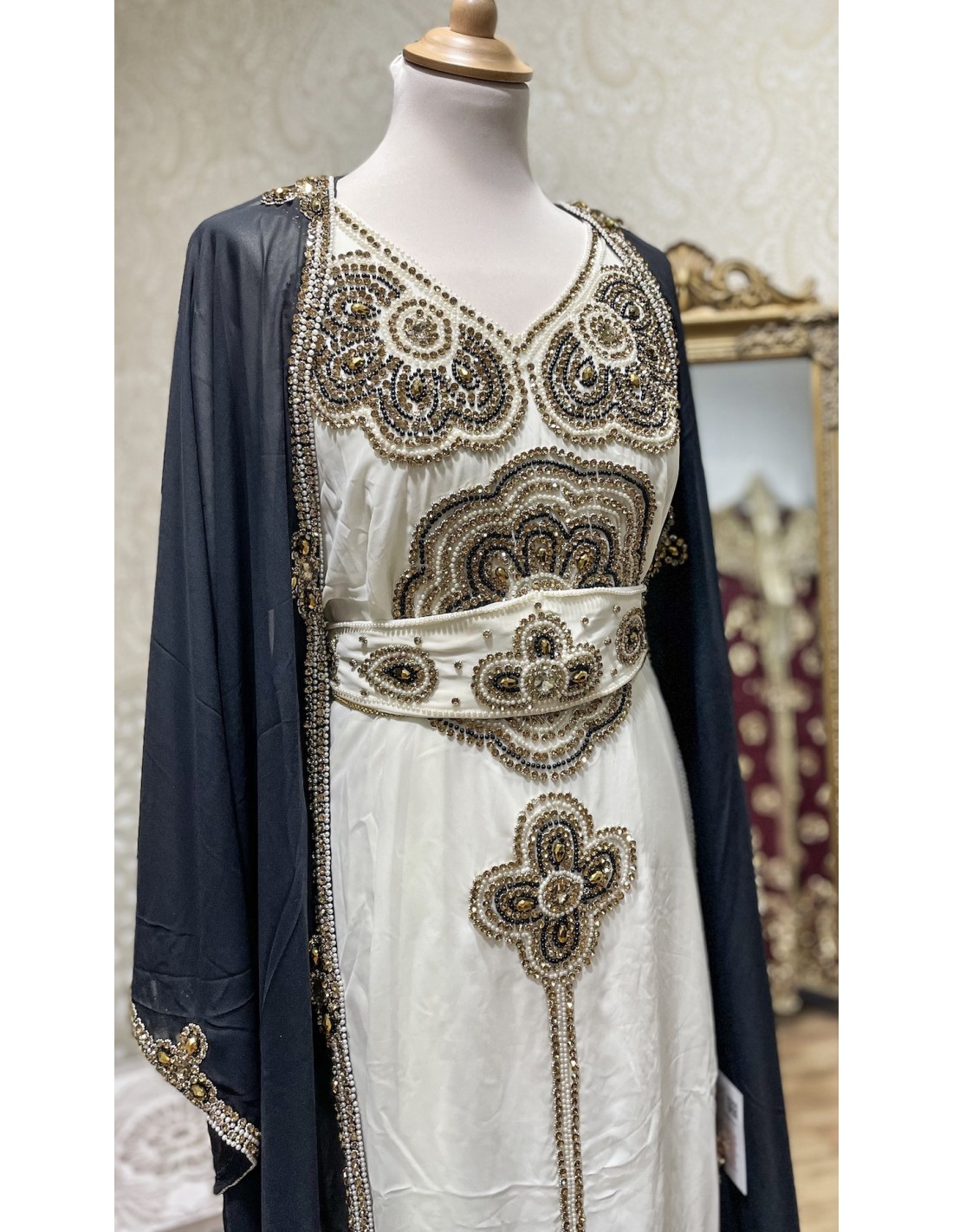 une robe manches longue en voile(type mousseline) doublée, ornée de pierres et de strass dorés et noir,