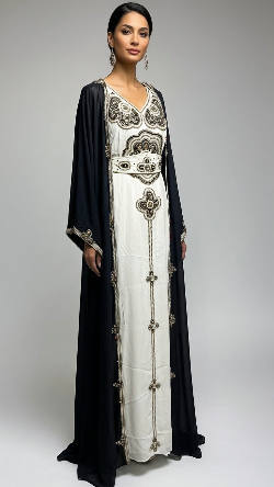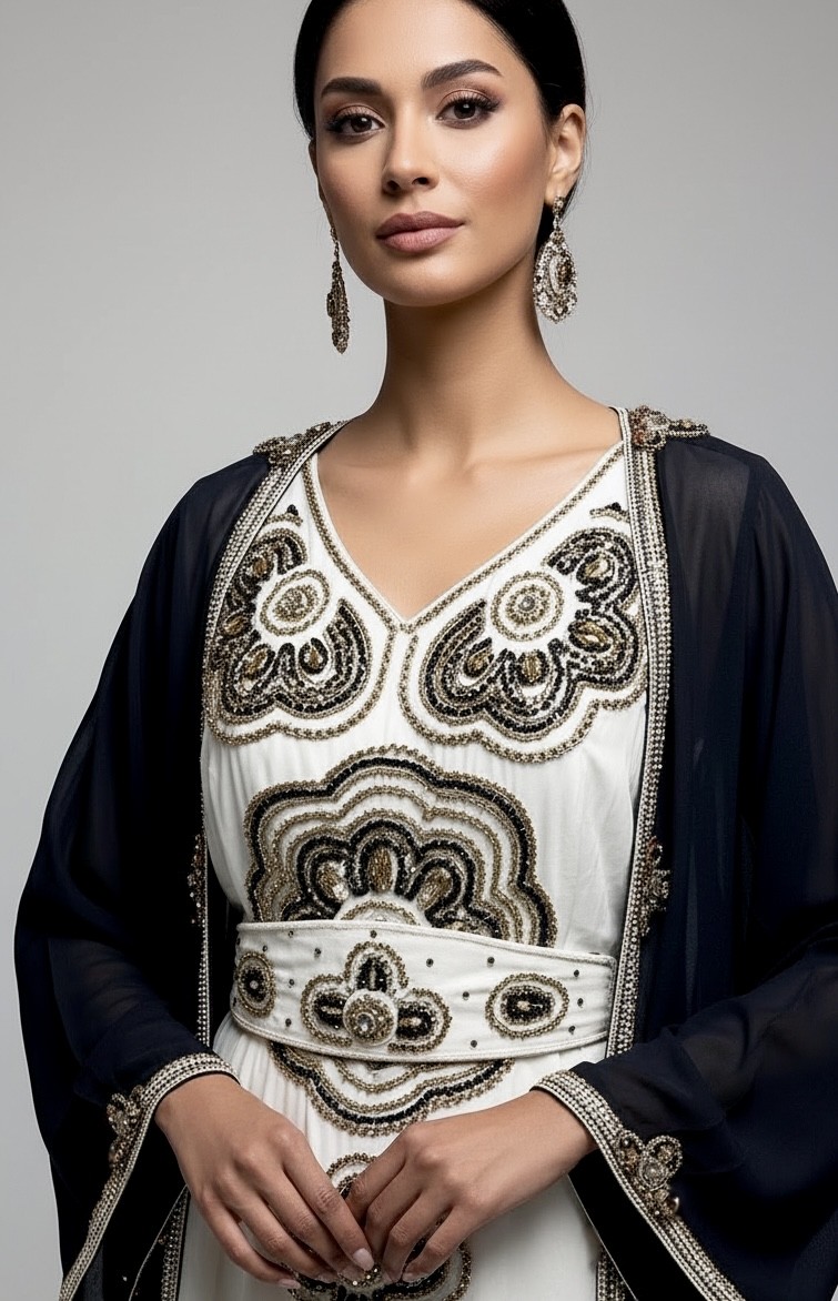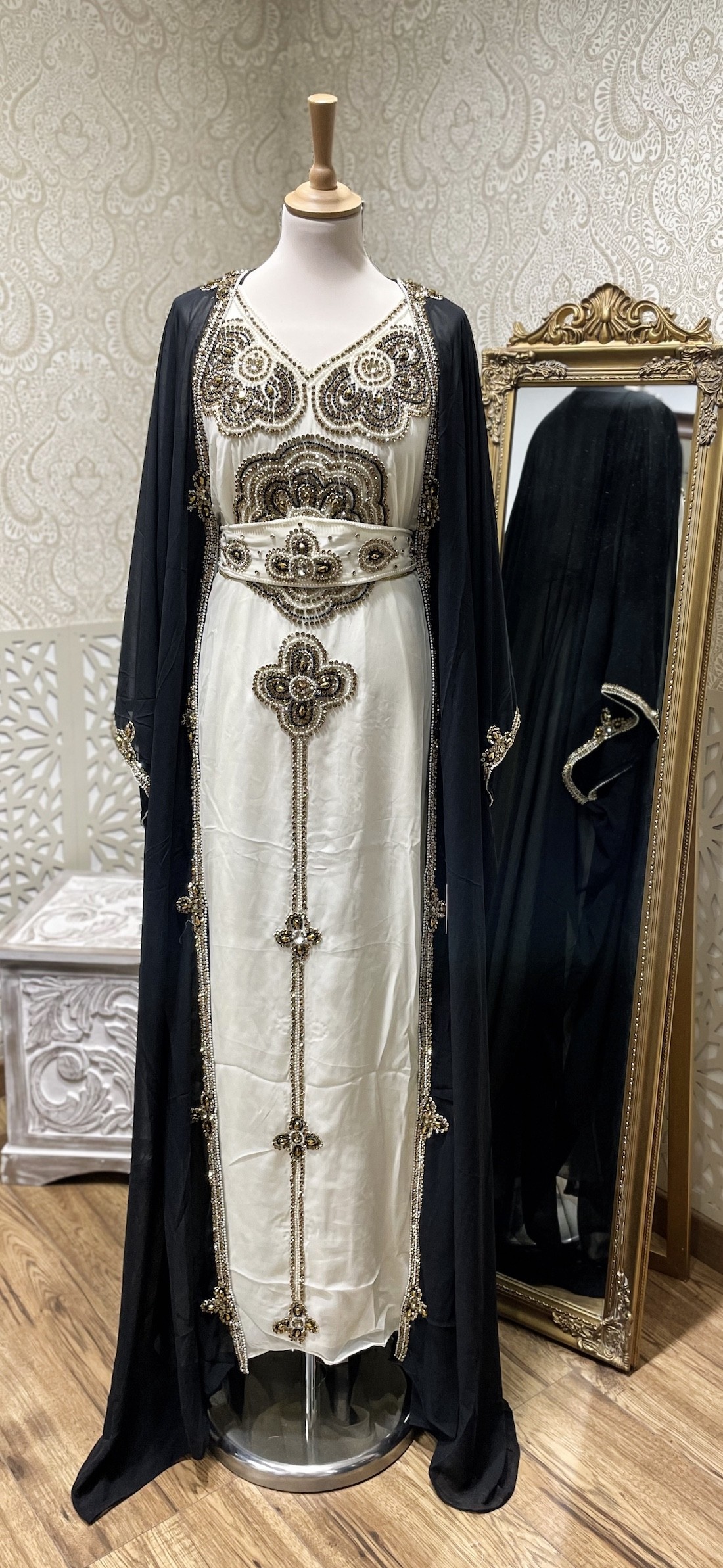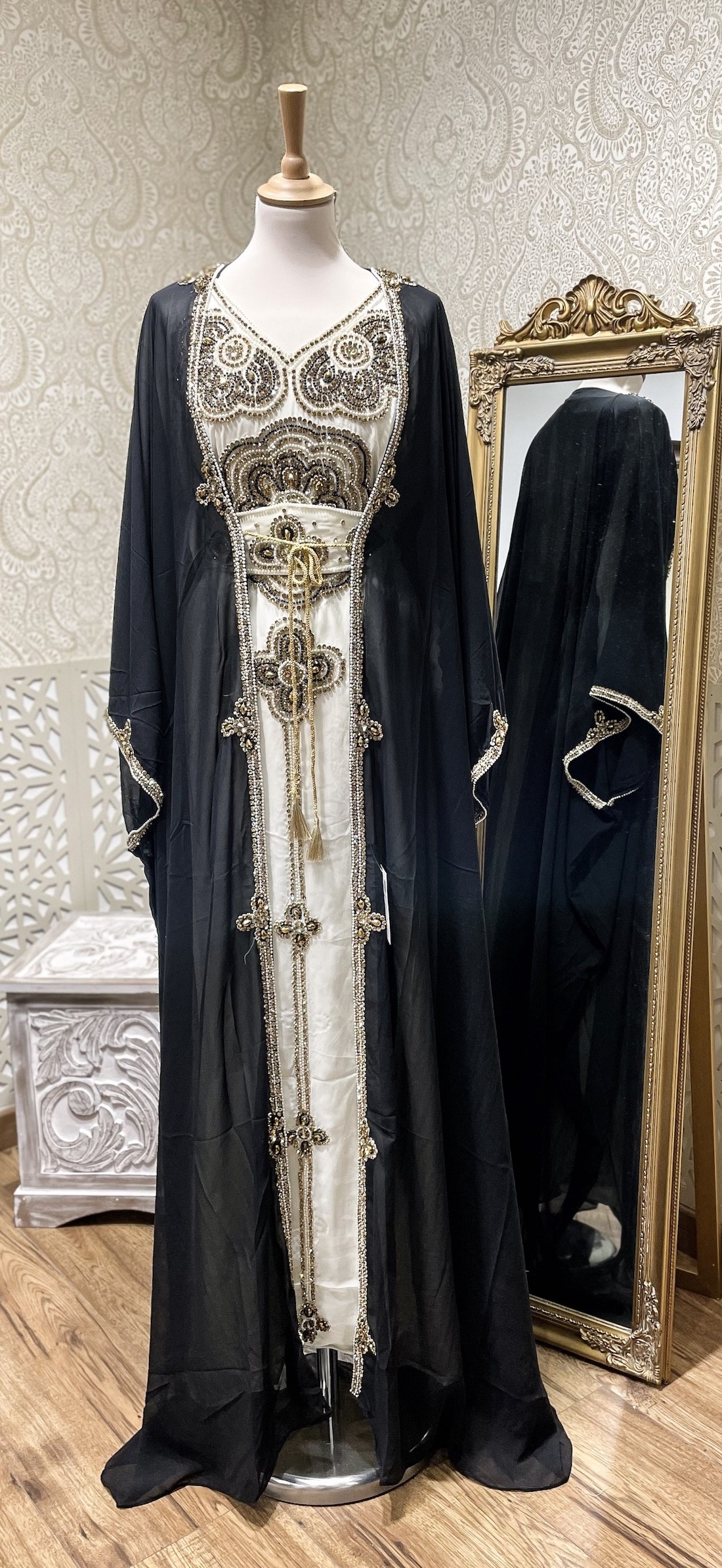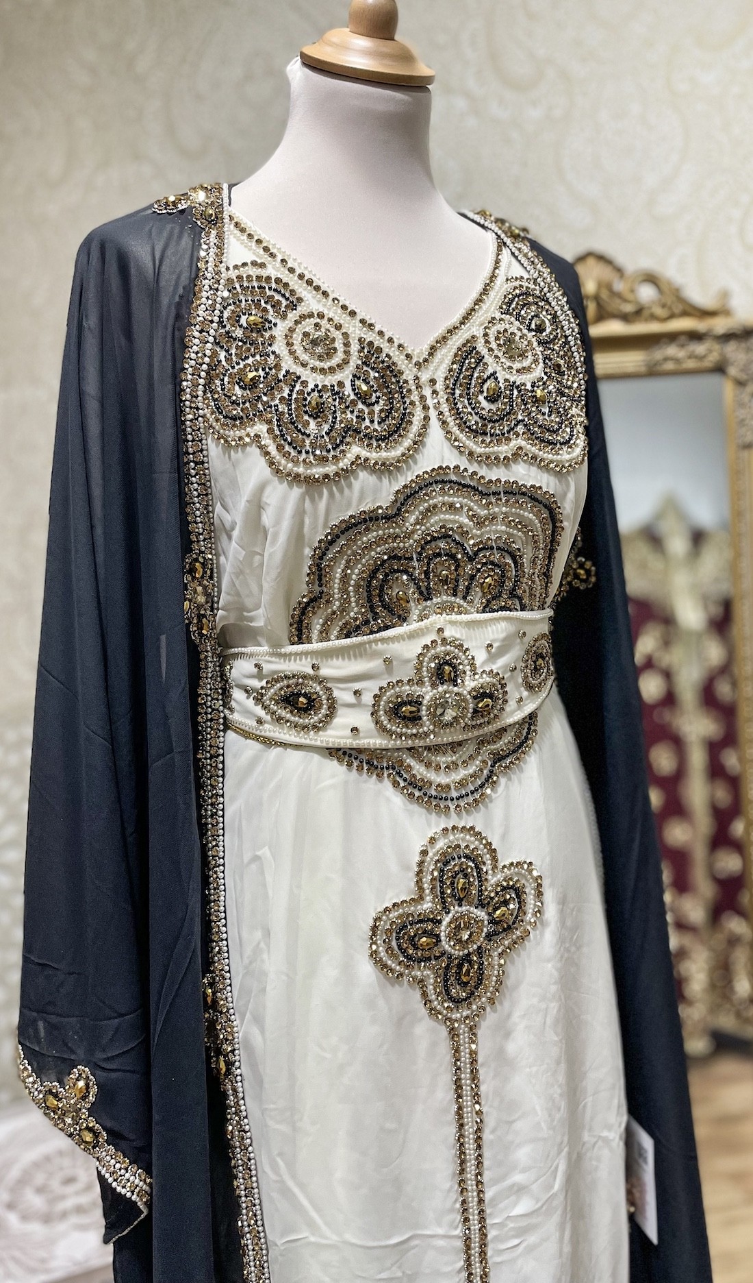 ensemble orientale caftan, avec cape manches papillons, cousus de strass argentés et perles bleu vert. une tenue d'exception pour vos soirée orientale, mariage, et grands événements!