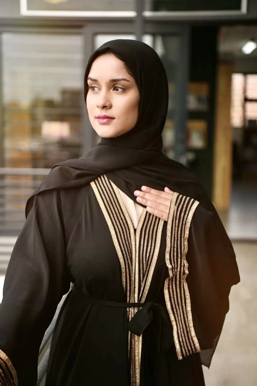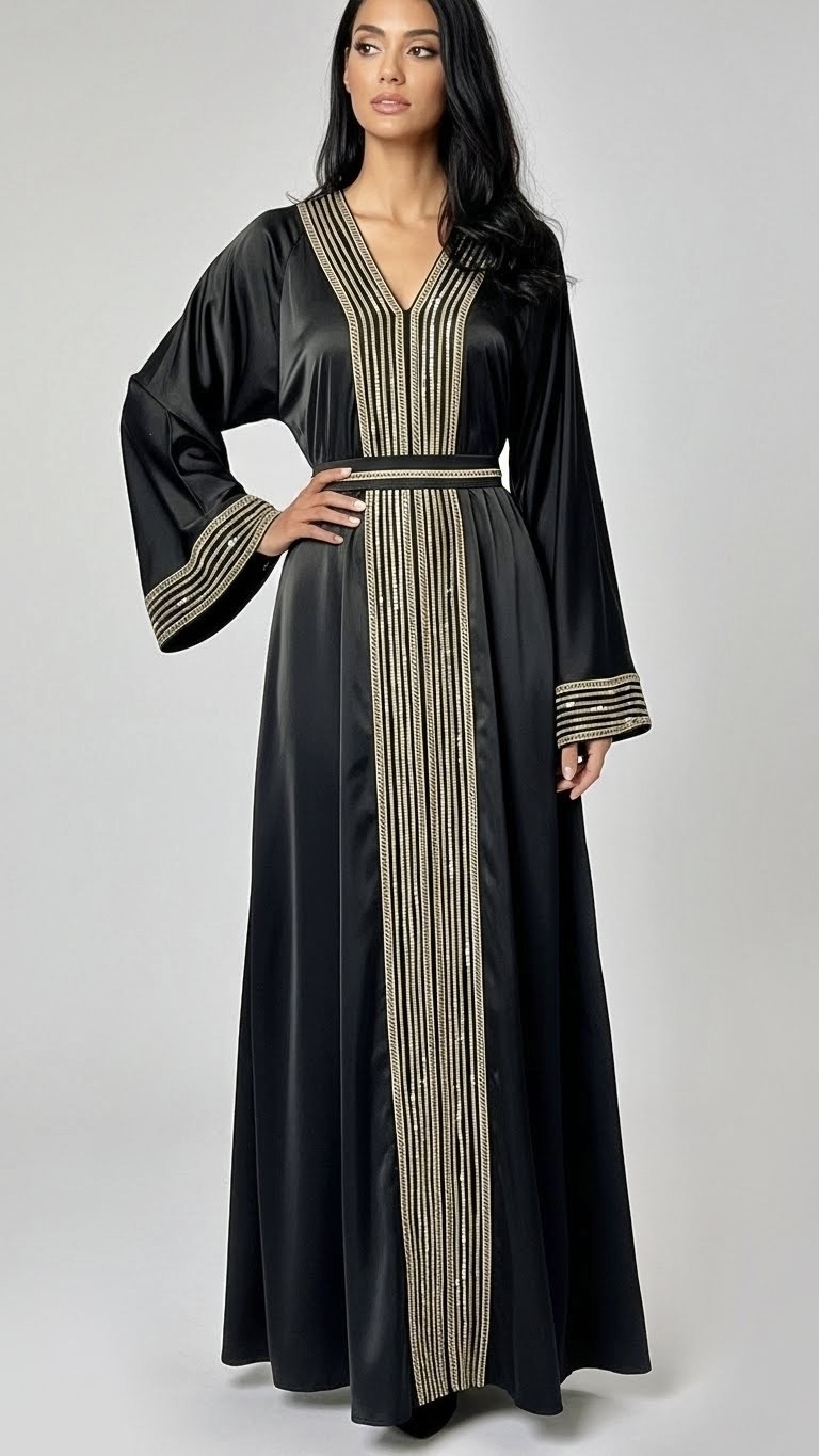 • Découvrez cette abaya noire élégante sublimée par de fines broderies dorées sur l’avant et les manches. Confectionnée dans un tissu nidah, fluide et satiné, elle offre une coupe ample et confortable.