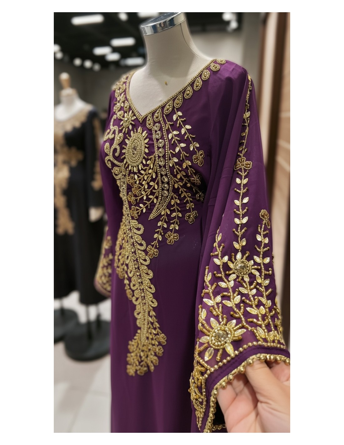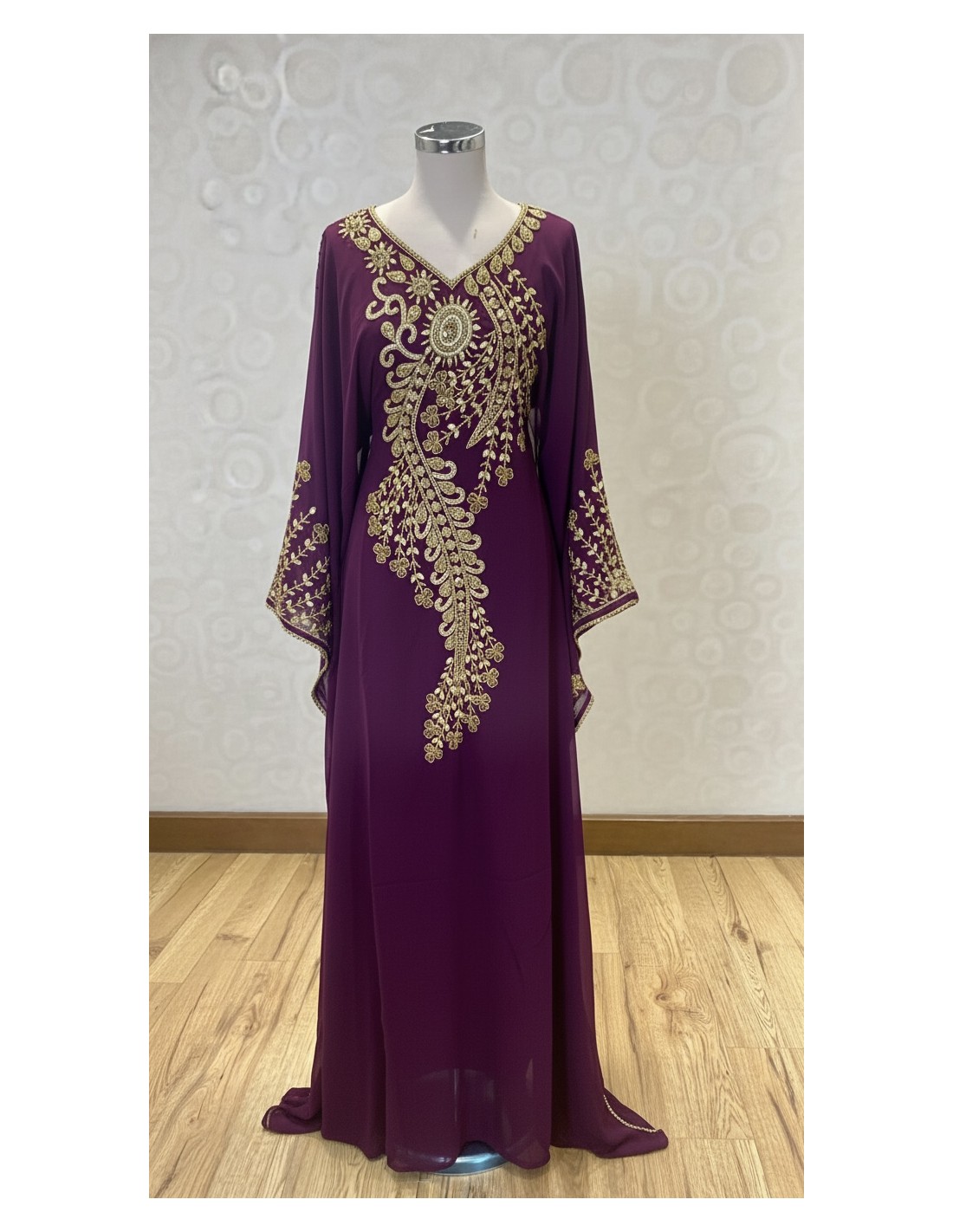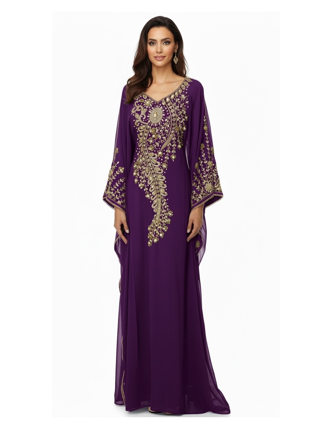 Élégante robe orientale Dubai violet, sublimée par de somptueuses broderies dorées finement travaillées. Inspirée des modèles émiraties, cette robe fluide séduit par ses manches amples papillon, brodées, et son encolure raffinée.