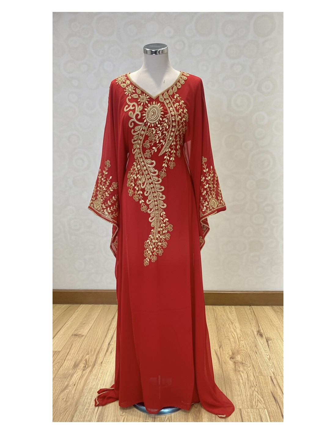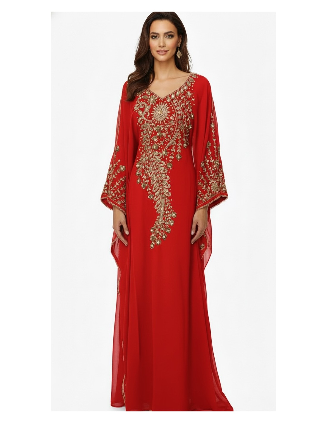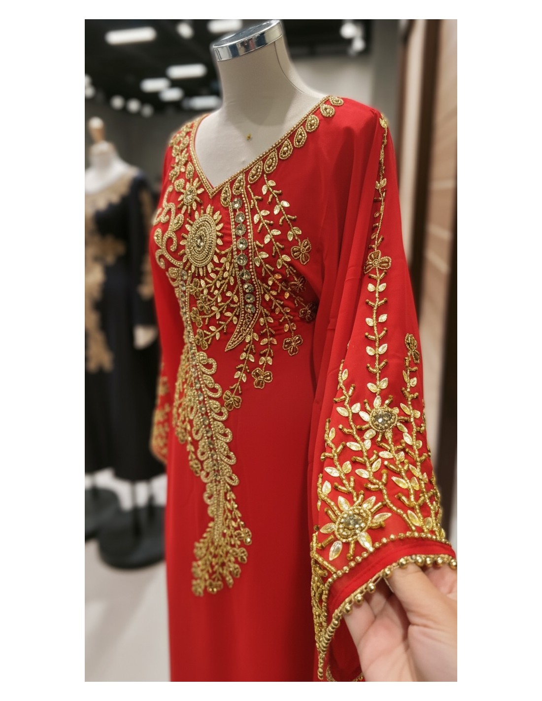 Élégante robe orientale Dubai rouge, sublimée par de somptueuses broderies dorées finement travaillées. Inspirée des modèles émiraties, cette robe fluide séduit par ses manches amples papillon, brodées, et son encolure raffinée.