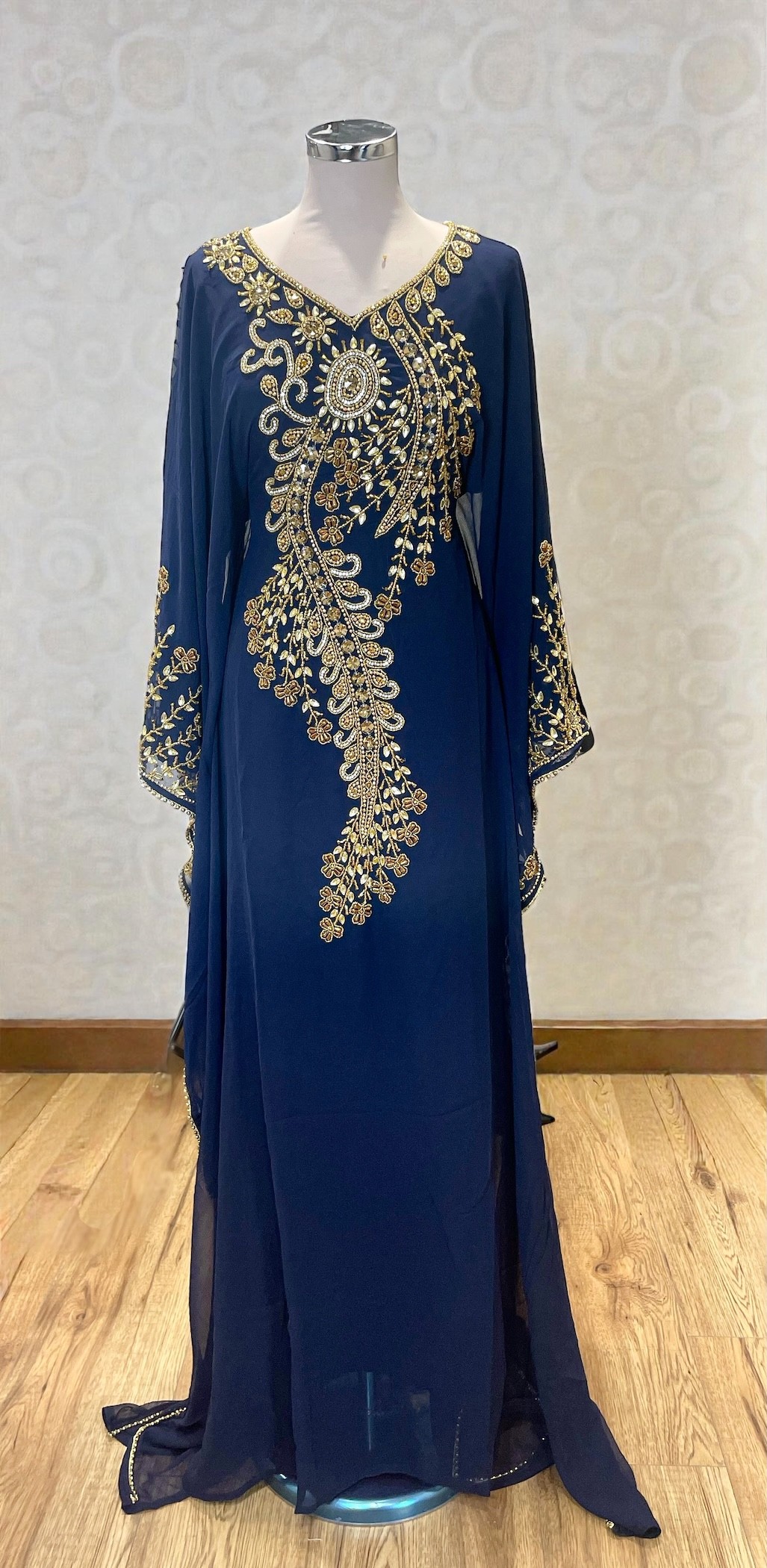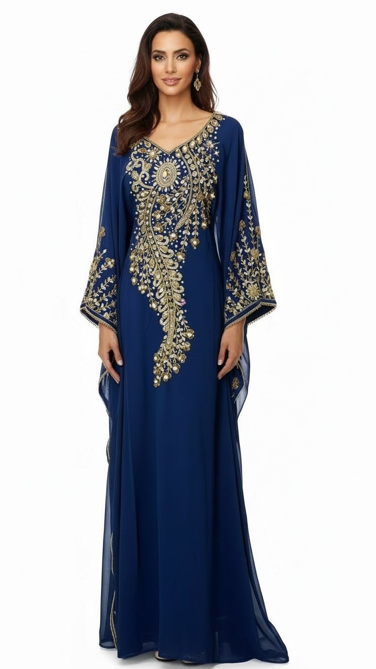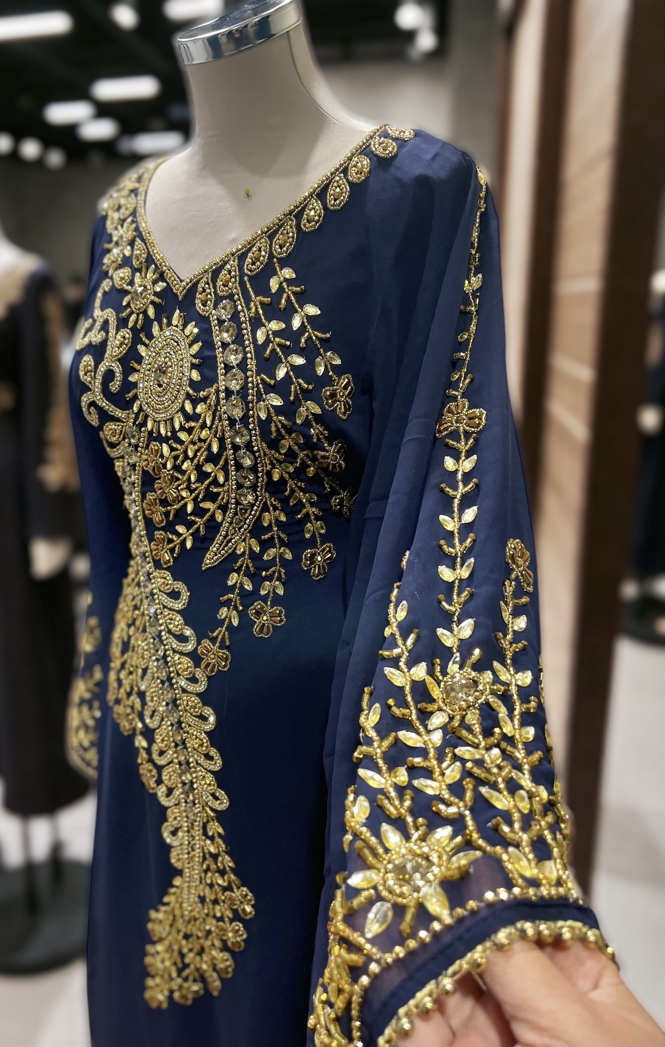 Élégante robe orientale Dubai bleu, sublimée par de somptueuses broderies dorées finement travaillées. Inspirée des modèles émiraties, cette robe fluide séduit par ses manches amples papillon, brodées, et son encolure raffinée.