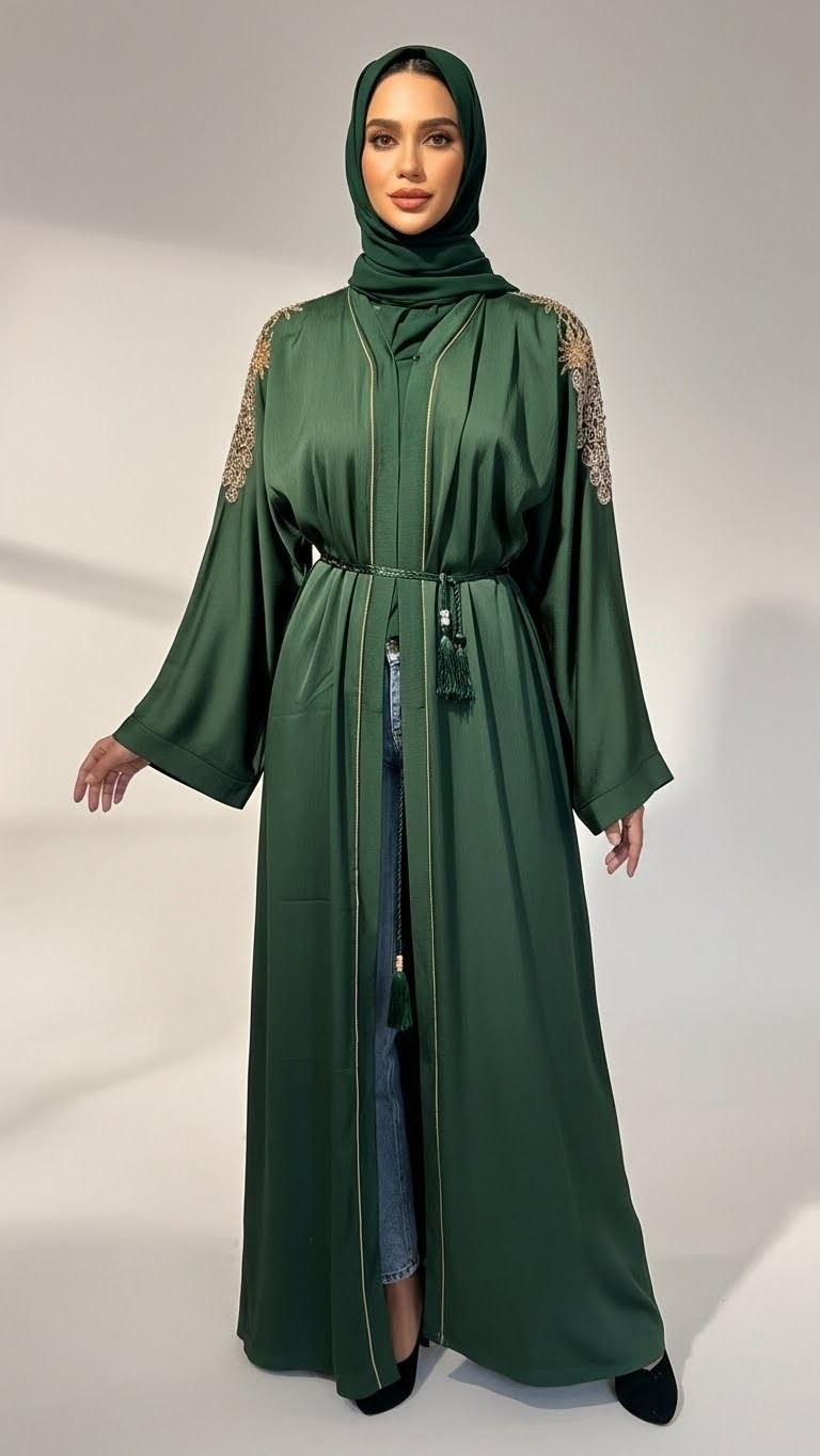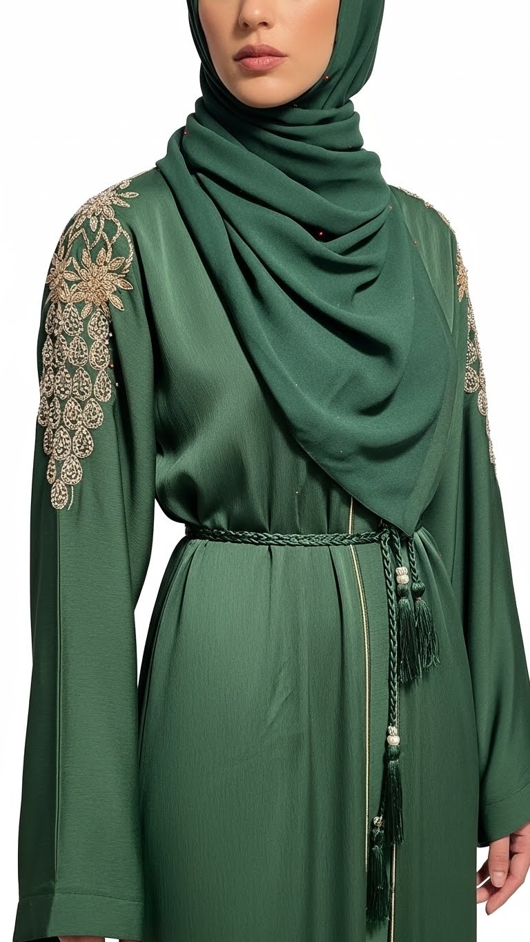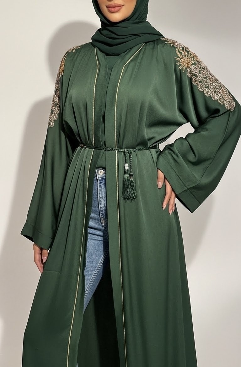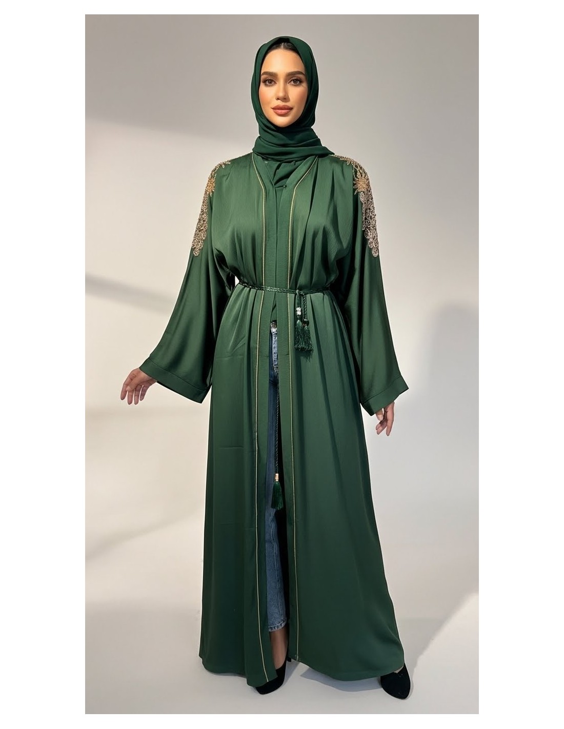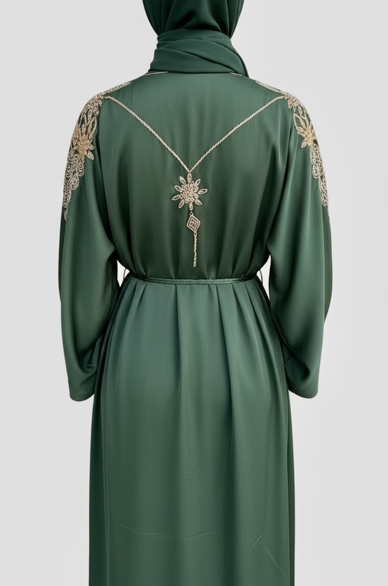 Abaya élégante brodée avec ceinture – Chic oriental Vert
