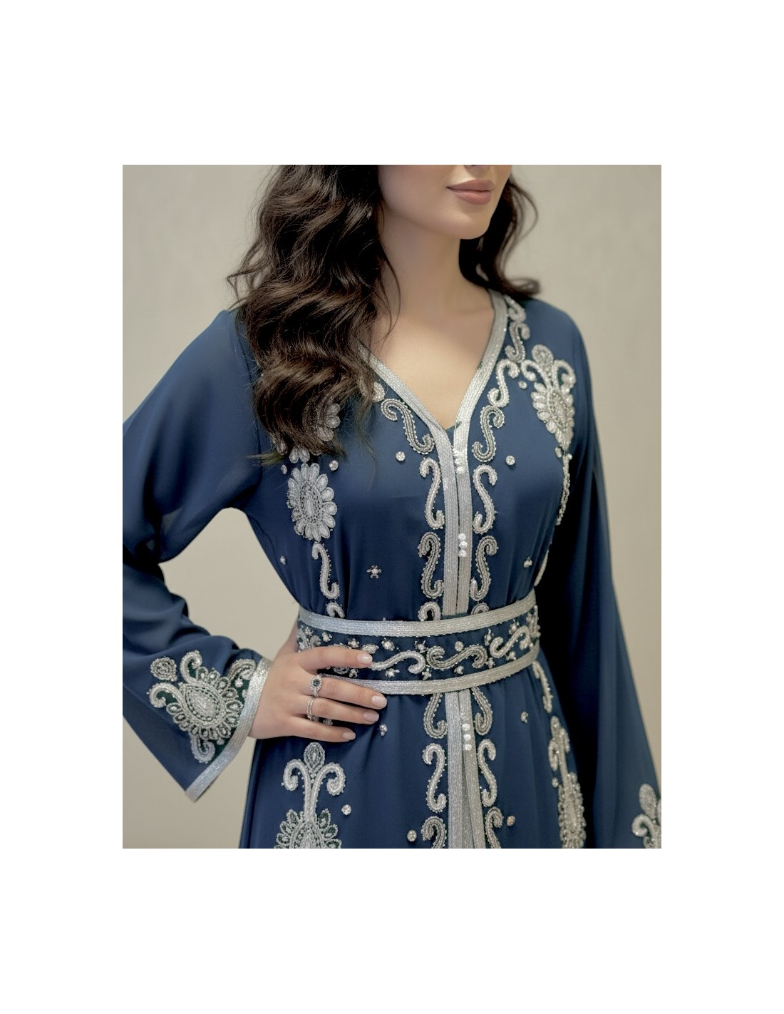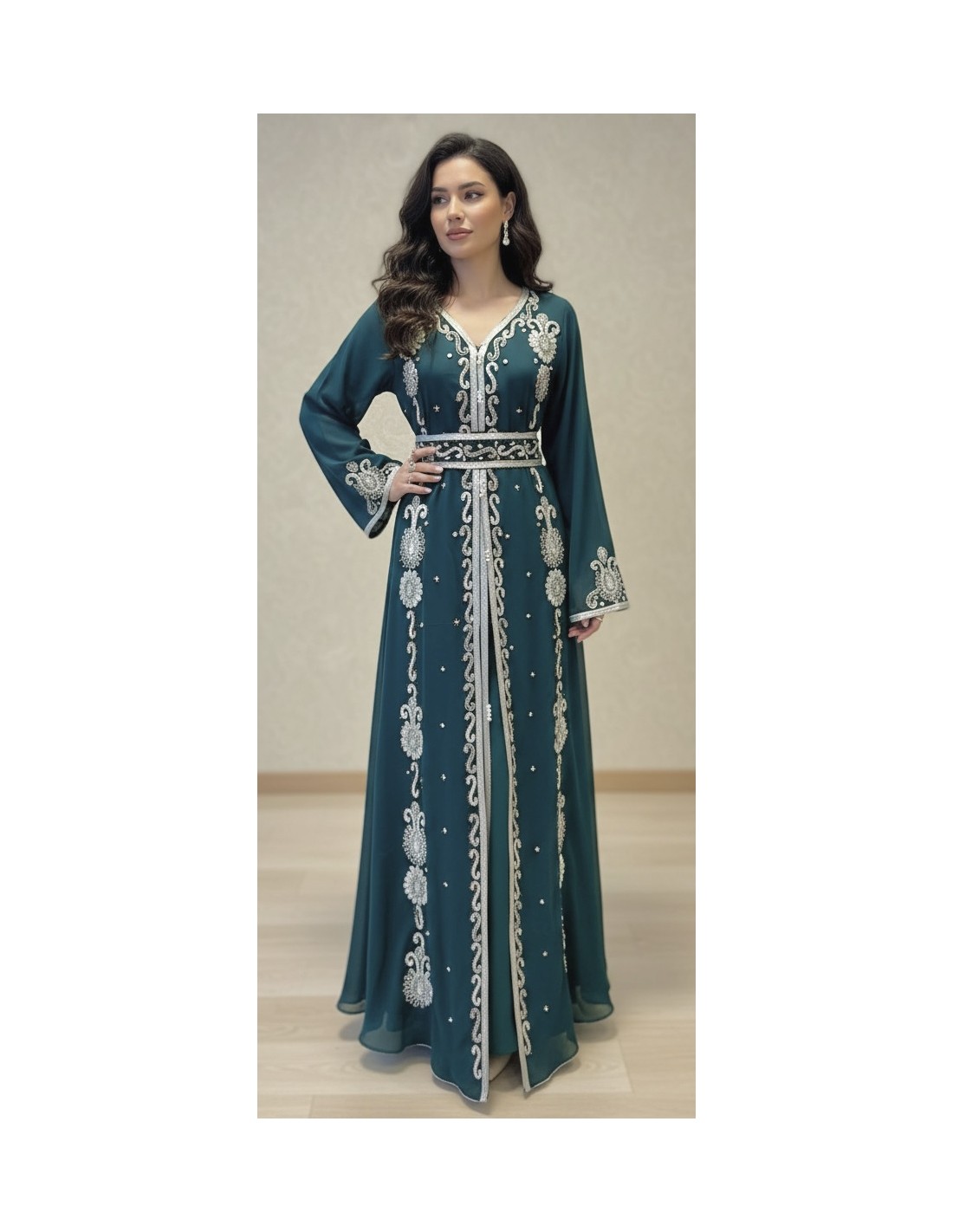 caftan Dubaï Vert Bleu Brodée Argent avec Ceinture