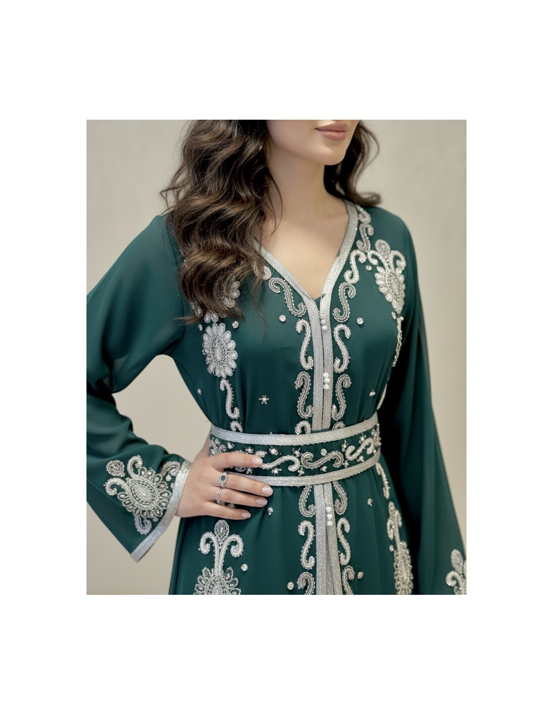 Abaya Dubaï vert royal perlée argent avec ceinture.
