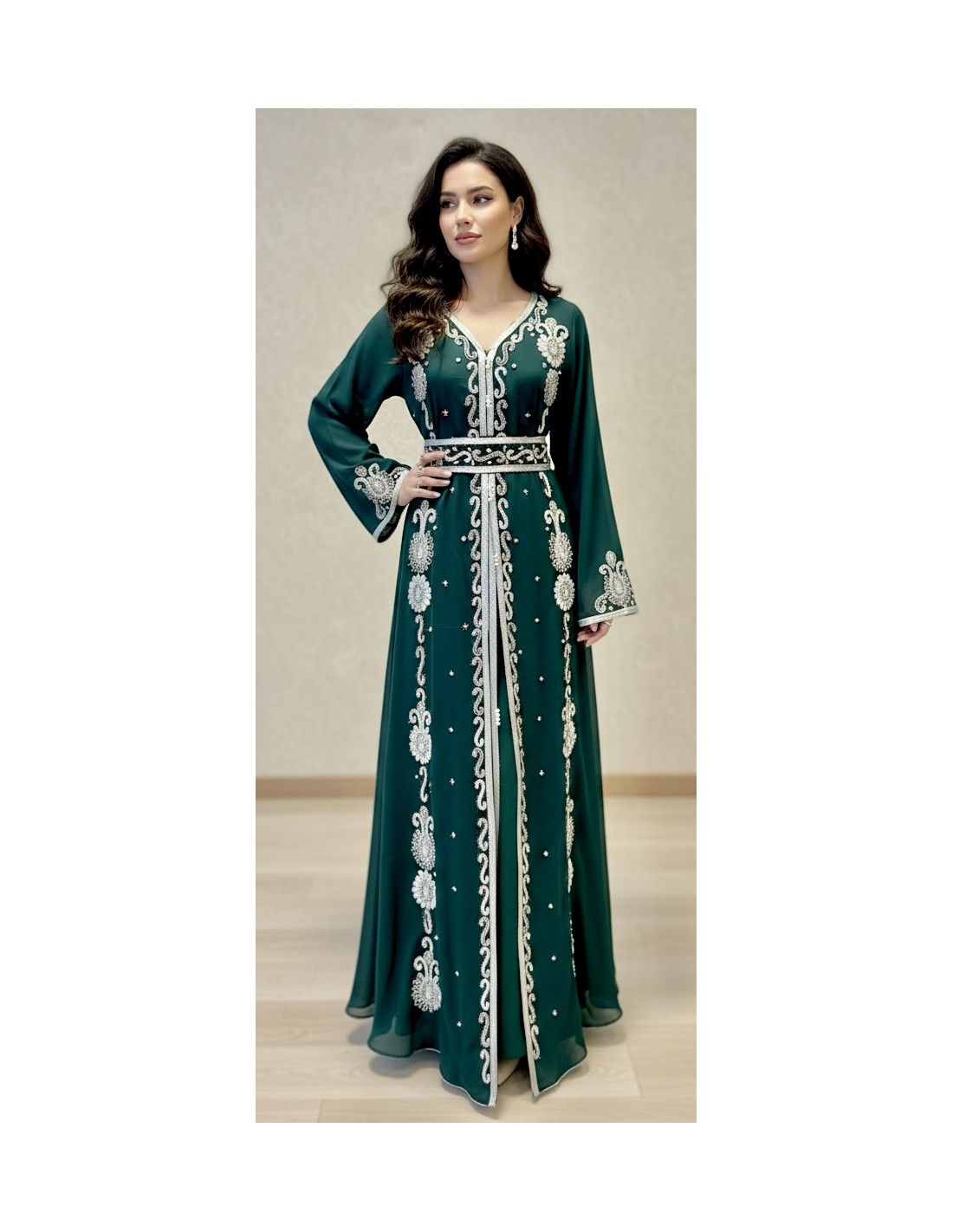 caftan Dubaï vert royal Brodée Argent avec Ceinture