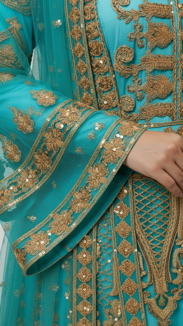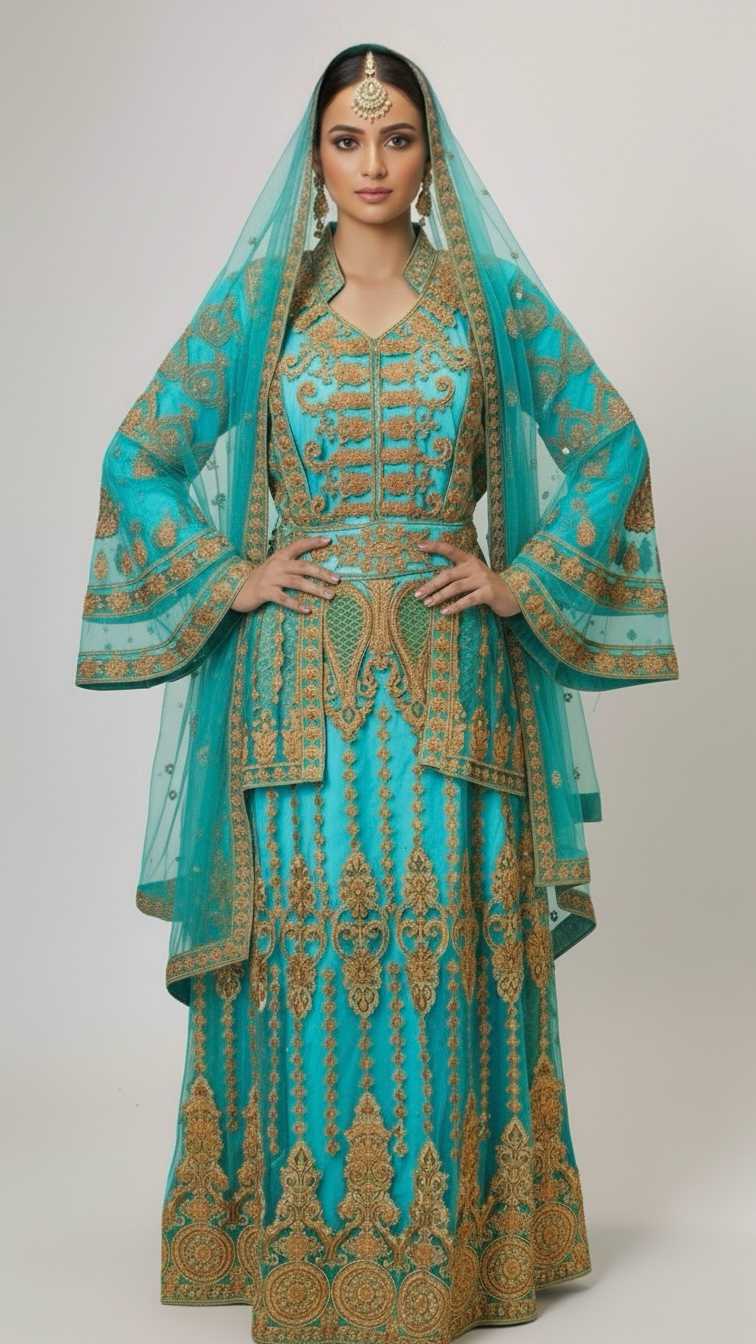 Ce somptueux caftan oriental bleu turquoise incarne l’élégance des grandes cérémonies. Sa couleur turquoise lumineuse, symbole de fraîcheur et de prestige, est magnifiée par de broderies dorées richement travaillées, rehaussées de perles délicates pour un rendu résolument luxueux.