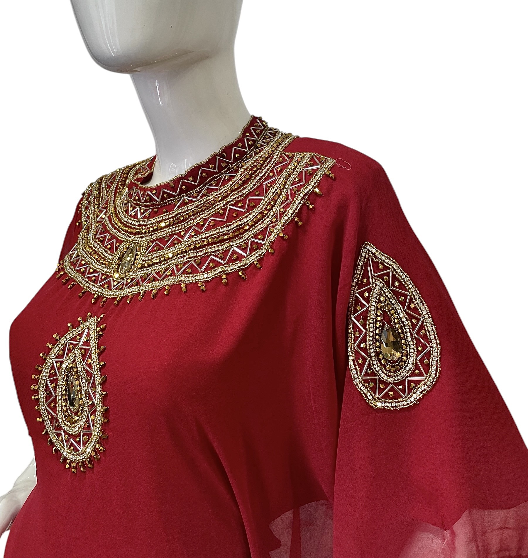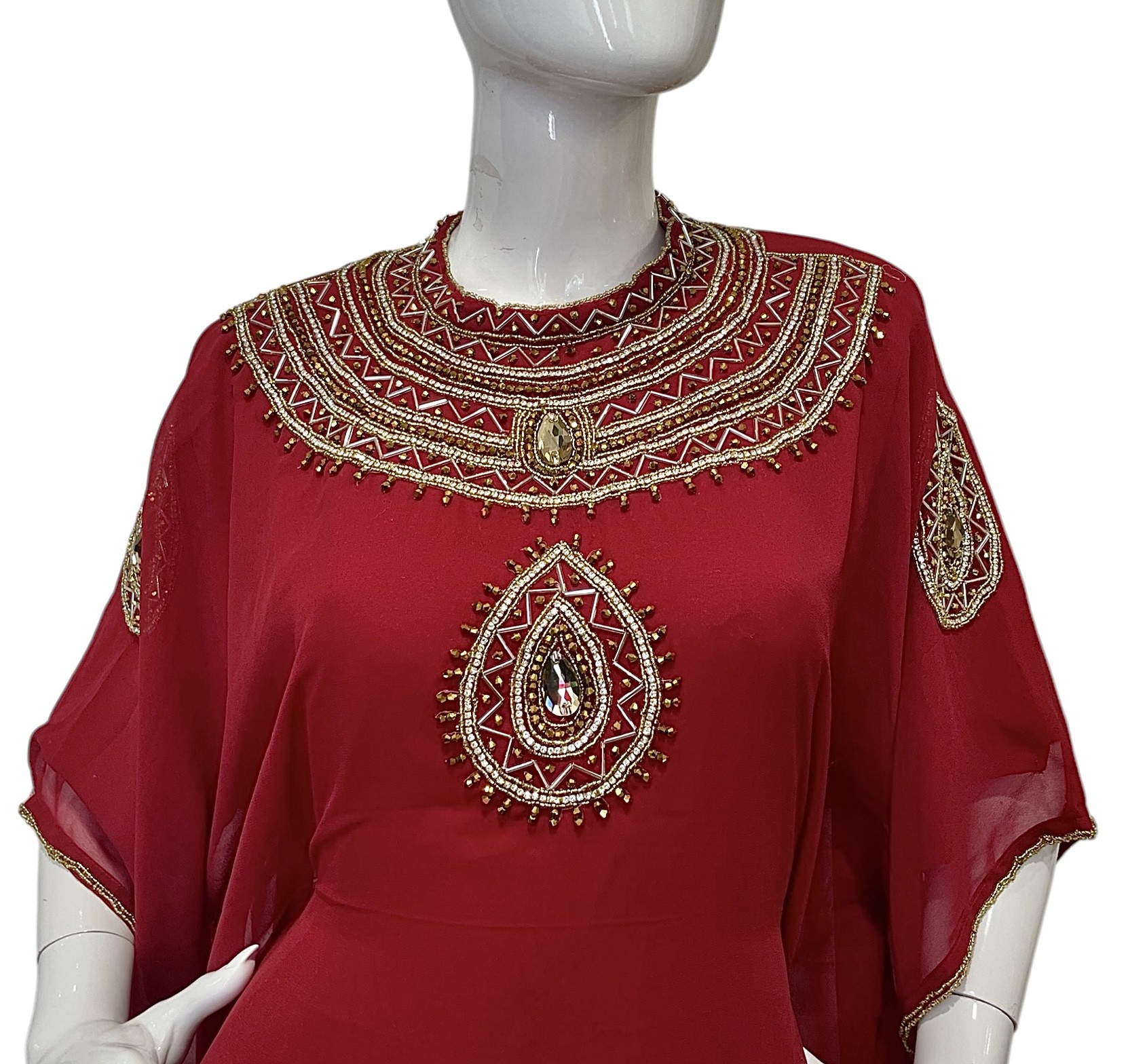 Le plastron central brodé de motifs dorés et les perles fines ajoutent une touche de luxe. Les manches évasée et larges sont ornées de broderies assorties, offrant une finition soignée jusque dans les moindres détails.
