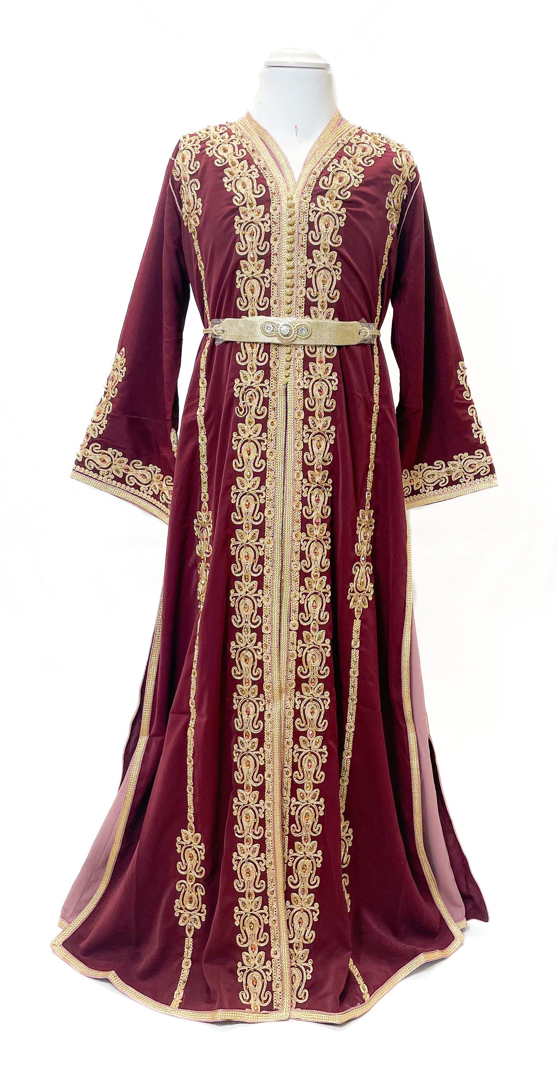 Composée de deux pièces superposées, cette takchita est ornée de broderies dorées élégantes, mettant en valeur le devant, les manches et les finitions. La ceinture incluse permet d’ajuster parfaitement la tenue à la morphologie de l’enfant, pour une silhouette chic et harmonieuse.