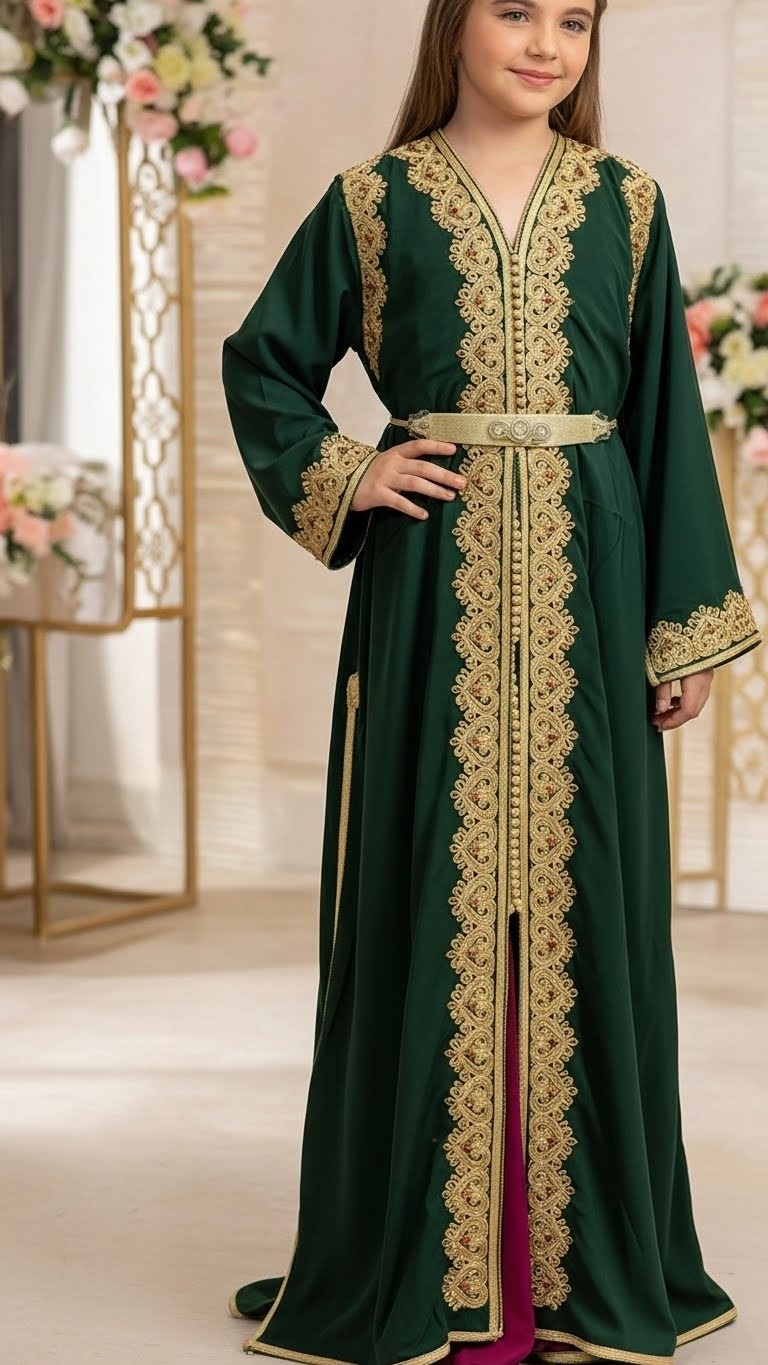 Sublimez les grandes occasions avec cette takchita 2 pièces pour enfant et ado, inspirée du caftan marocain traditionnel, spécialement conçue pour les filles de 8 à 15 ans.