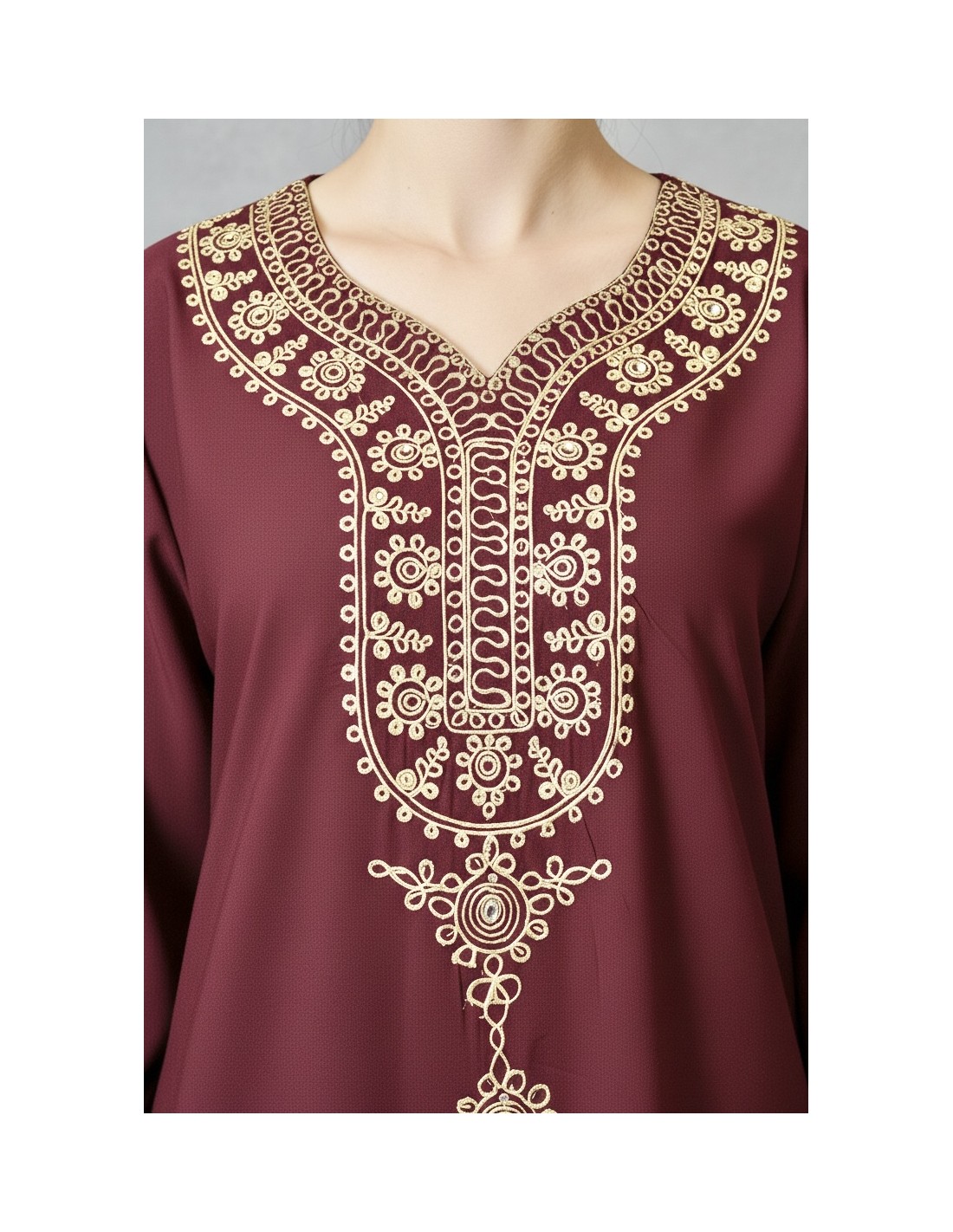 Col en V délicatement brodé de motifs dorés apporte une finition soignée sans être trop habillée, tandis que la broderie centrale verticale ajoute une touche orientale discrète et élégante. Les manches longues et la longueur maxi assurent une tenue pudique, parfaitement adaptée au Ramadan.