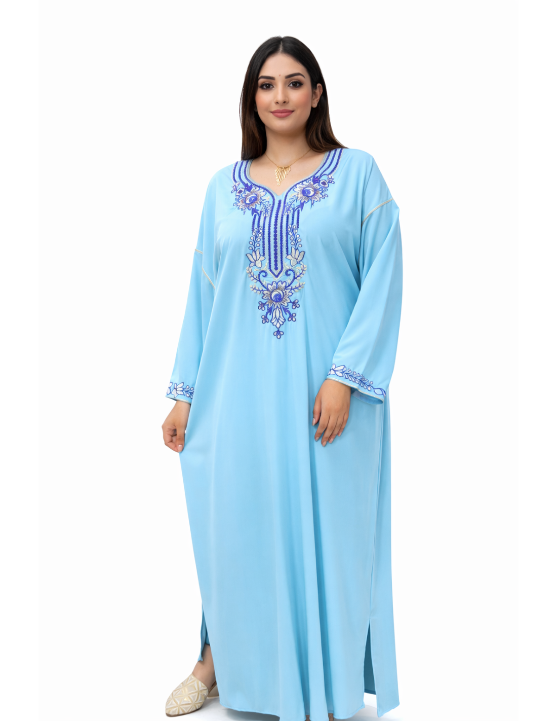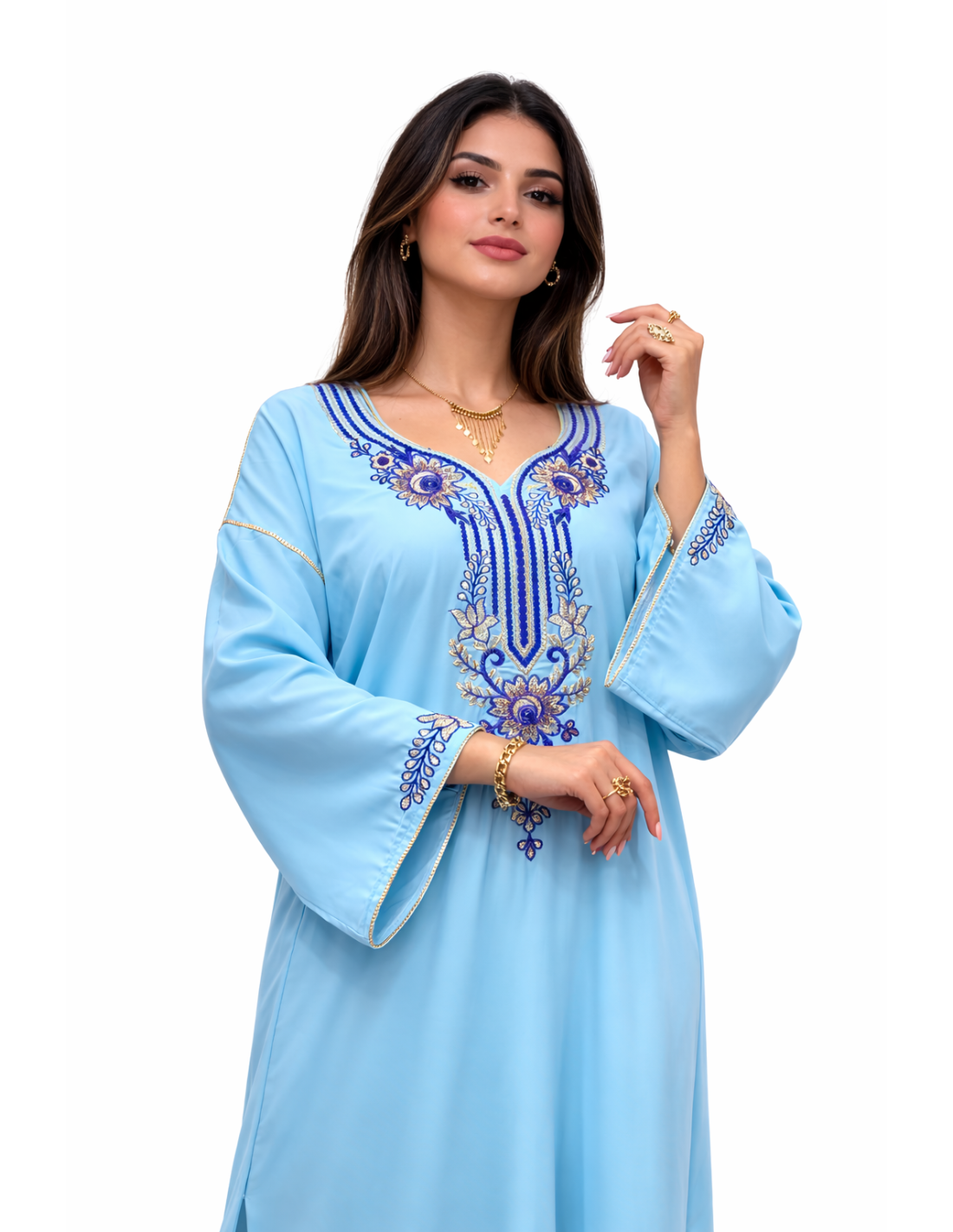 Les broderies marocaines raffinées au niveau du col et de la poitrine apportent une touche authentique et chic. Sa coupe ample permet un grand confort tout en restant élégante.