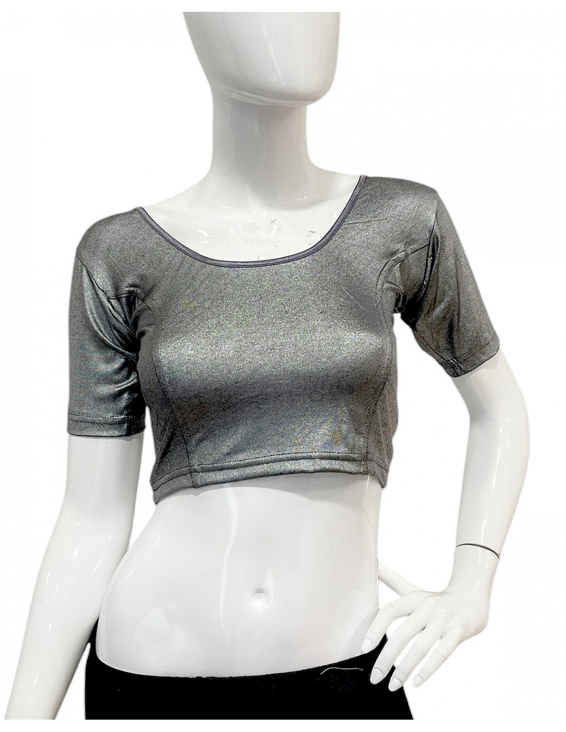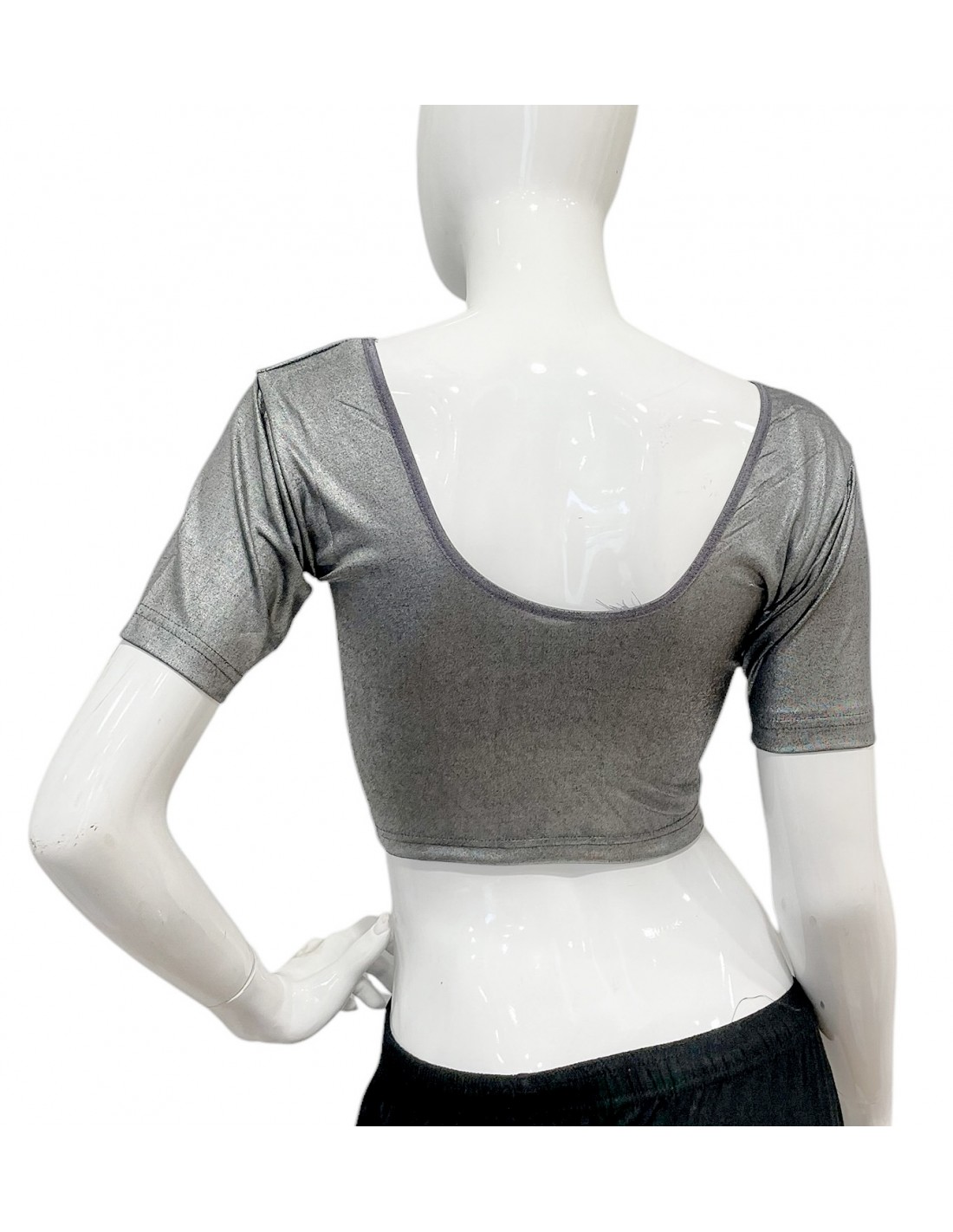Cette blouse choli à manches courtes, en tissu scintillant gris foncé métallisé, est idéale pour accompagner un sari, lehenga, ghagra choli ou toute autre tenue traditionnelle indienne. Confectionnée en élasthanne extensible, elle s’ajuste parfaitement aux tailles 34 à 42, garantissant un confort absolu et une liberté de mouvement idéale pour la danse Bollywood, les mariages indiens et les cérémonies traditionnelles. Son dos échancré et sa coupe ajustéeoffrent une silhouette élégante et féminine, idéale pour briller lors de vos événements festifs.