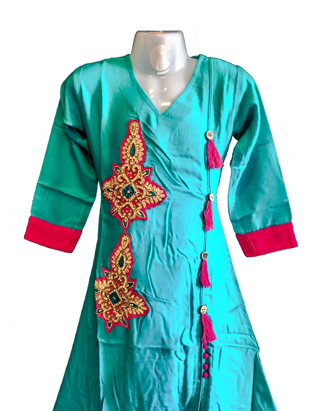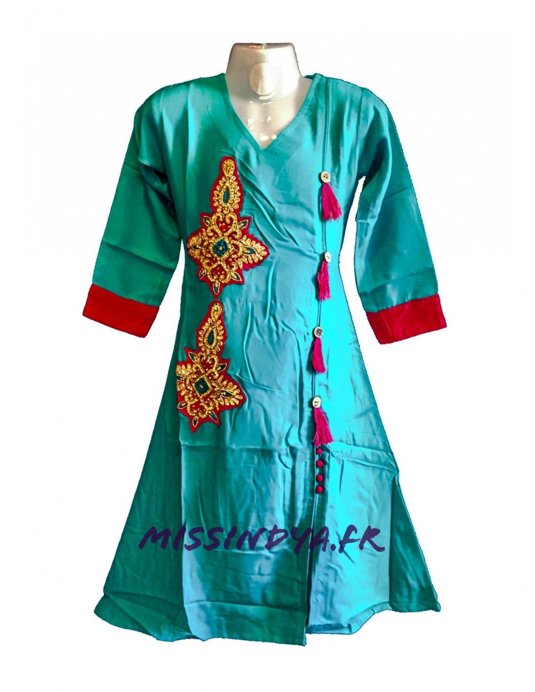 KURTI( TUNIQUE ENFANT) BLEU VERT ET STRASS DORÉ  - 1