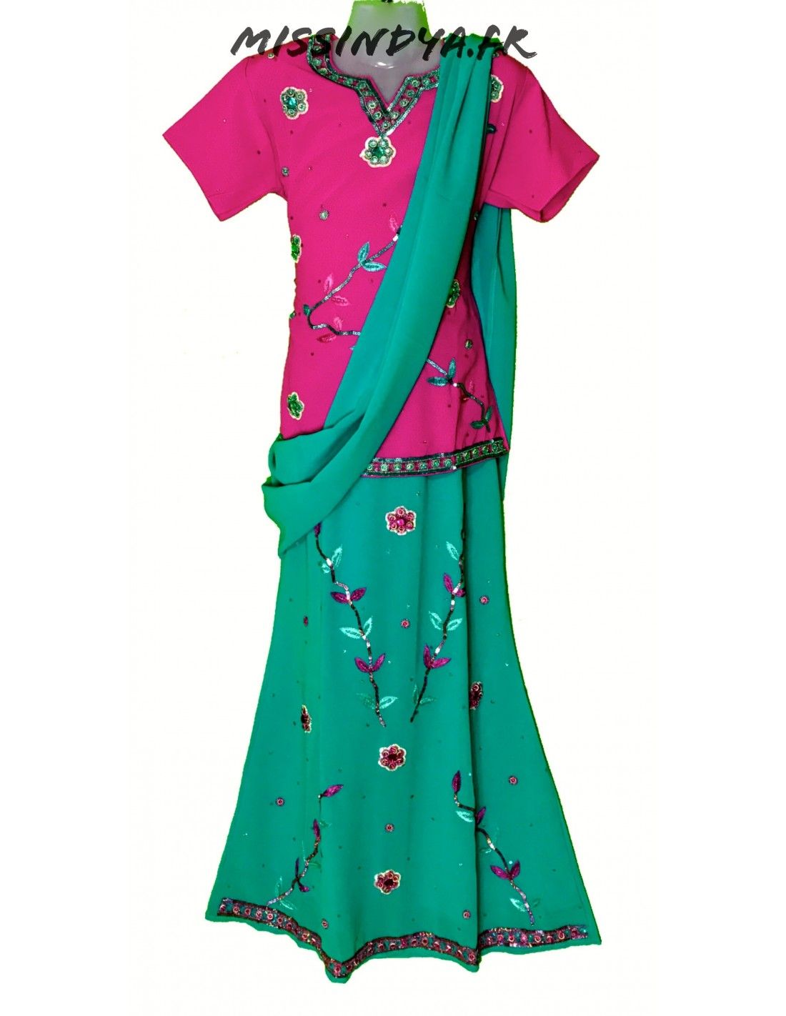 Lehenga sari indien Fille rose et bleu vert  - 1