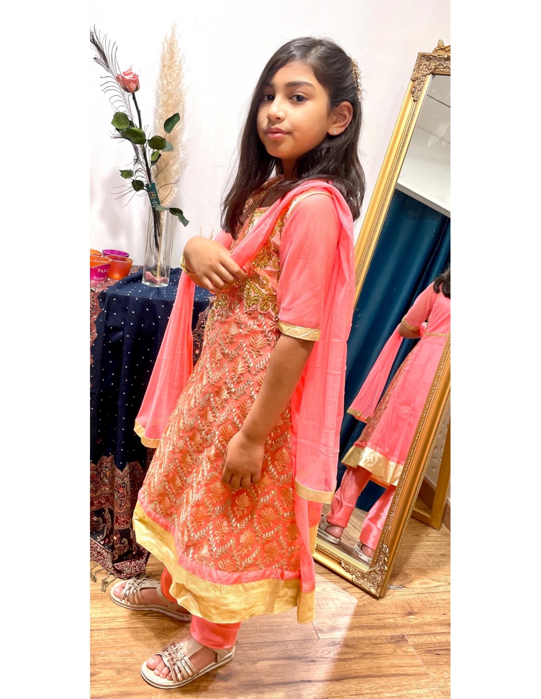 Robe indienne fille Salwar Kameez Amrita Corail et doré  - 4