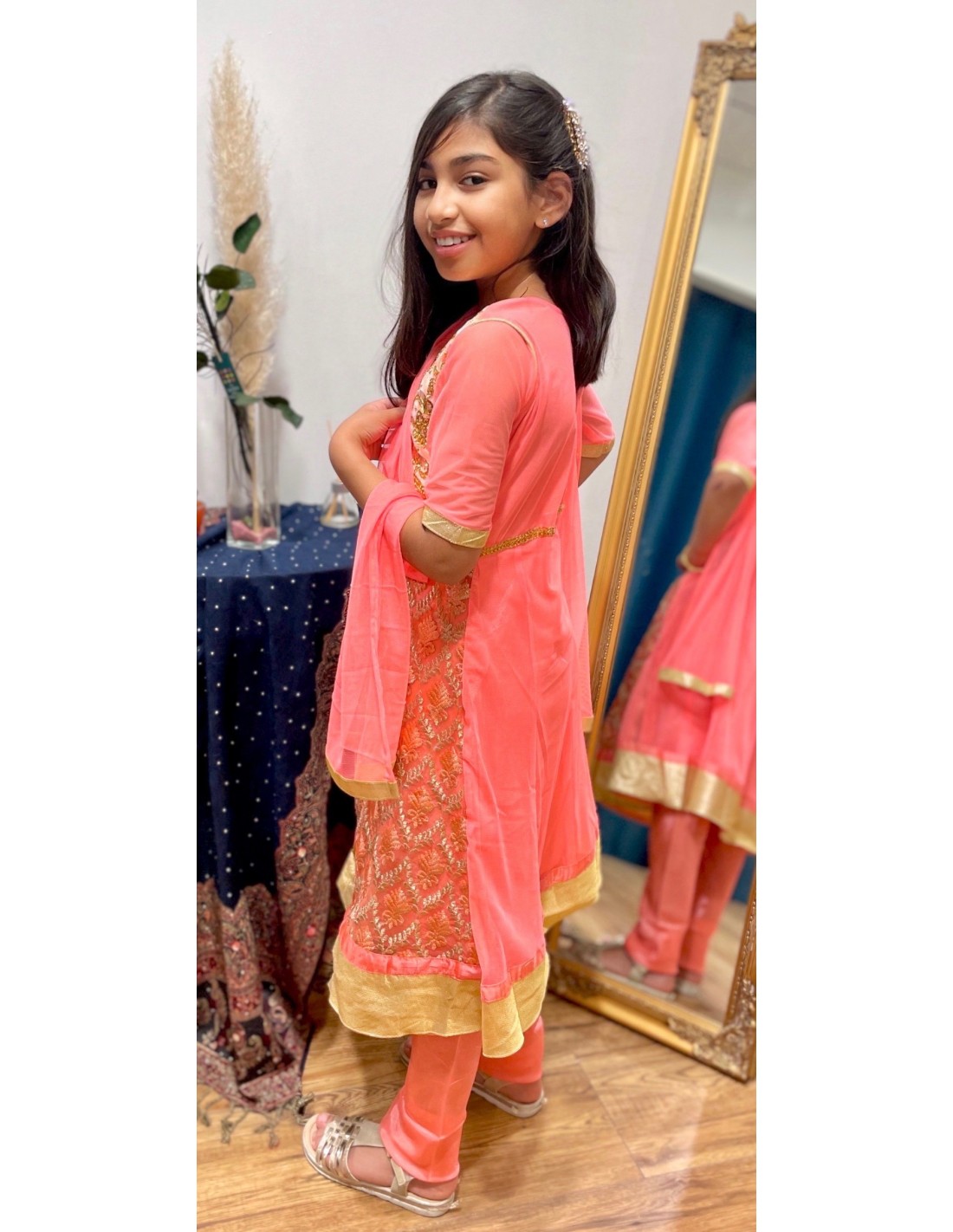 Robe indienne fille Salwar Kameez Amrita Corail et doré  - 2