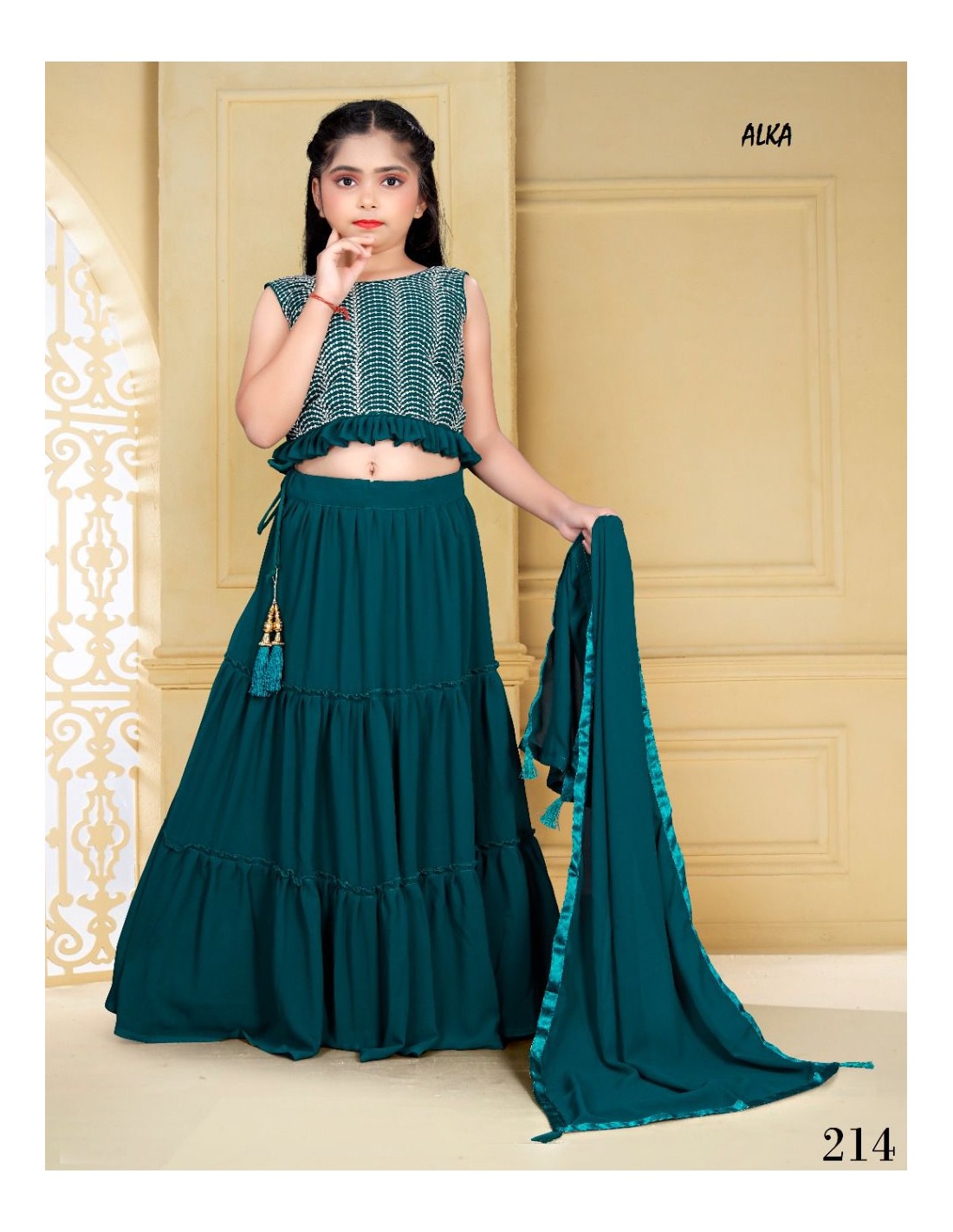 Lehenga choli sari fille enfant ALKA doré Bleu Vert