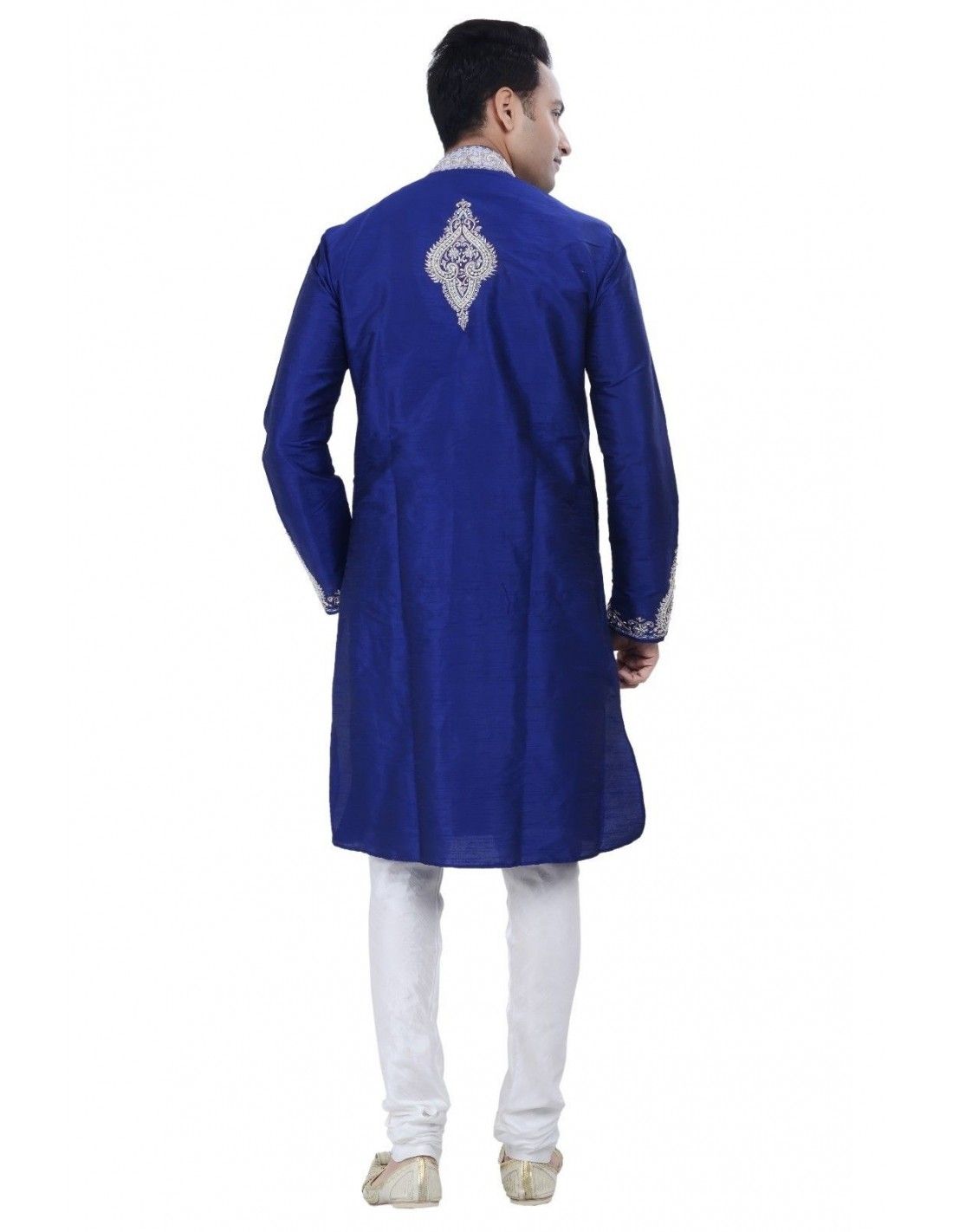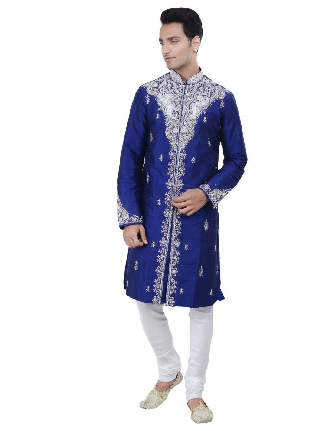 Faites correspondre la grandeur de l'occasion en portant ce Sherwani Art Silk Beige & Rouge . Paisley et motif ornemental brodé Zardozi , Pierre et perles embellissent l'ensemble. Pierre travail le long de son décolleté accentuent son charme . Accompagné d'un churidar de couleur rouge.