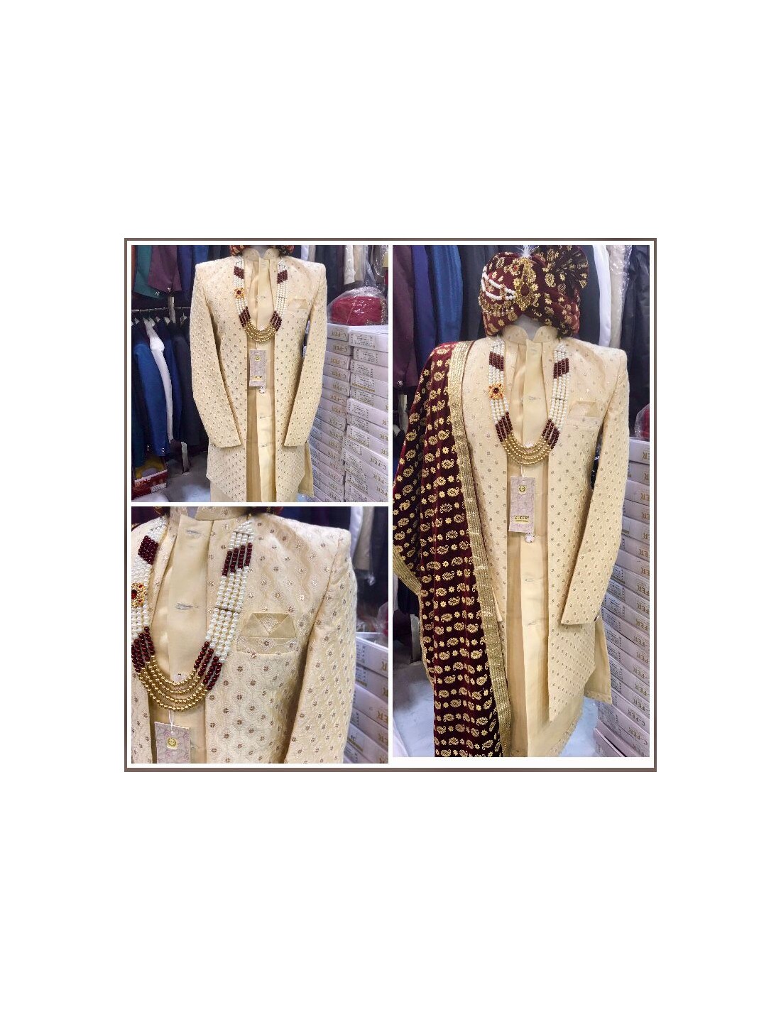 Faites correspondre la grandeur de l'occasion en portant ce Sherwani. Paisley et motif ornemental brodé Zardozi , Pierre et perles embellissent l'ensemble. Pierre travail le long de son décolleté accentuent son charme . Accompagné d'un Pagdi, étole et bijoux assortie