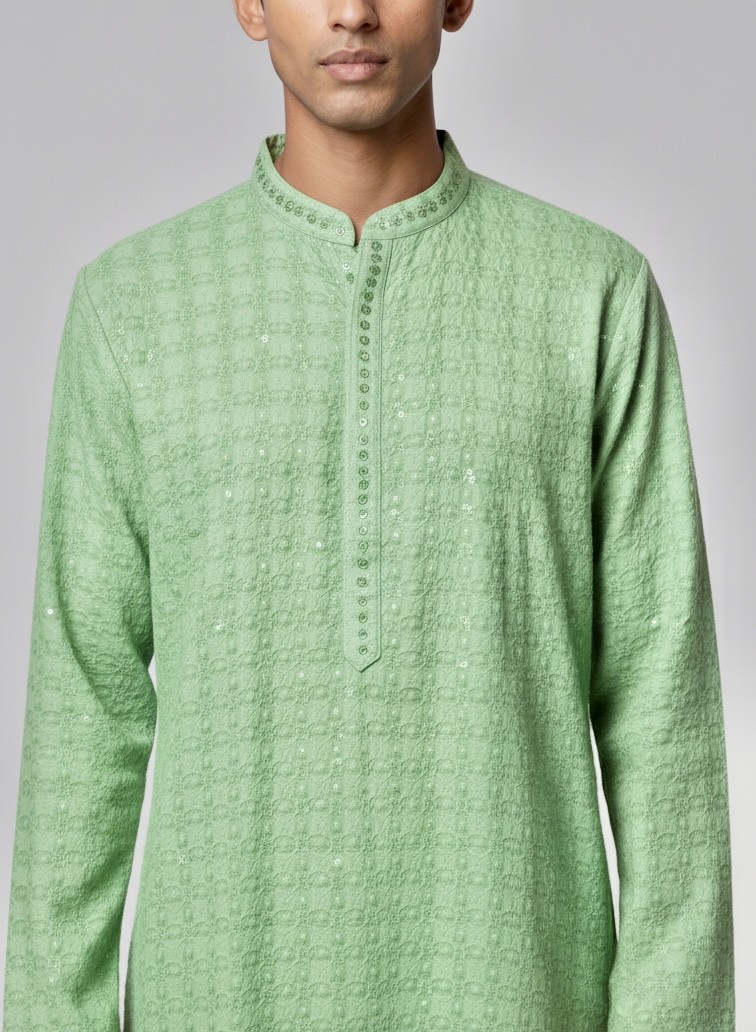 Kurta homme élégant en tissu vert anis, orné de fines broderies et de touches discrètes de sequins pour un effet raffiné.