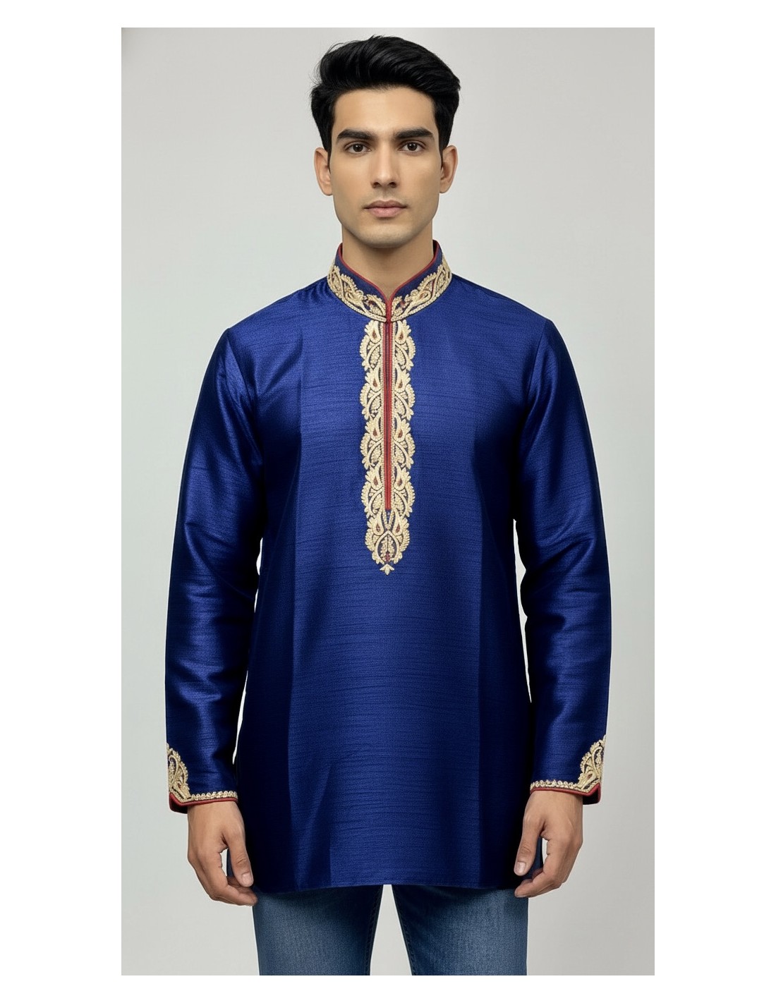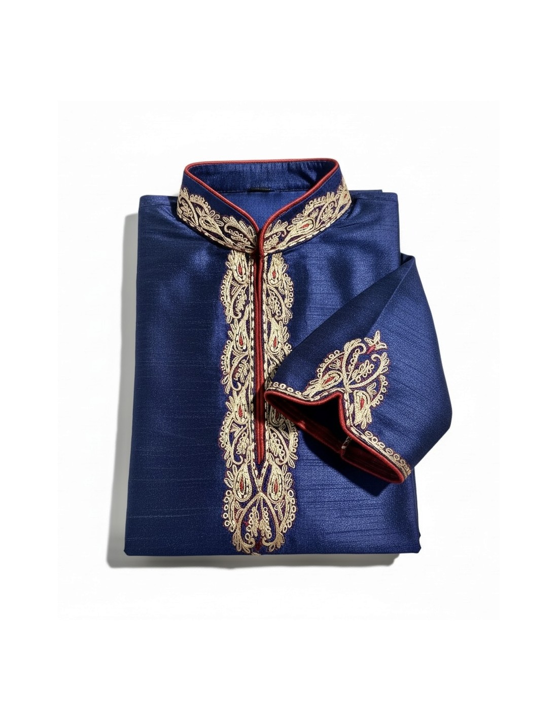 Élégant kurta pour homme en tissu bleu marine, rehaussé de fines broderies au niveau du col, des poignets et de l’encolure.