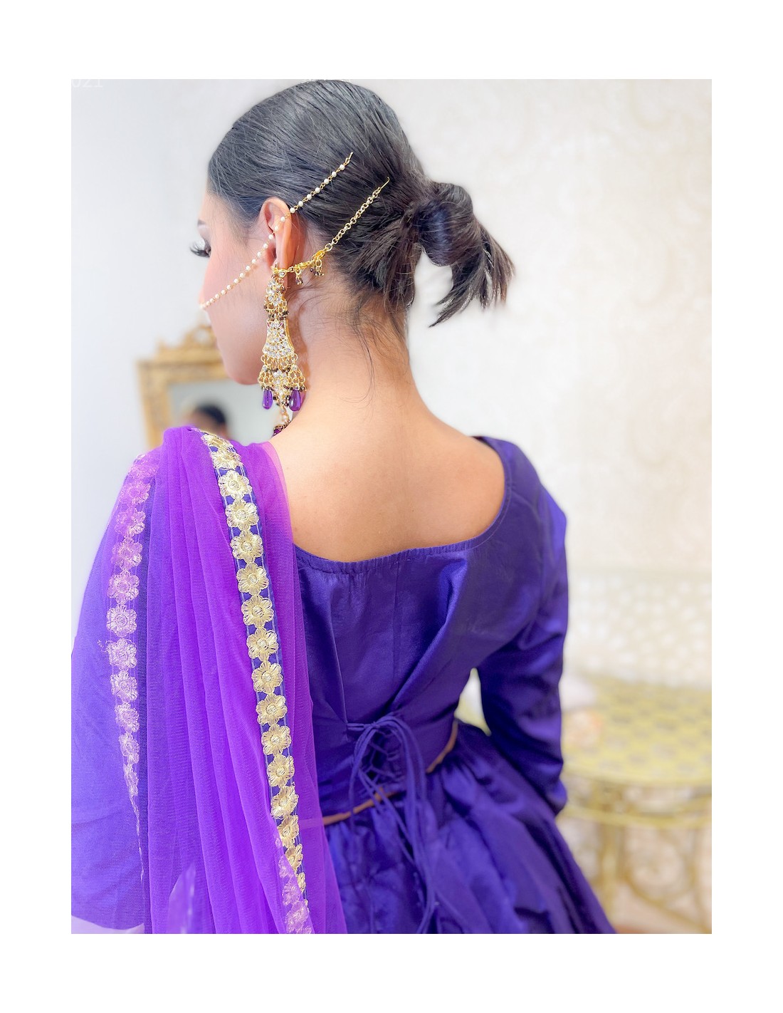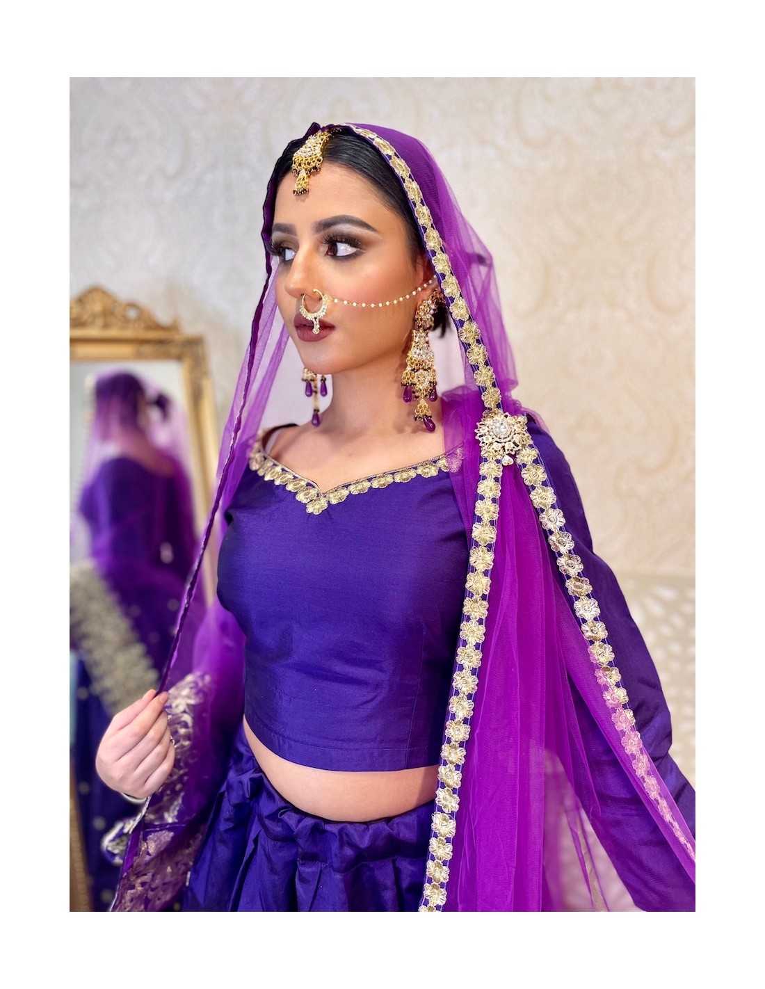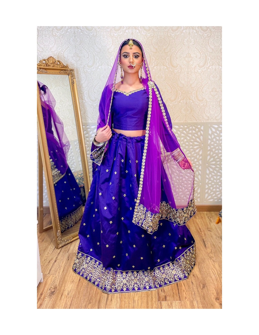 tenue indienne lehenga choli violet et doré brodé