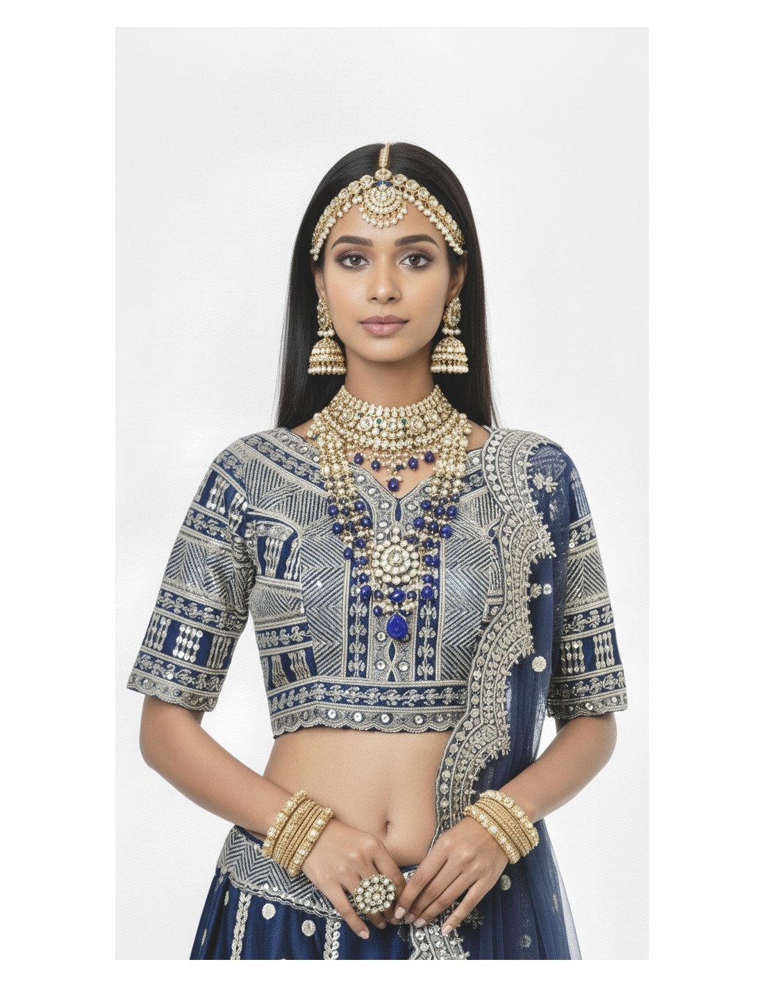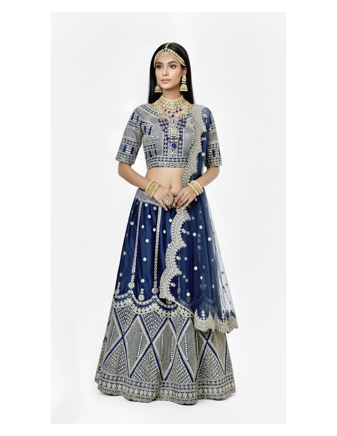 Sublimez vos cérémonies avec ce Lehenga Choli de mariage haute couture, conçu dans un tissu satiné somptueux, entièrement brodé de motifs dorés traditionnels. Disponible en trois couleurs élégantes – bleu marine profond, rouge éclatant et vert paon raffiné – ce modèle incarne l’élégance intemporelle des mariages indiens.