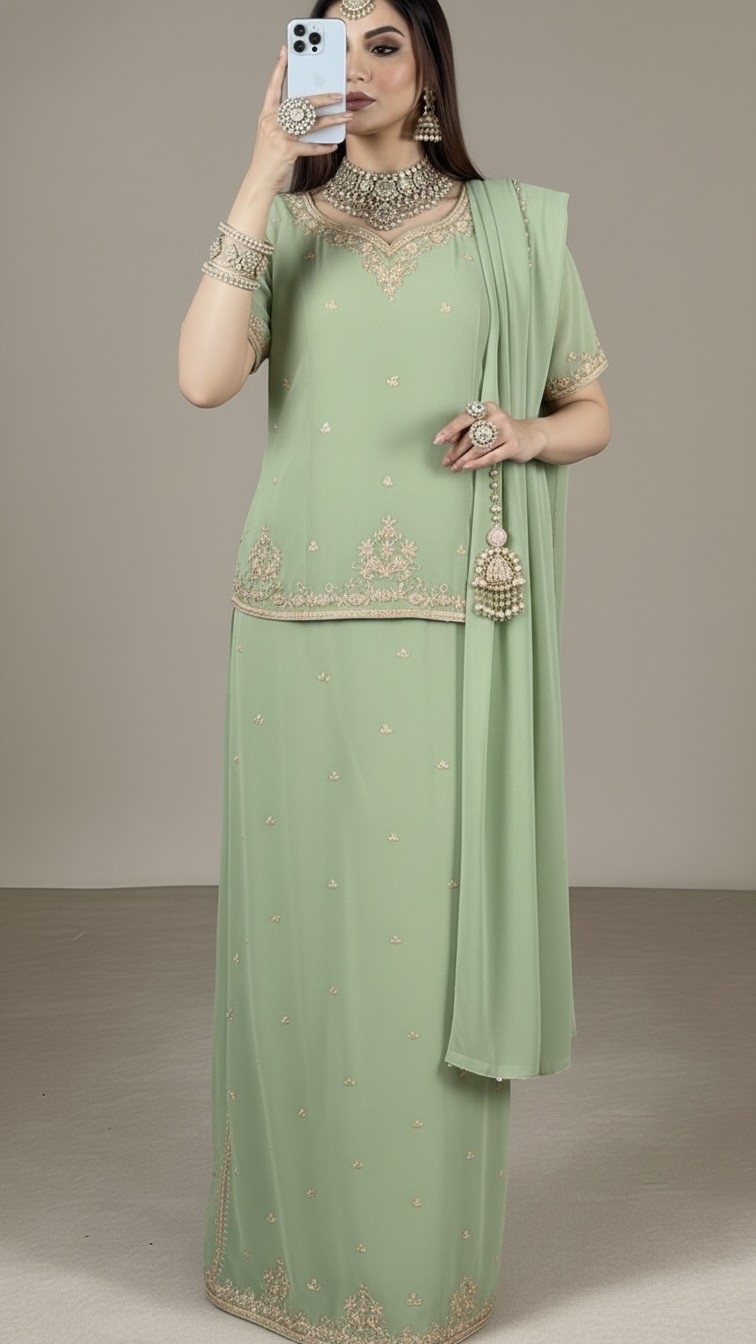 Craquez pour ce lehenga élégant brodé, une tenue indienne à la fois douce, féminine et sophistiquée. Sa teinte verte subtile et apaisante associée à des broderies délicates crée un ensemble harmonieux, parfait pour les grandes occasions comme pour les événements élégants.