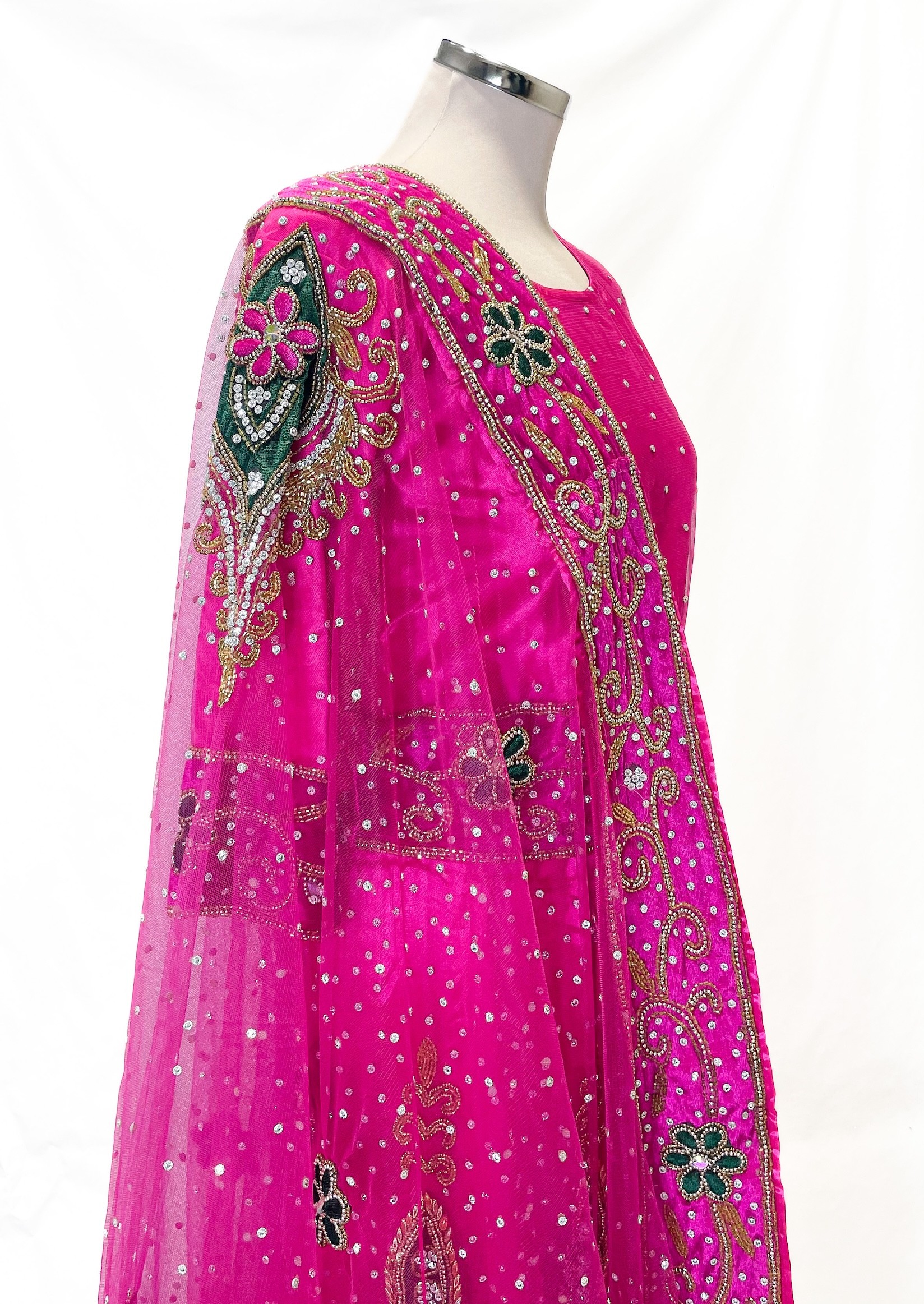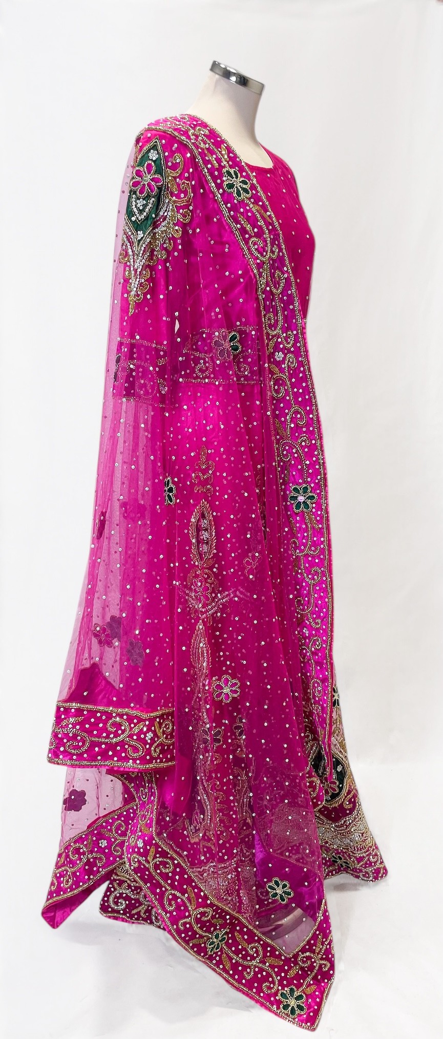 une longue écharpe tissu tulle souple, avec un large bord brodés de motifs dorée .