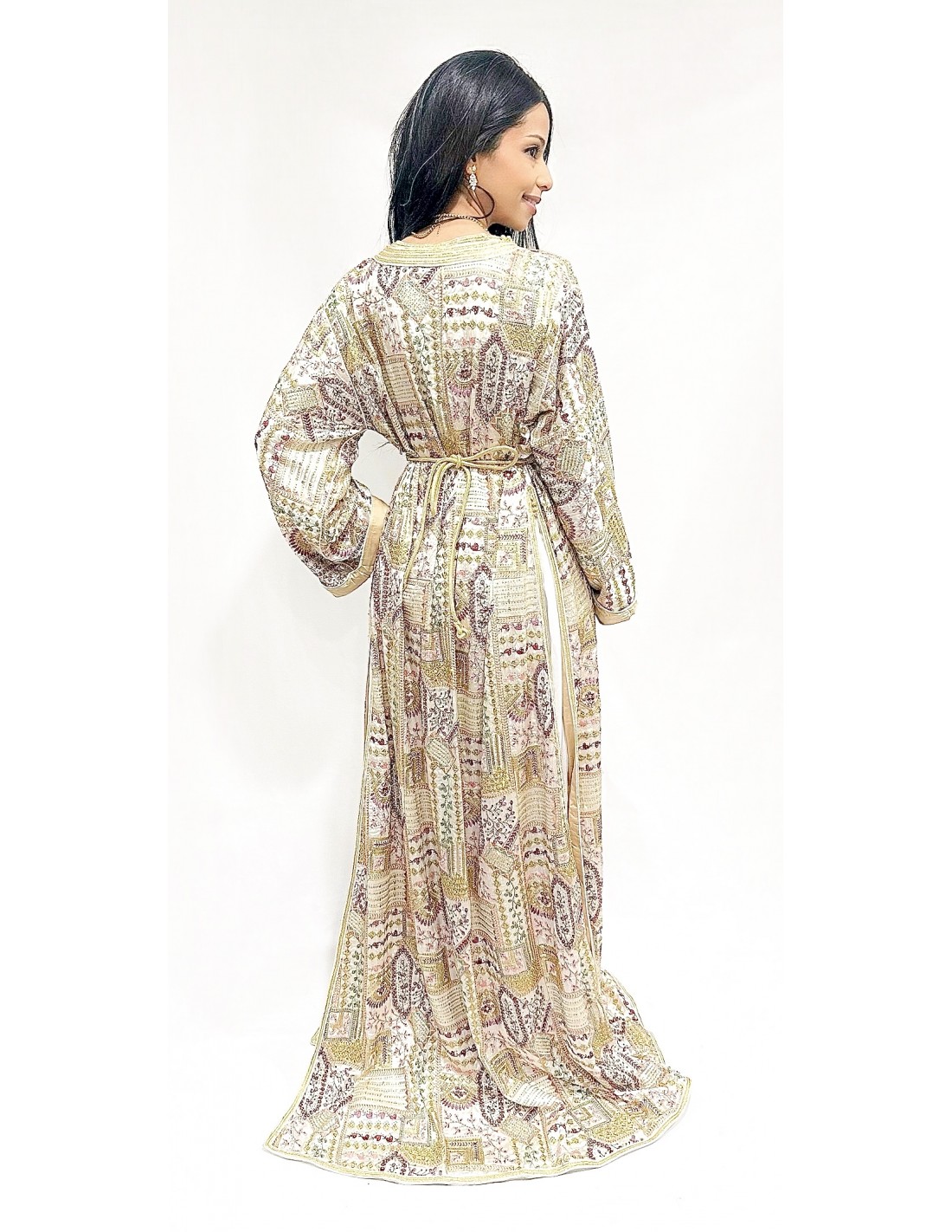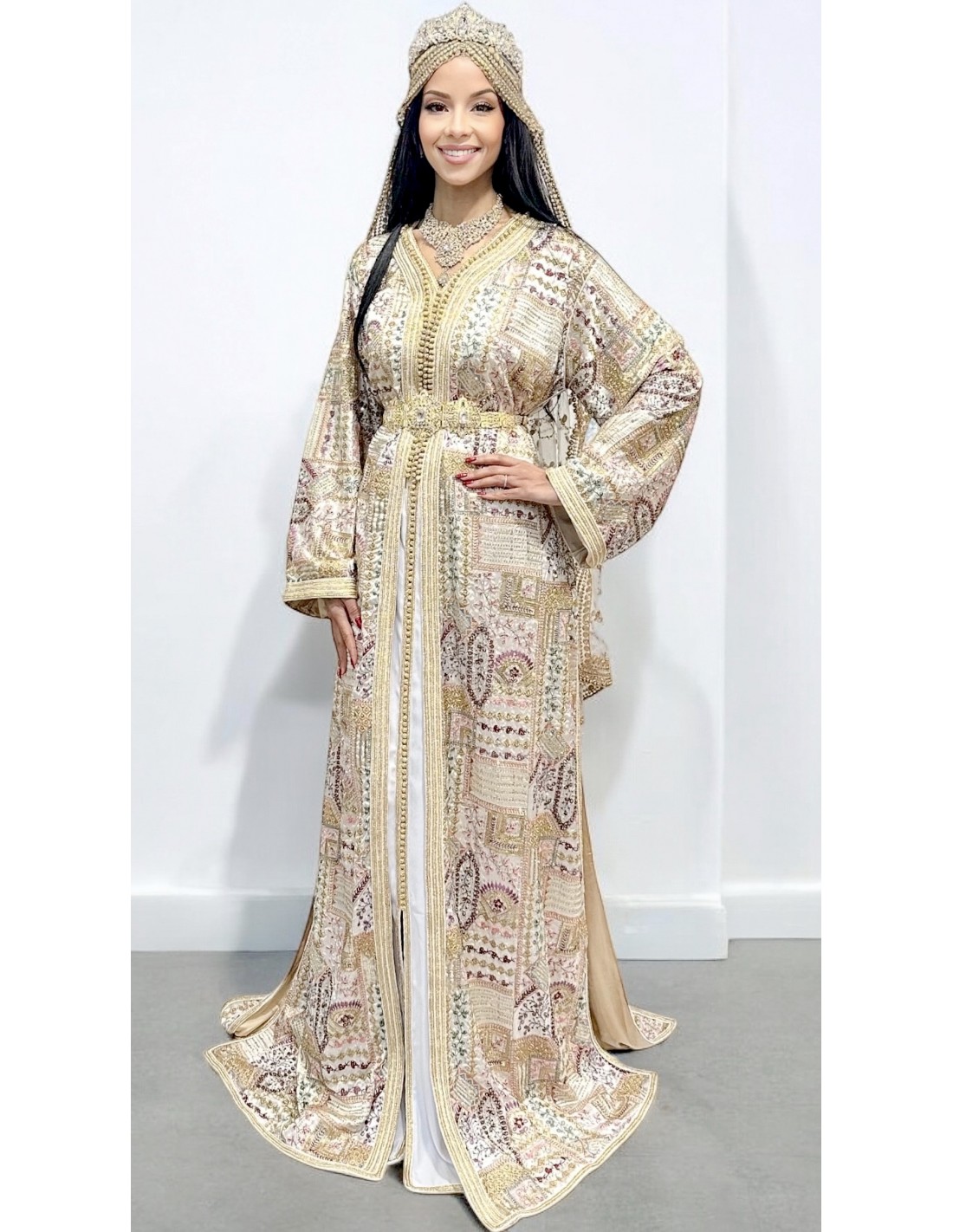 Caftan sari marocain Takchita blanc et beige location lille  - 2