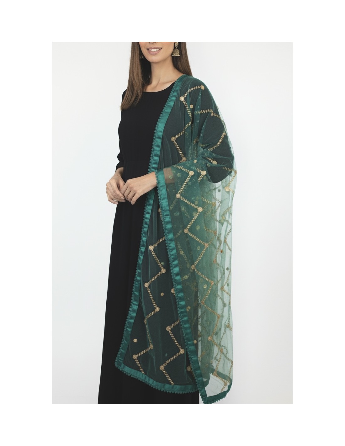 Sublimez toutes vos tenues avec cette élégante dupatta indienne vert turquoise et sequins dorée, confectionnée dans un voile léger en tulle transparent.