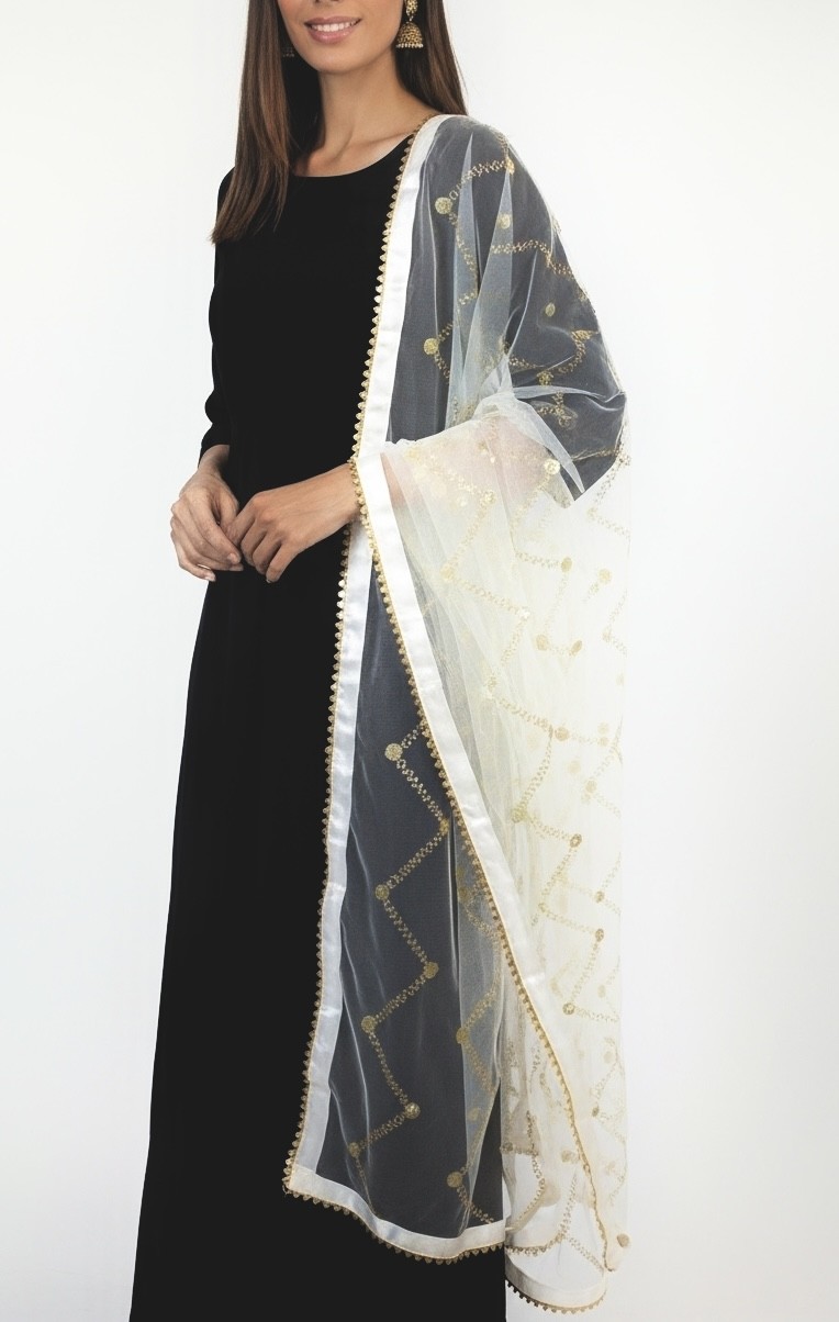 Sublimez toutes vos tenues avec cette élégante dupatta indienne blanche et sequins dorée, confectionnée dans un voile léger en tulle transparent.