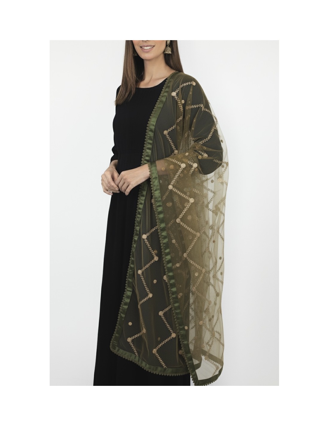 Sublimez toutes vos tenues avec cette élégante dupatta indienne vert kaki et sequins dorée, confectionnée dans un voile léger en tulle transparente.