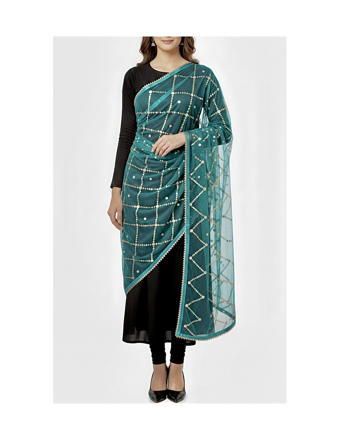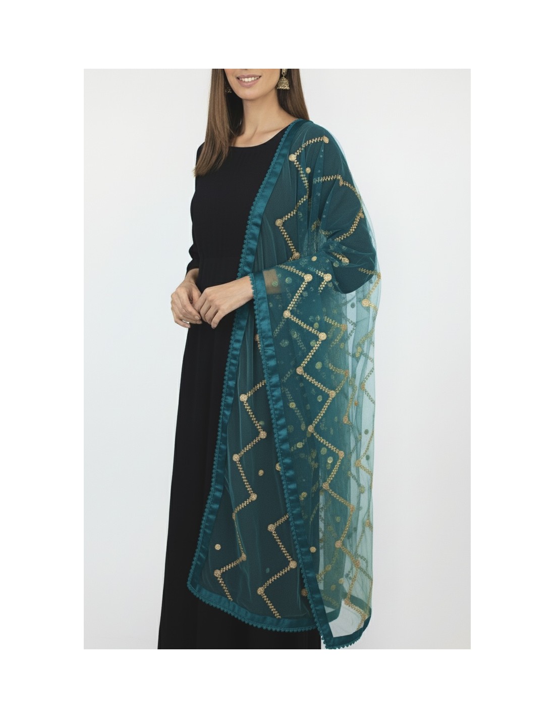 Sublimez toutes vos tenues avec cette élégante dupatta indienne bleu/vert et sequins dorée, confectionnée dans un voile léger en tulle transparent.