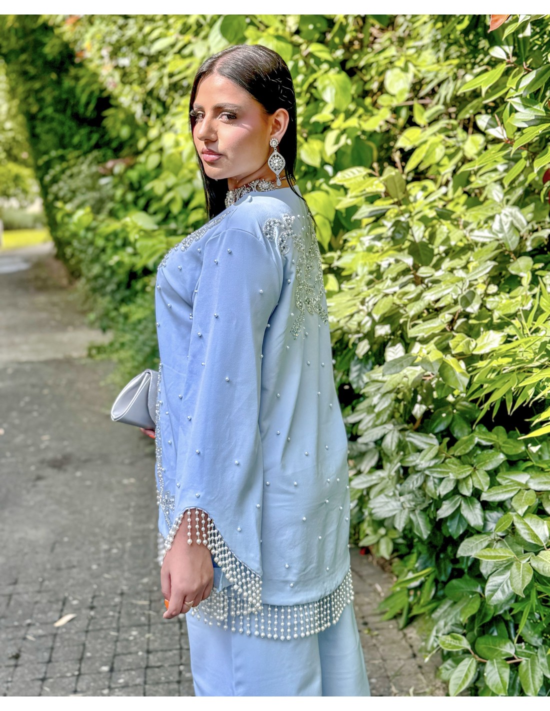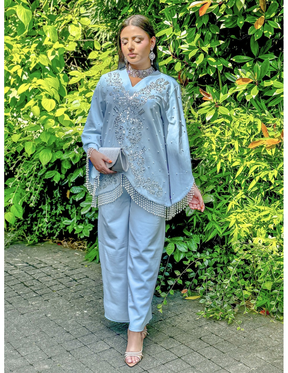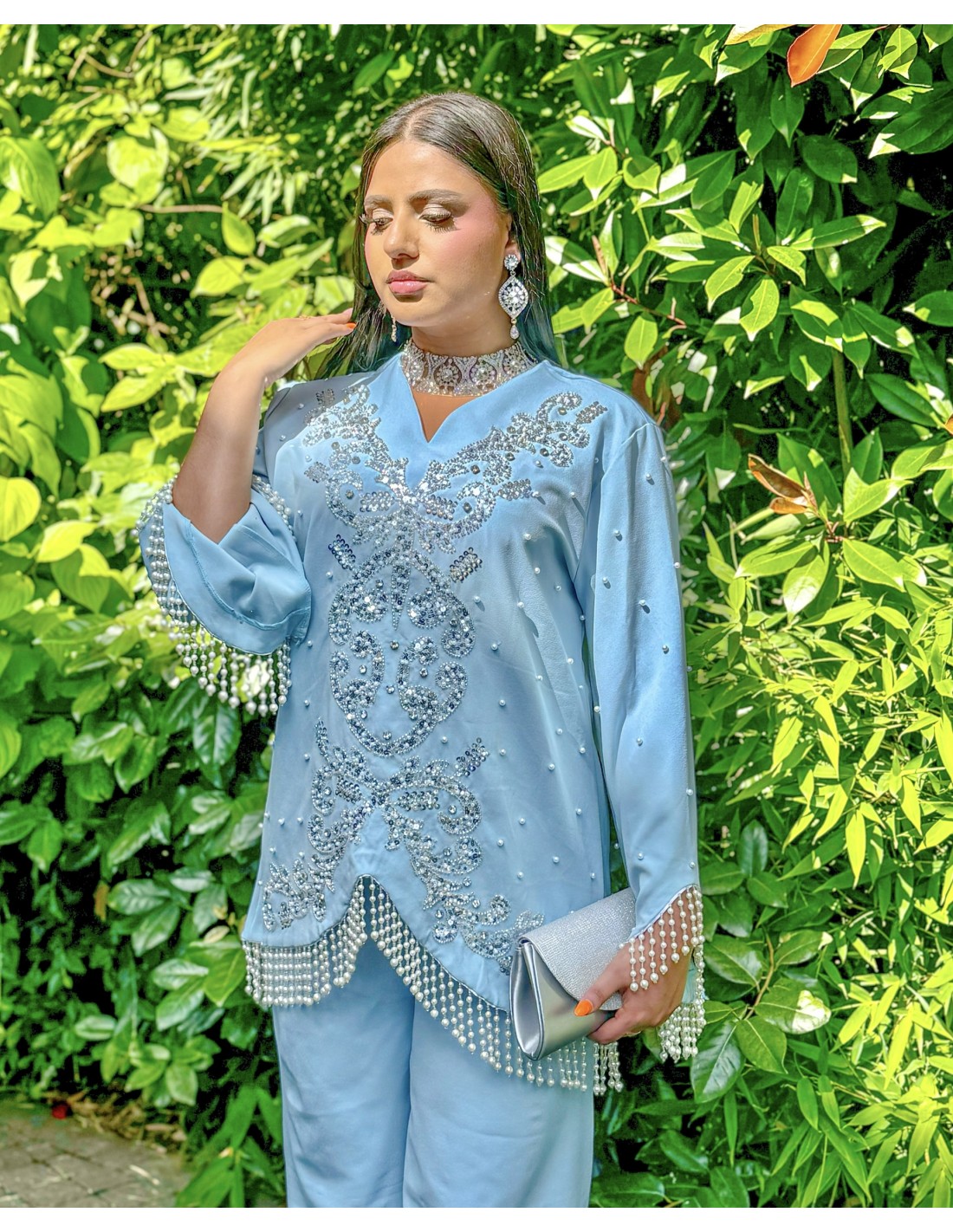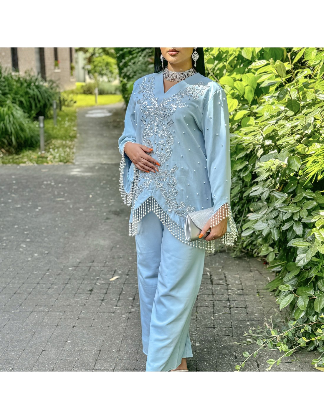 ensemble soirée oriental avec pantalon , décoré de strass argenté, et sublimé de petites perles.
