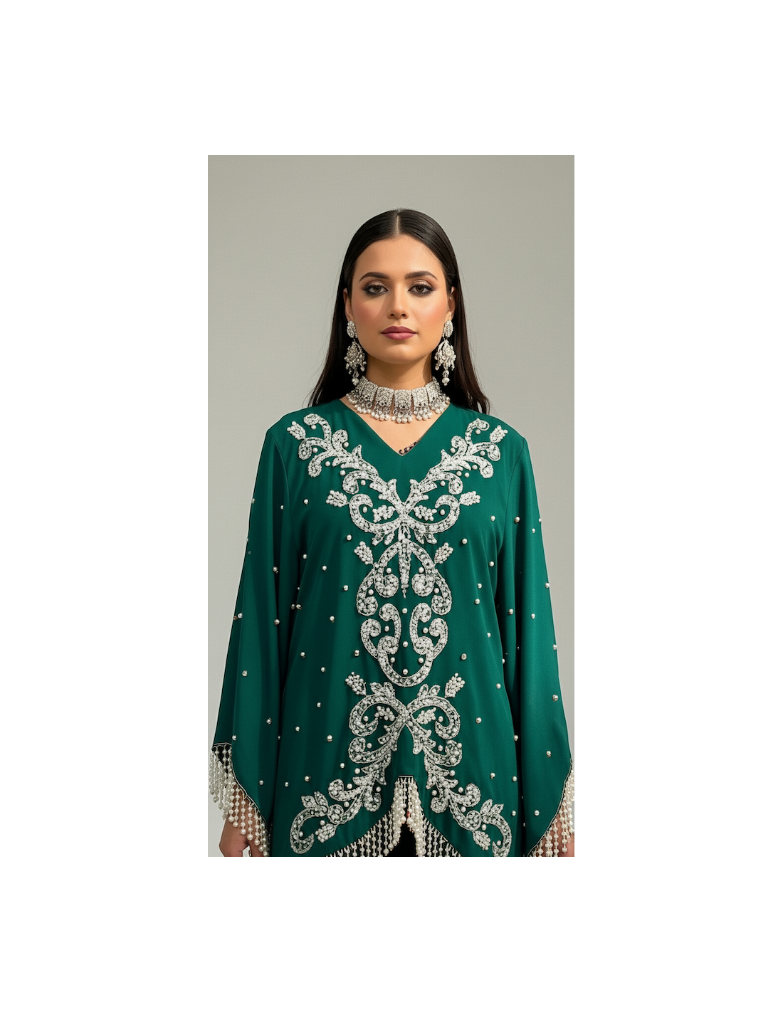 manches longues, et cousus de perles et strass argenté