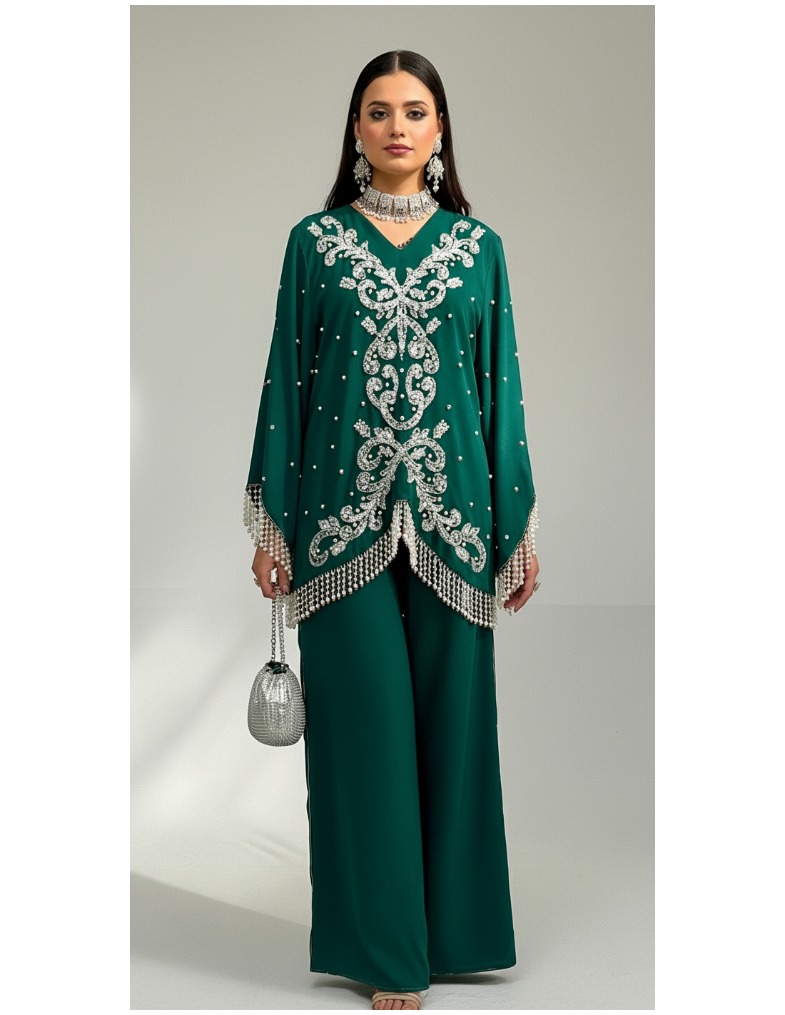 ensemble soirée oriental avec pantalon , décoré de strass argenté, et sublimé de petites perles.