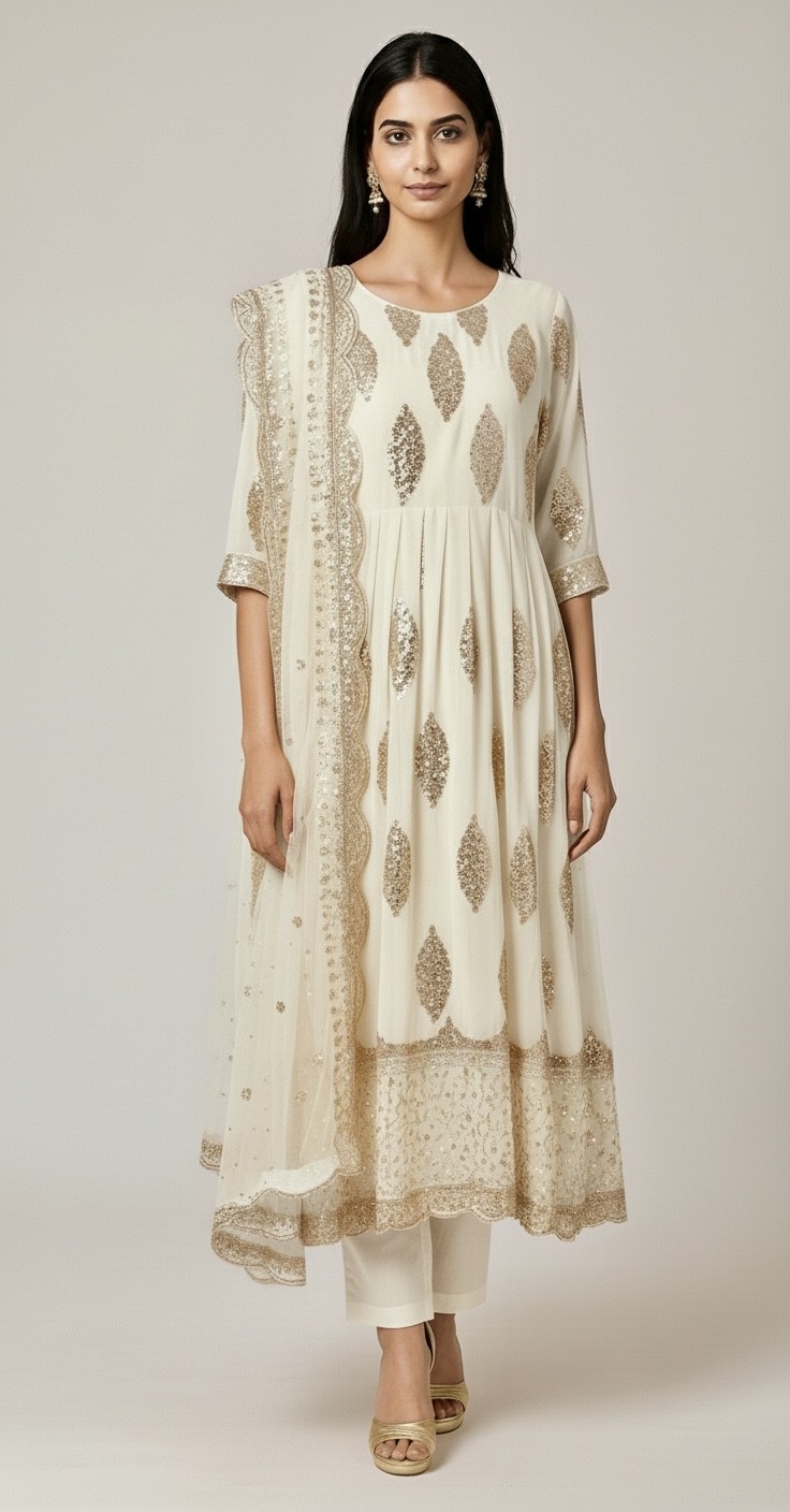 Ensemble Anarkali blanc cassé rehaussé de broderies sequins dorées