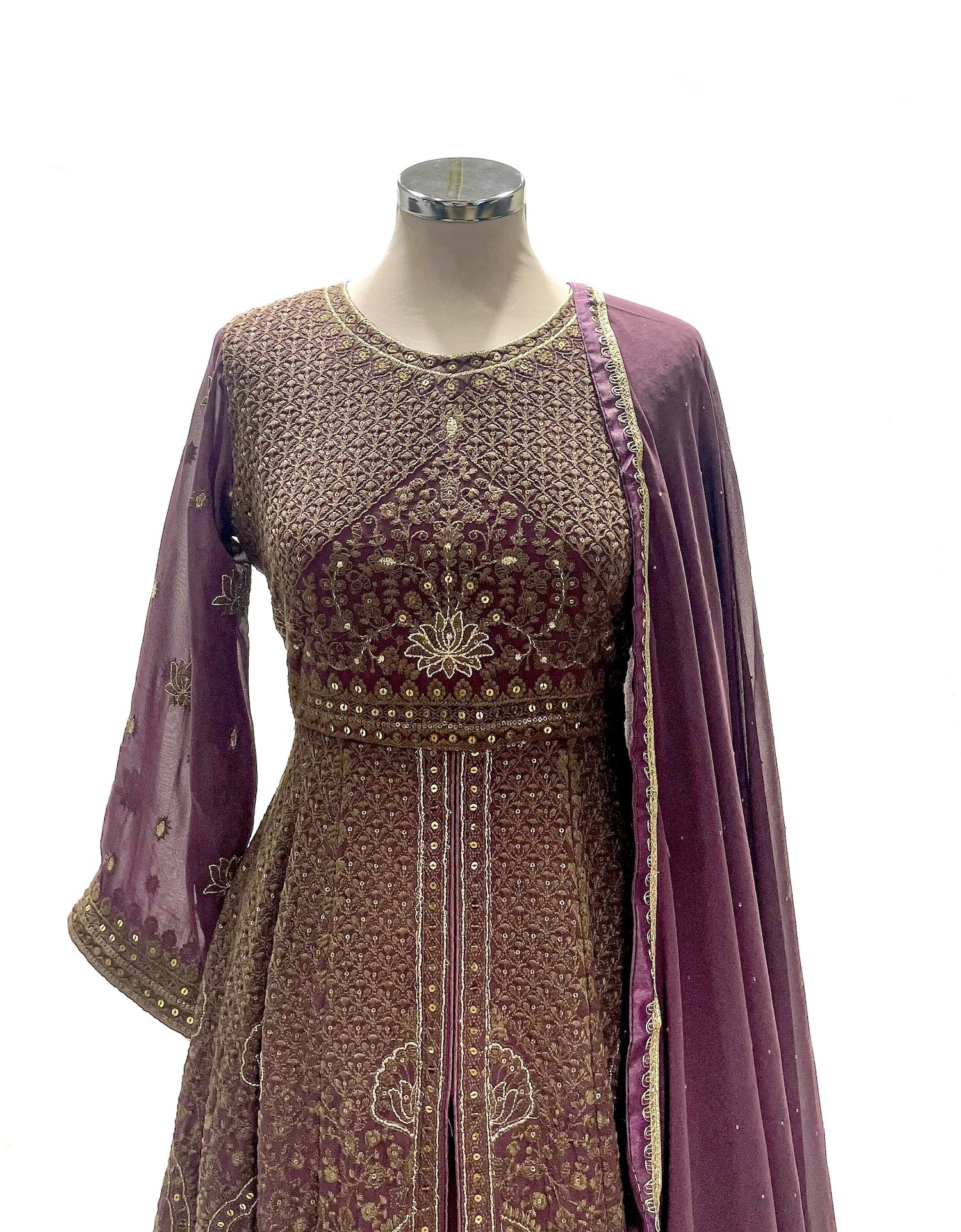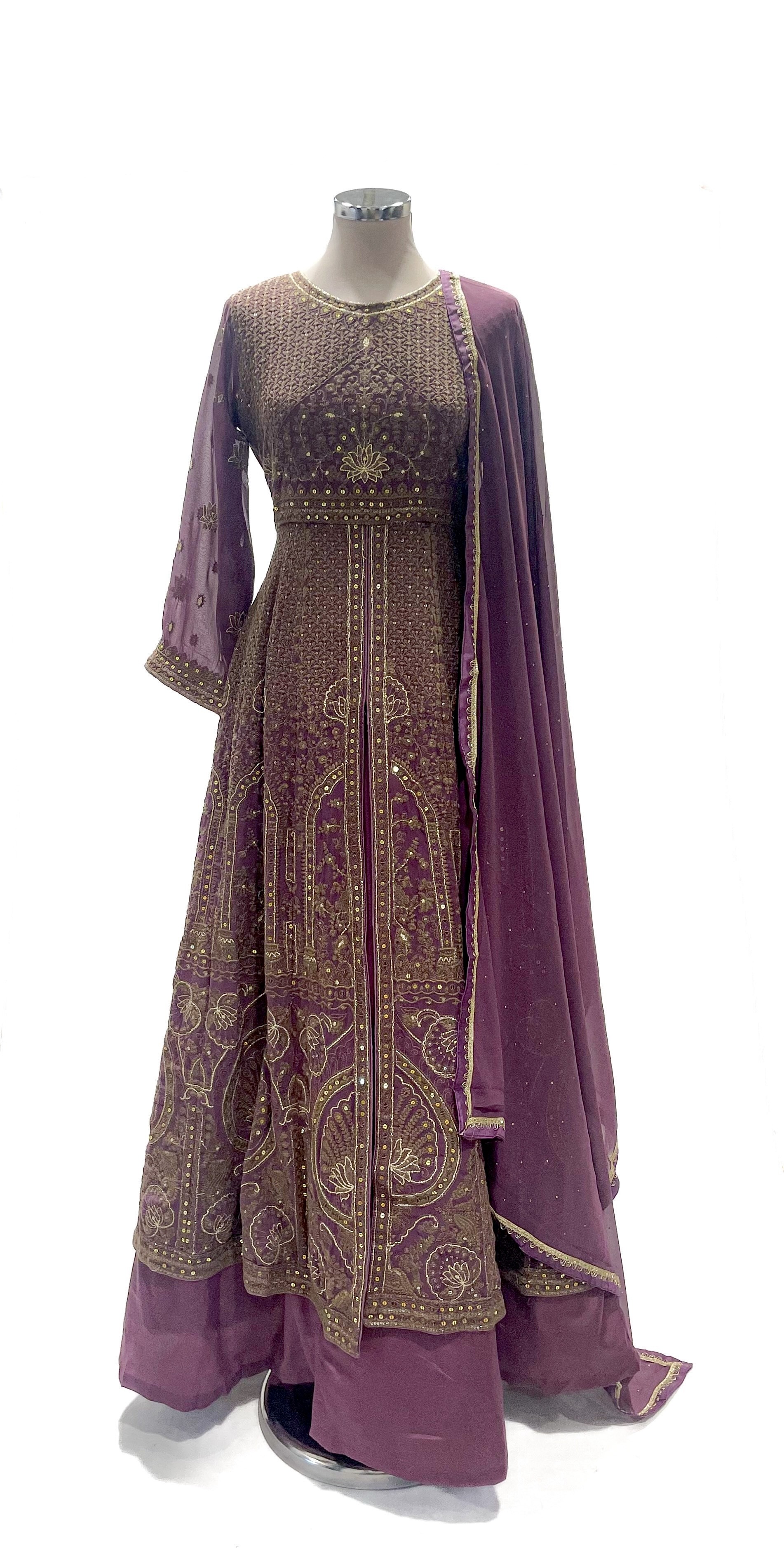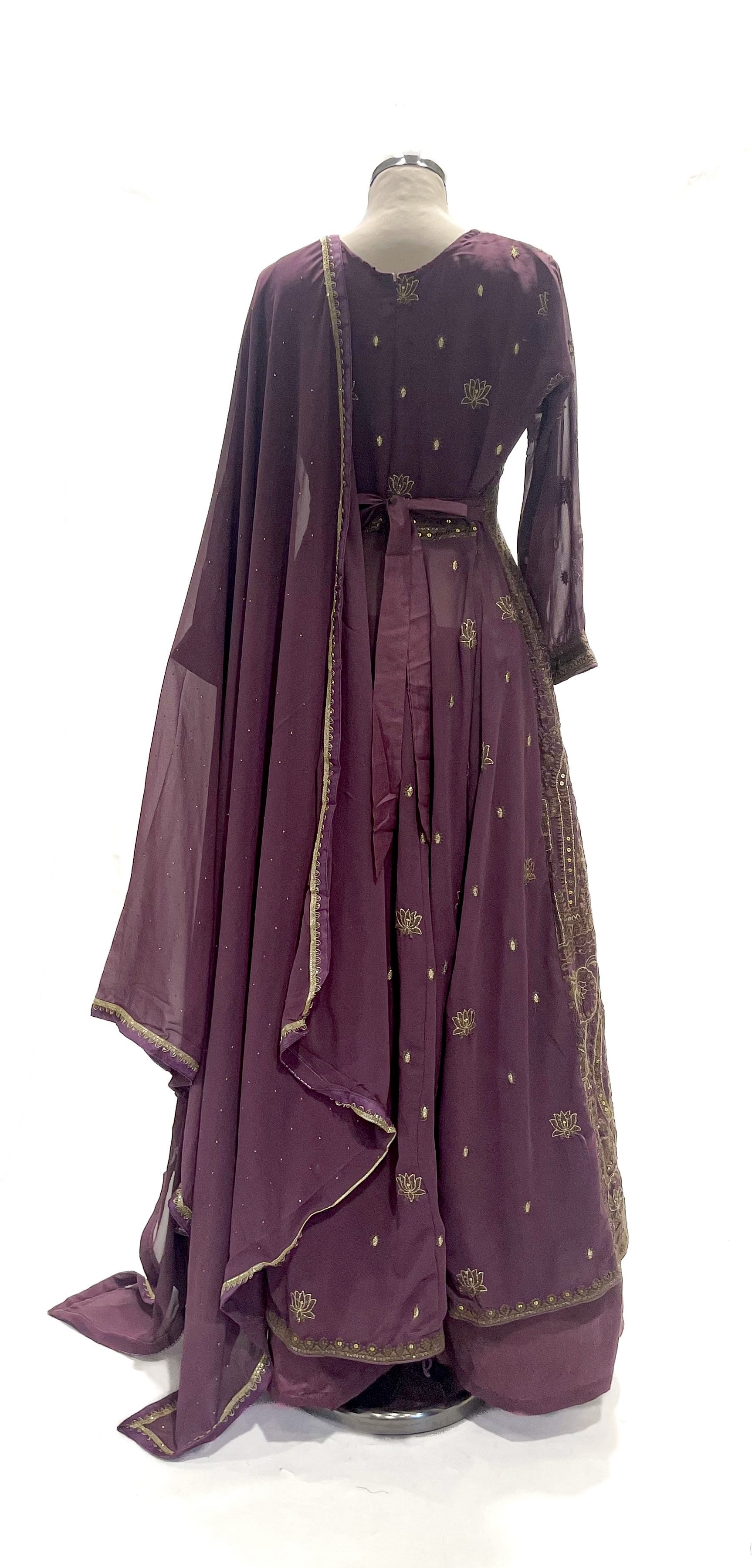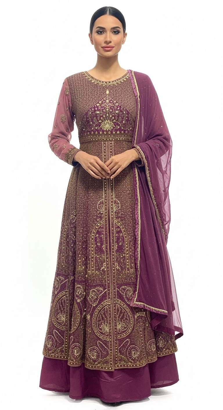 Découvrez cette somptueuse tenue indo-pakistanaise au style Anarkali longue et évasée, richement brodée avec des motifs traditionnels et des finitions élégantes.