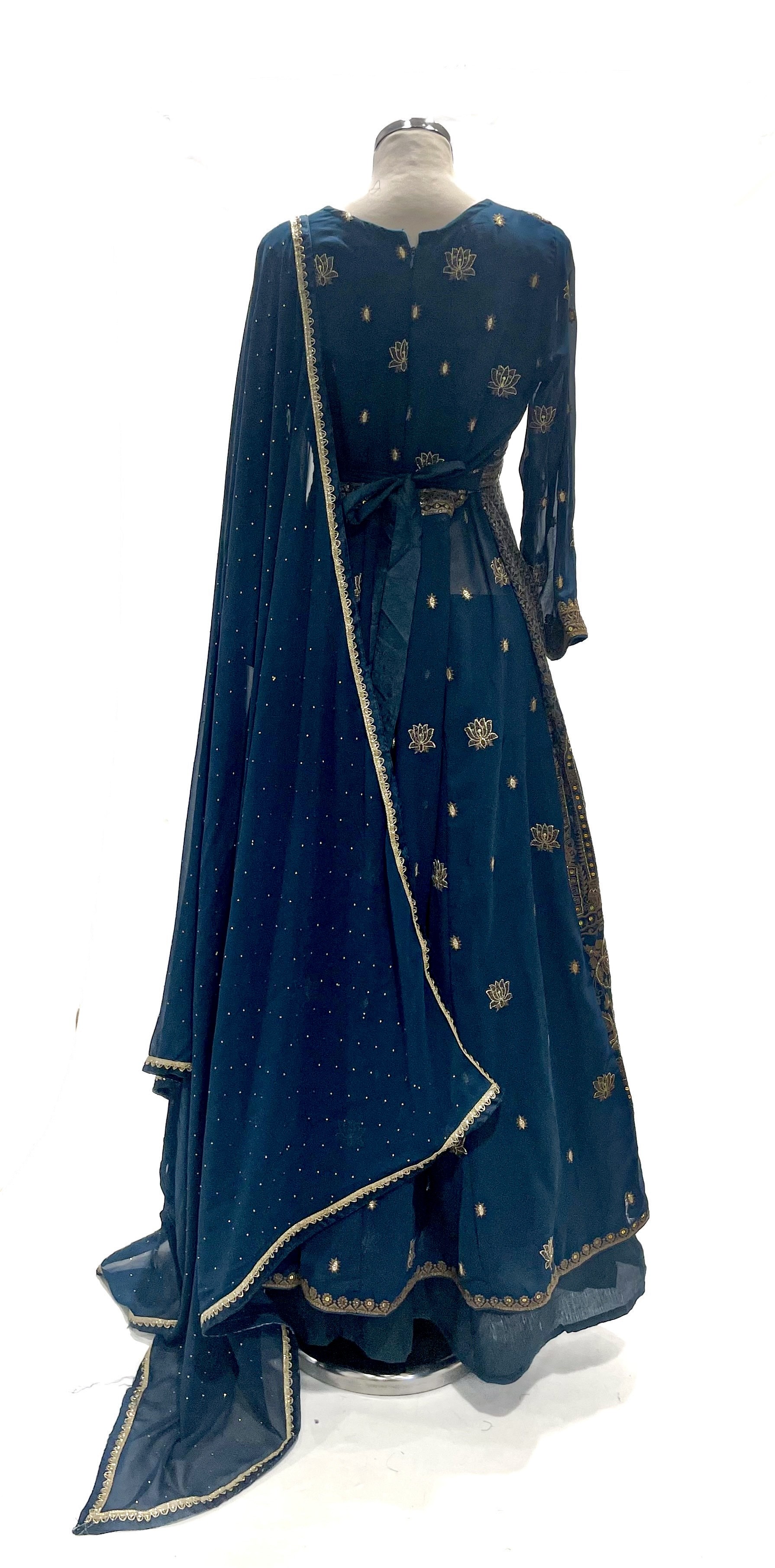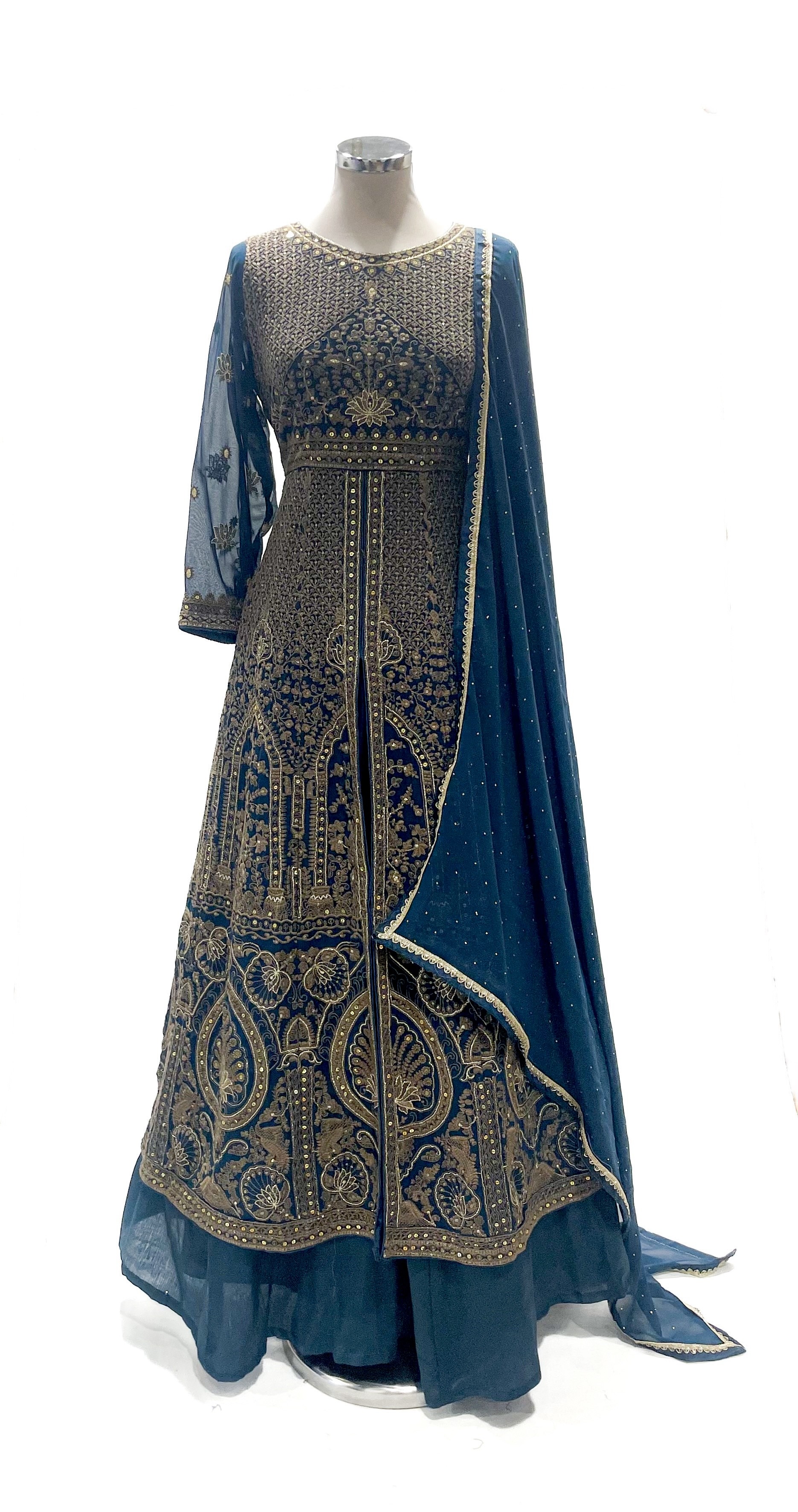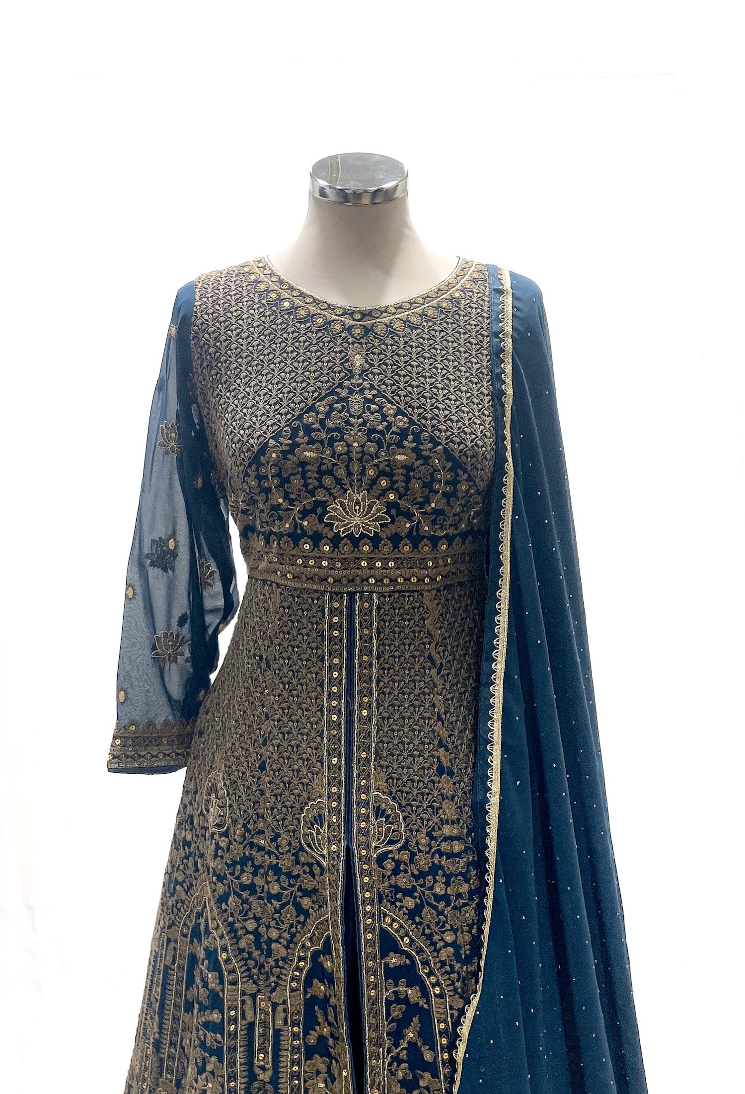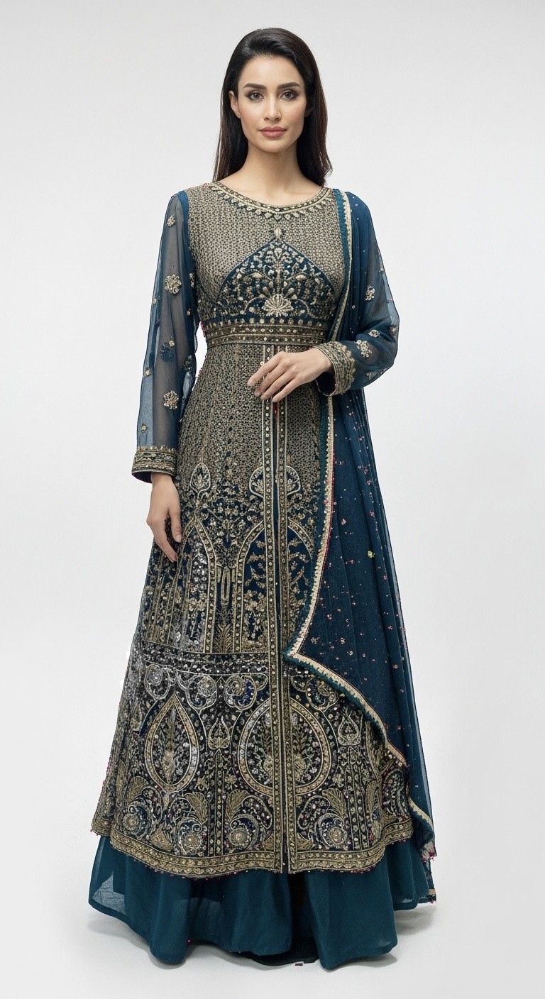 Découvrez cette somptueuse tenue indo-pakistanaise au style Anarkali longue et évasée, richement brodée avec des motifs traditionnels et des finitions élégantes.