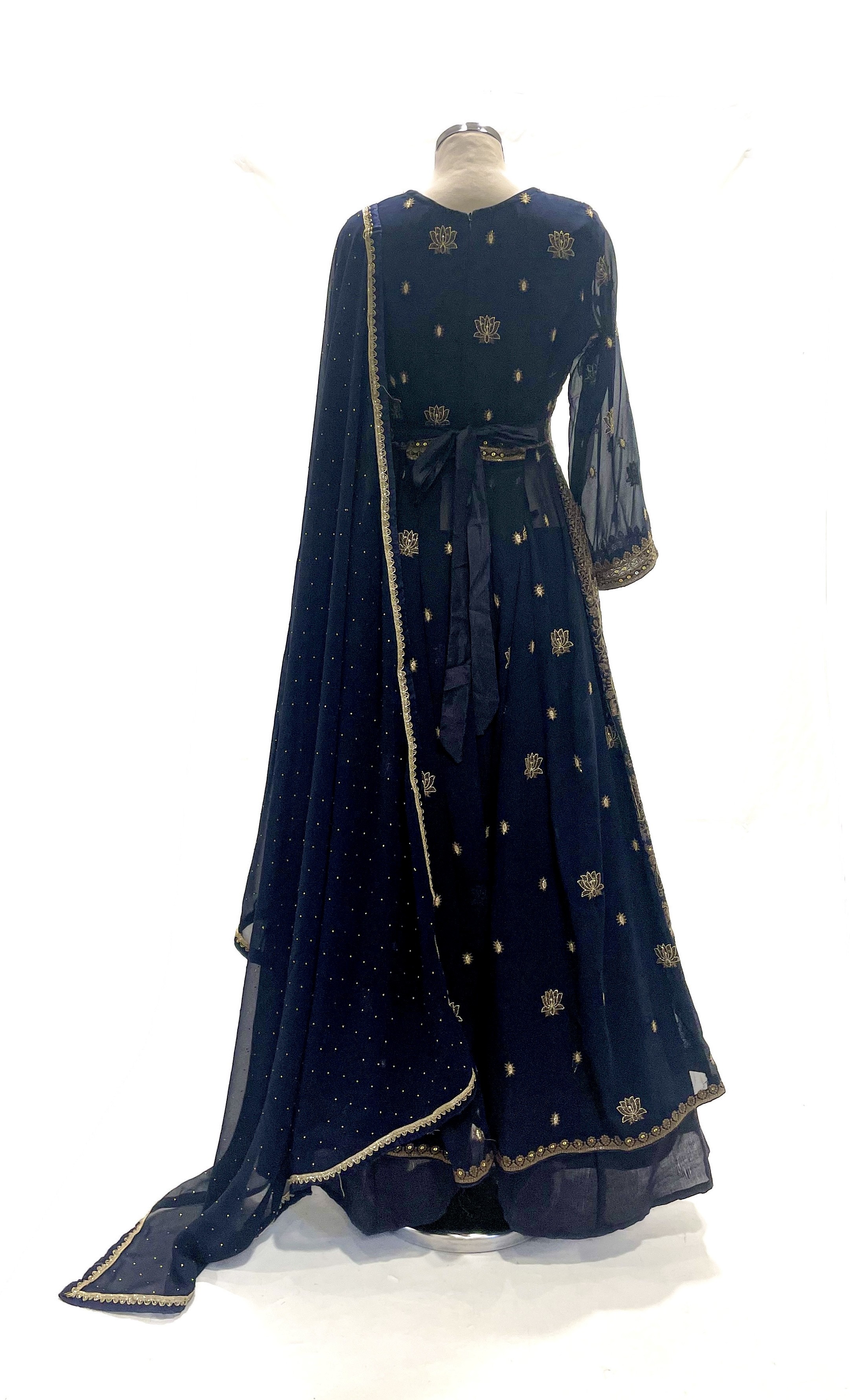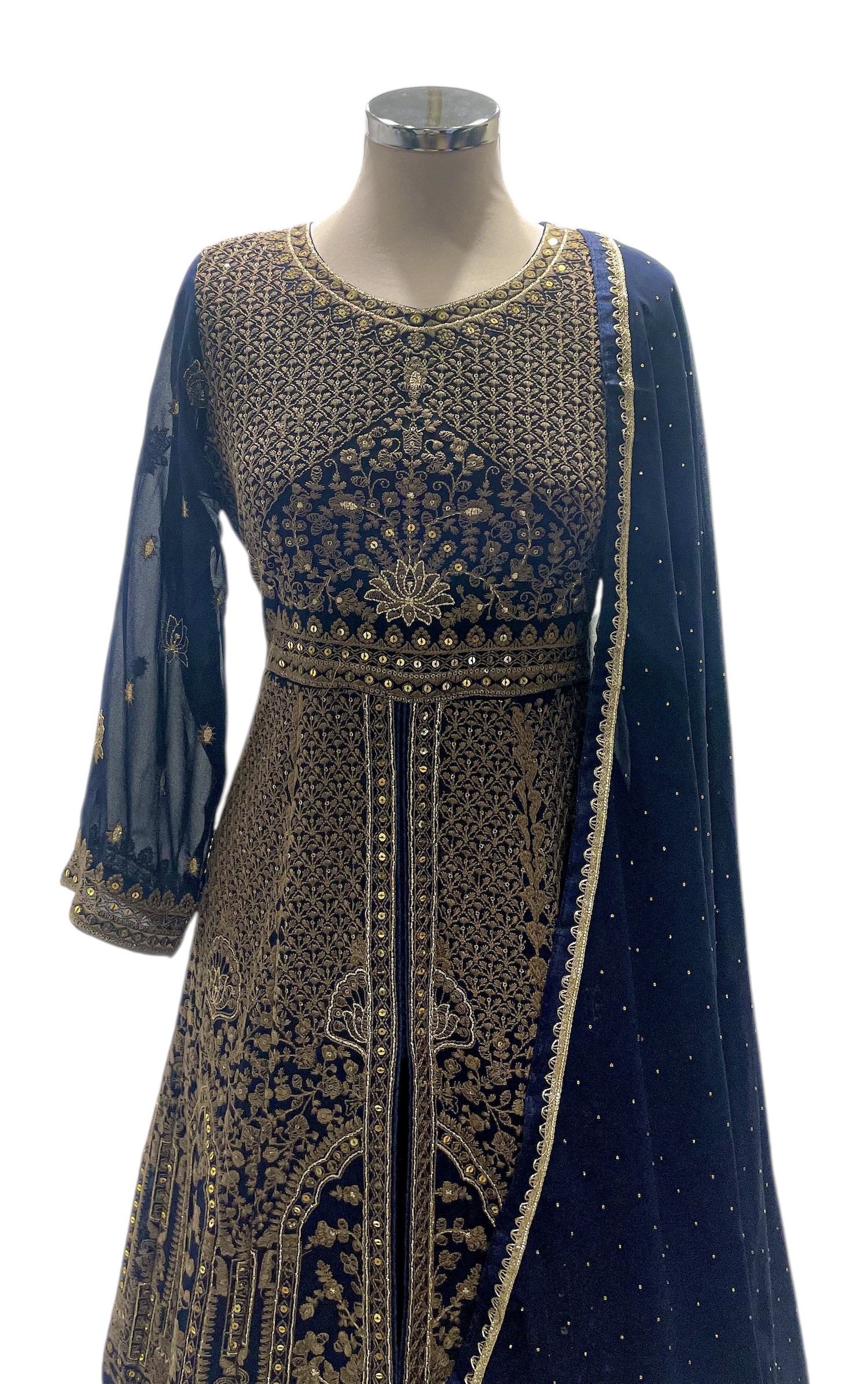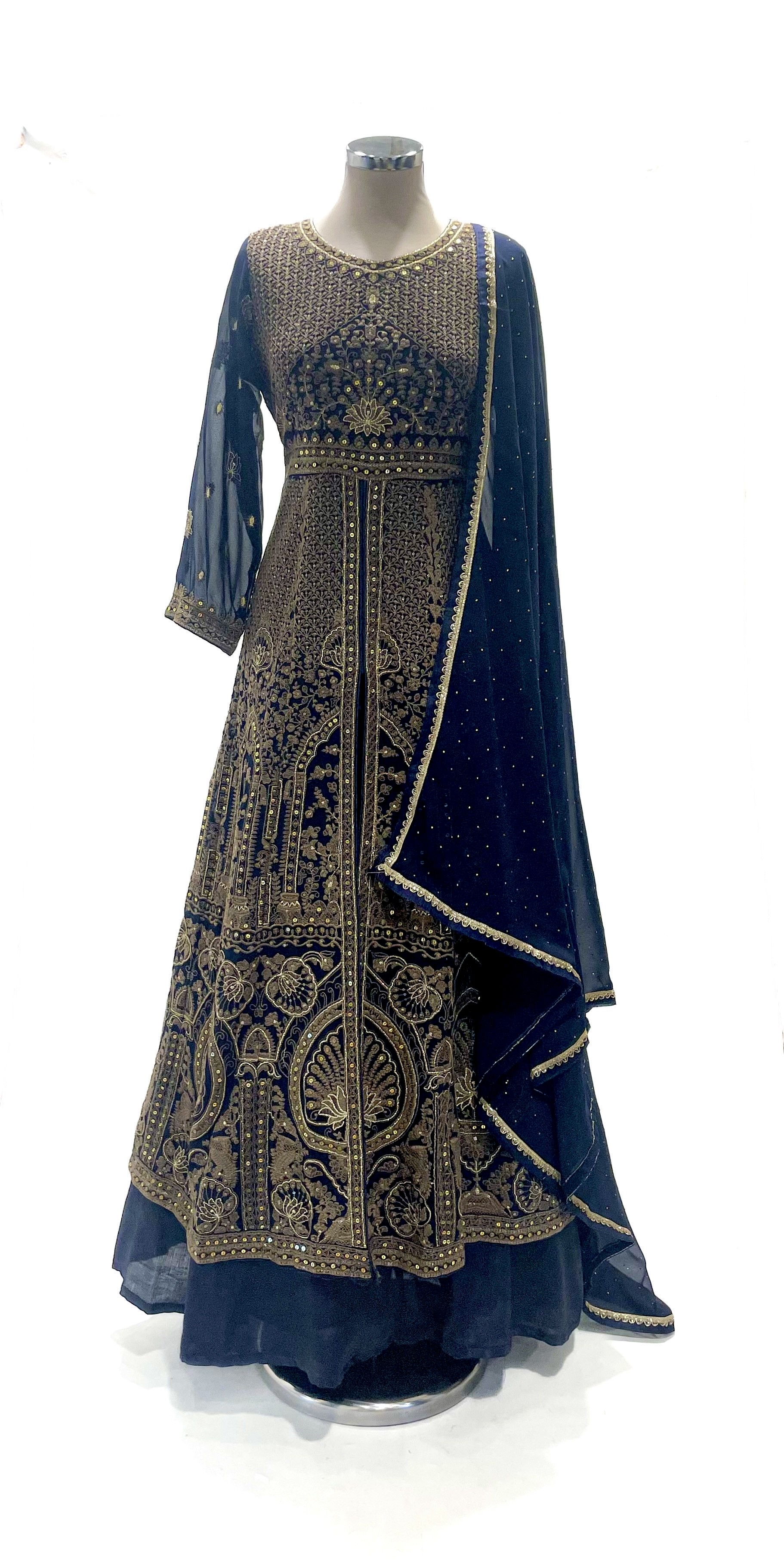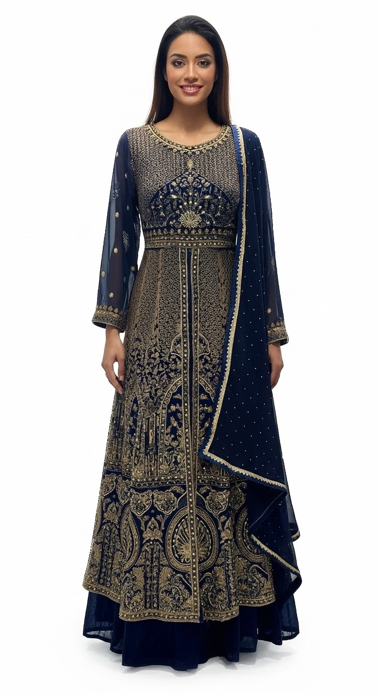 Découvrez cette somptueuse tenue indo-pakistanaise au style Anarkali longue et évasée, richement brodée avec des motifs traditionnels et des finitions élégantes.